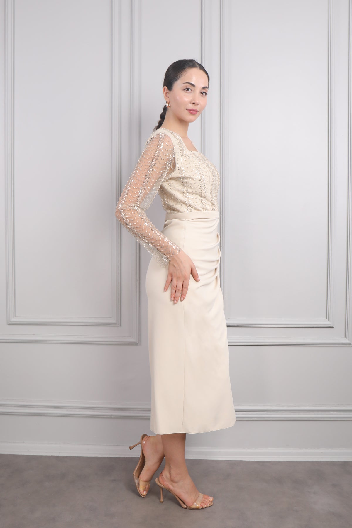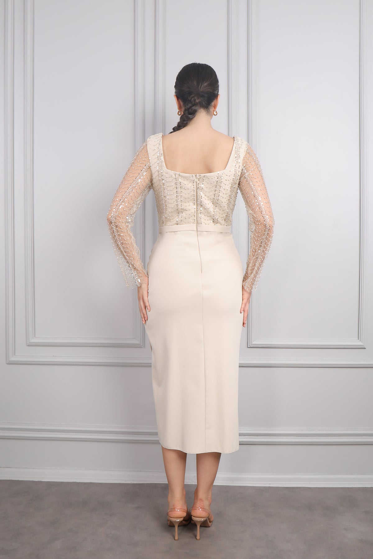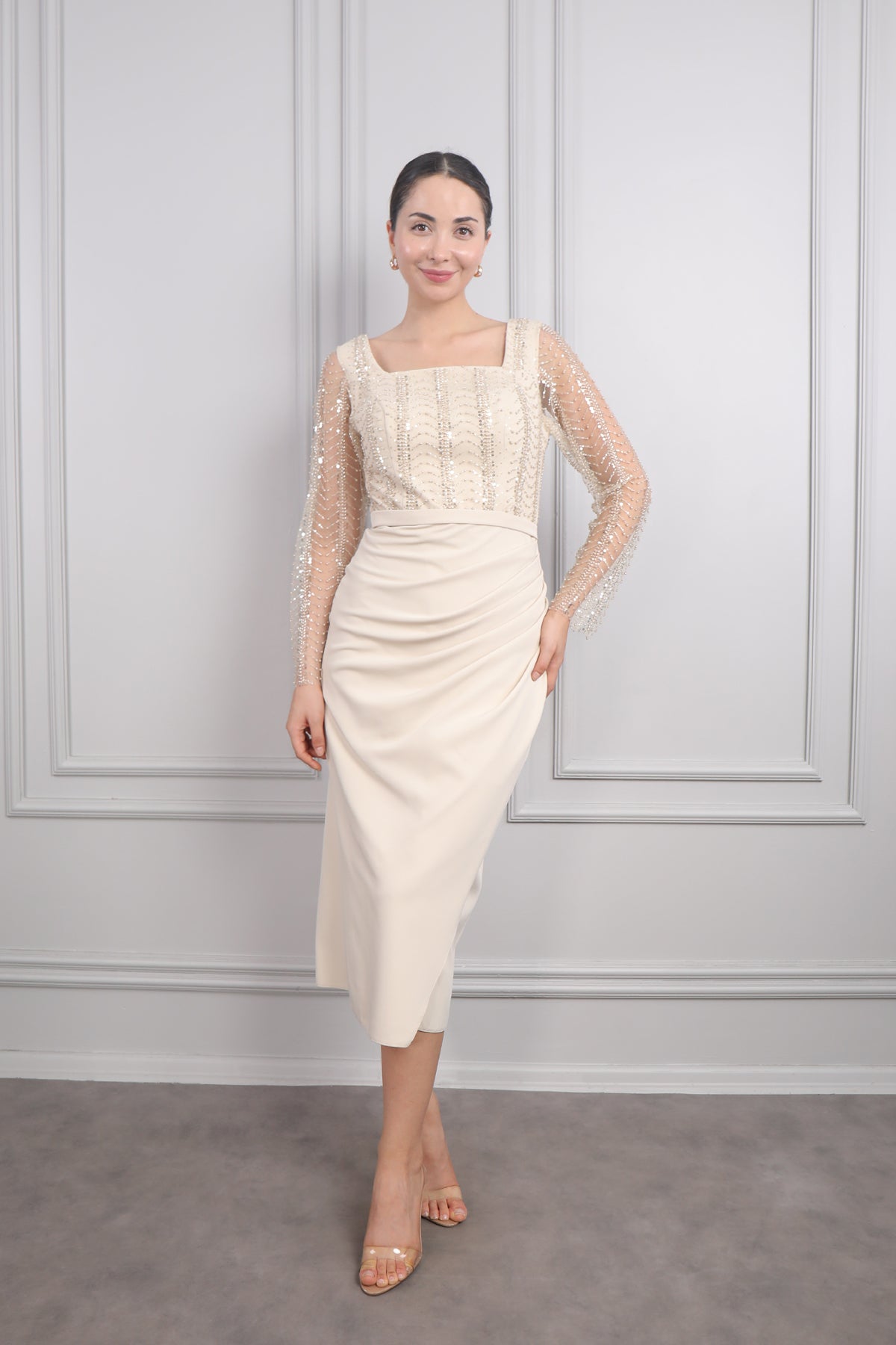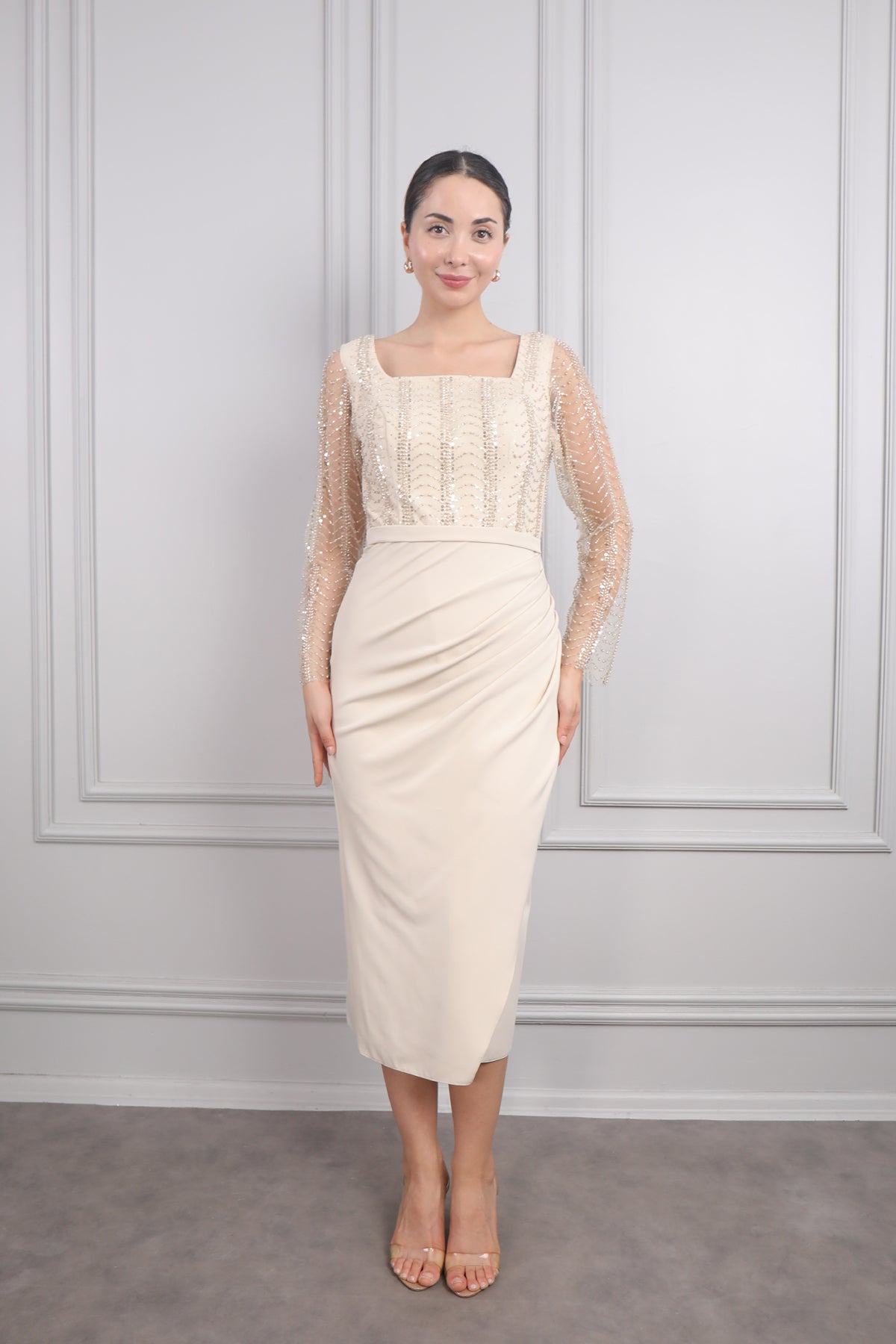 Kare Yaka Boncuk İşlemeli Drapeli Midi Boy Büyük Beden Abiye Gold Özellikleri