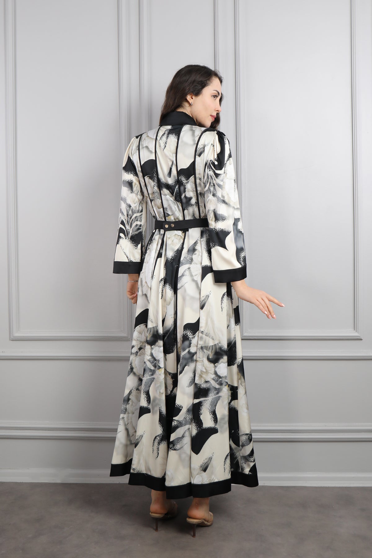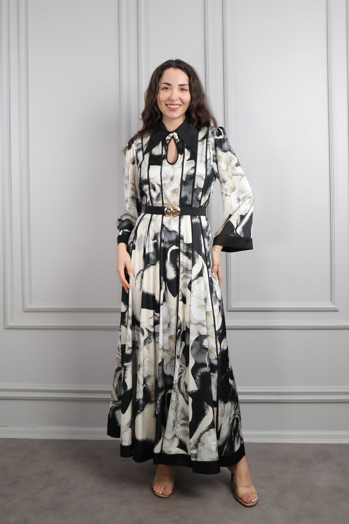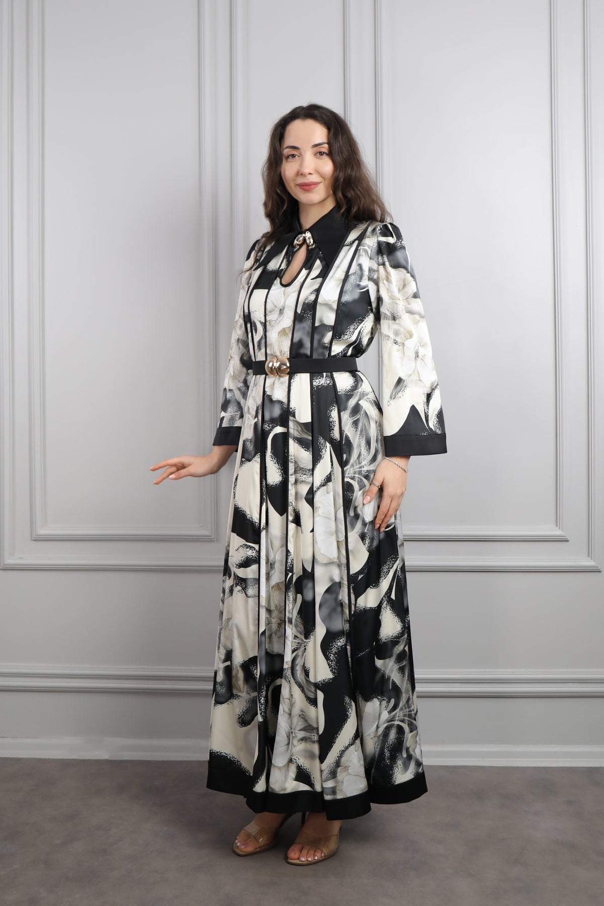 Gömlek Yaka Beli Kemerli Desenli Büyük Beden Saten Elbise Siyah Özellikleri