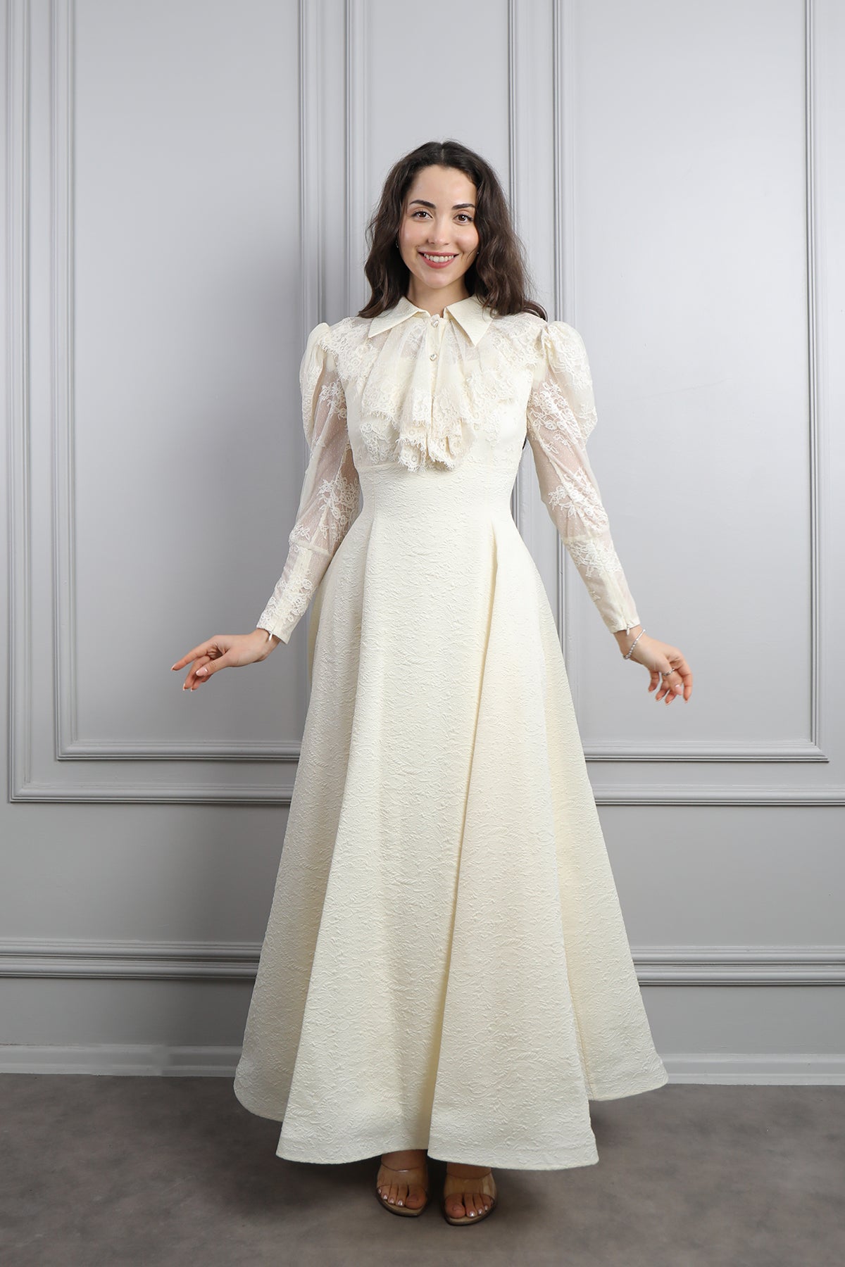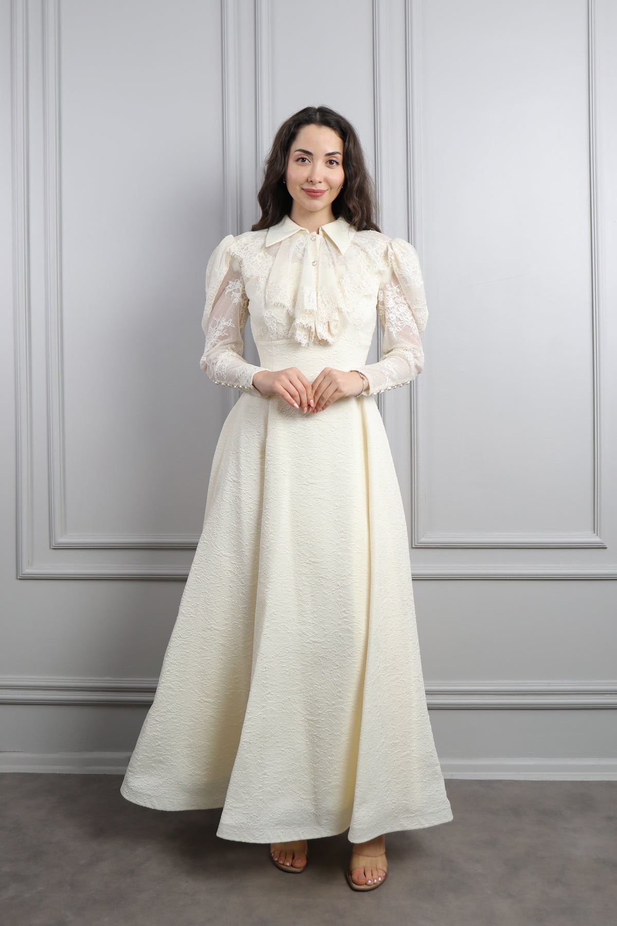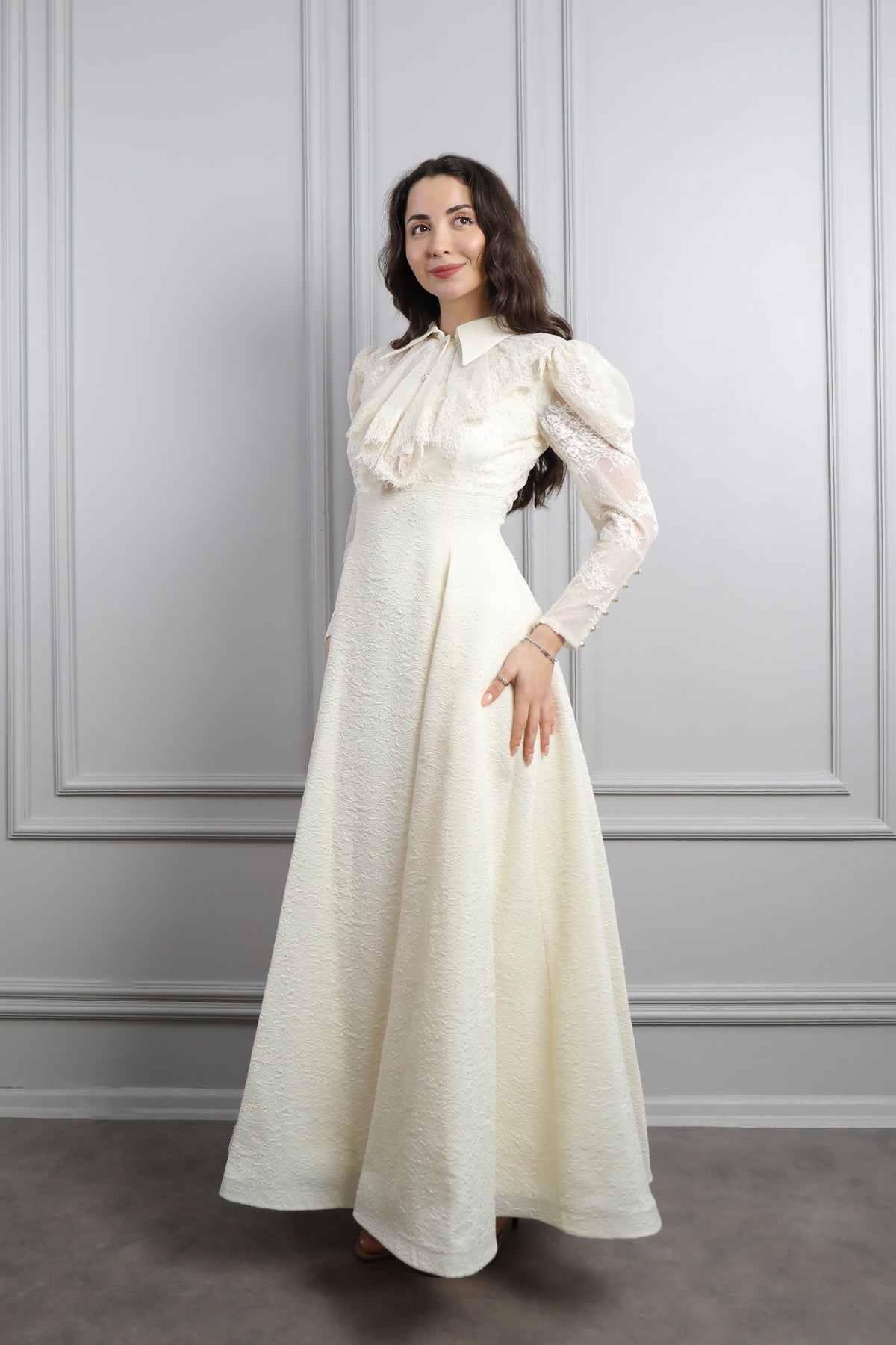 Gömlek Yaka Fırfır Detaylı Dantelli Elbise Ekru Özellikleri