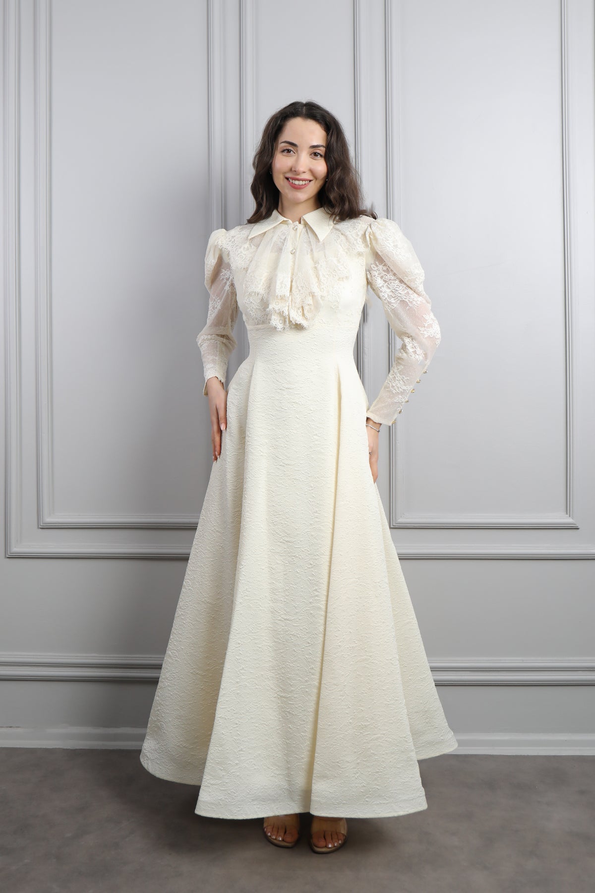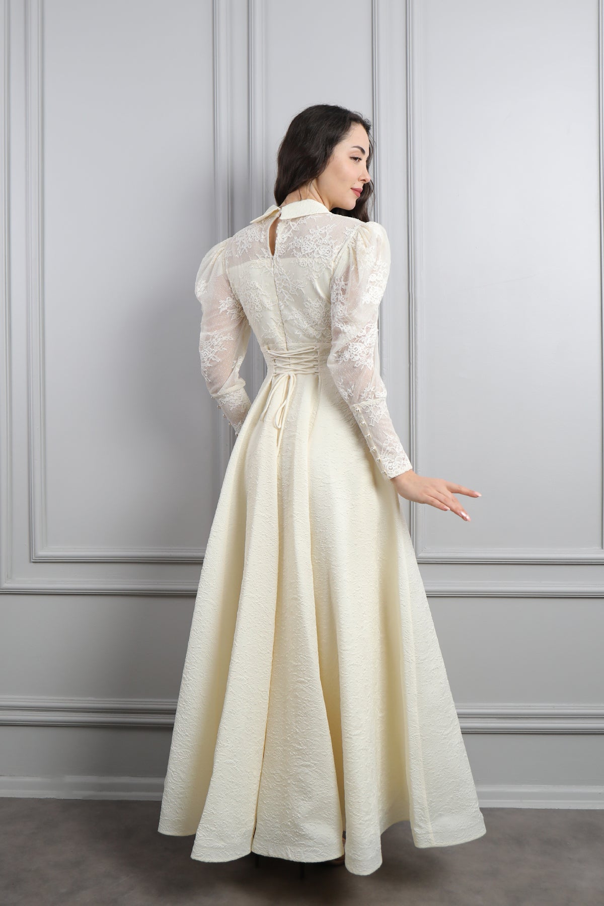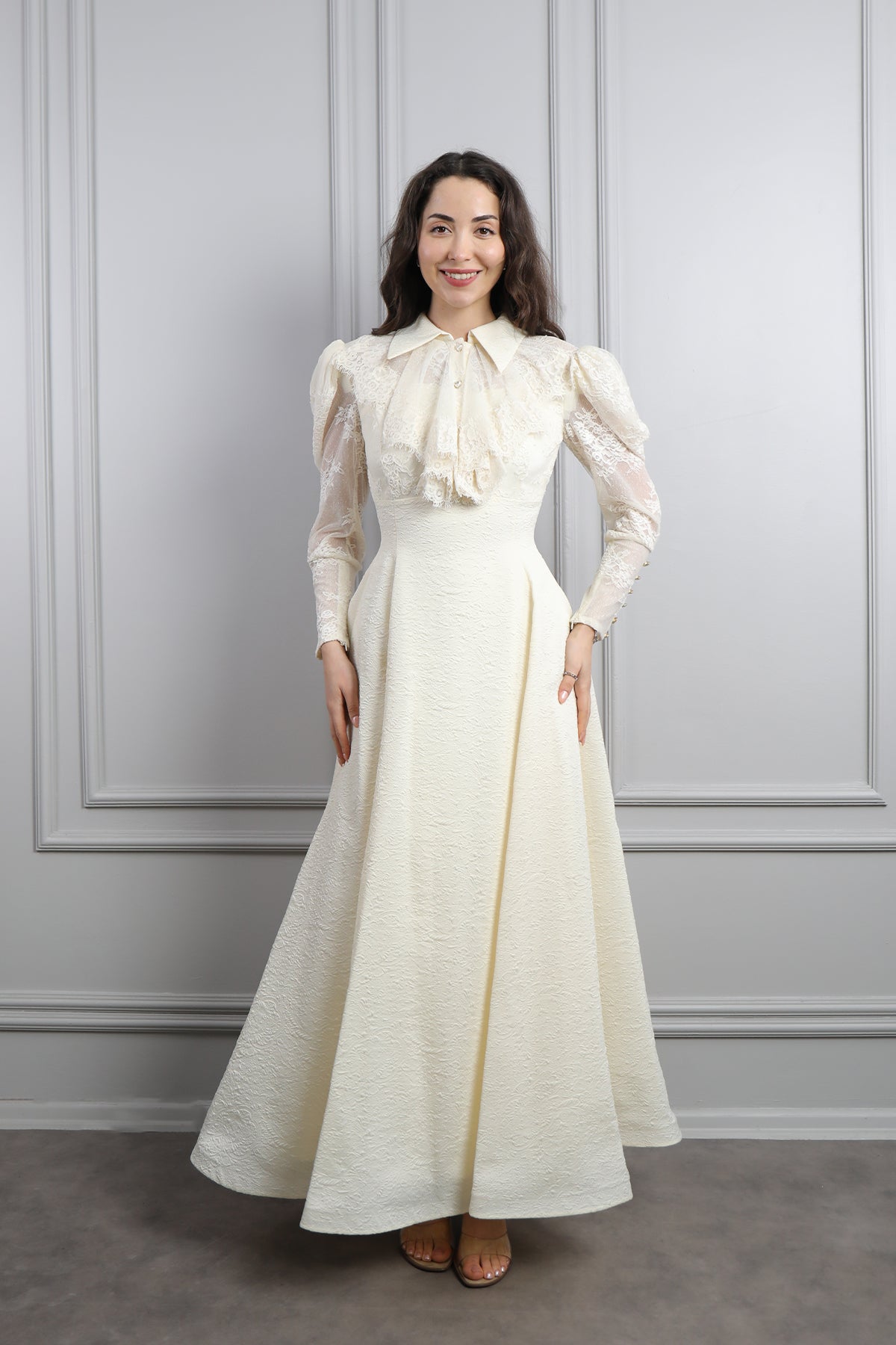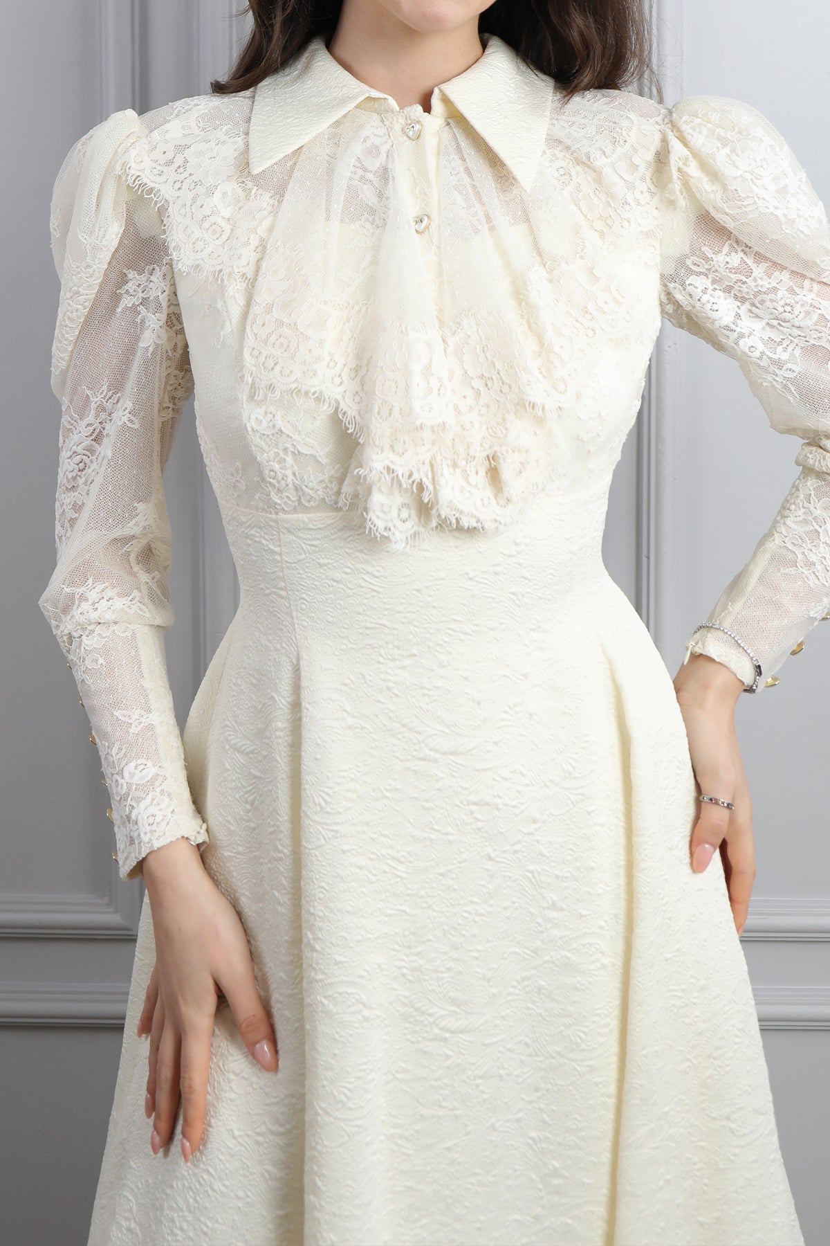 Gömlek Yaka Fırfır Detaylı Dantelli Elbise Ekru Özellikleri