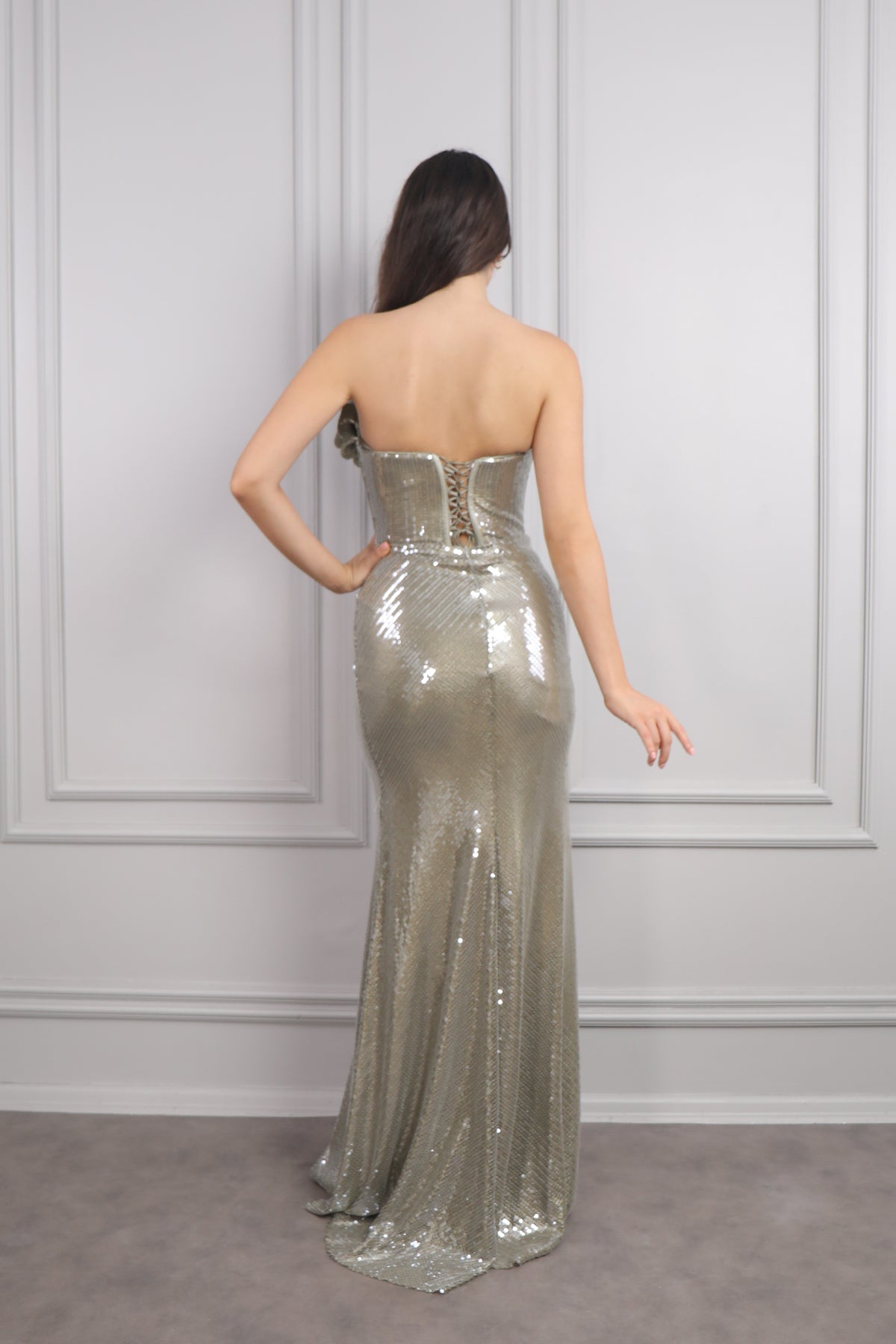 Straplez Çiçek Detaylı Payetli Abiye Haki