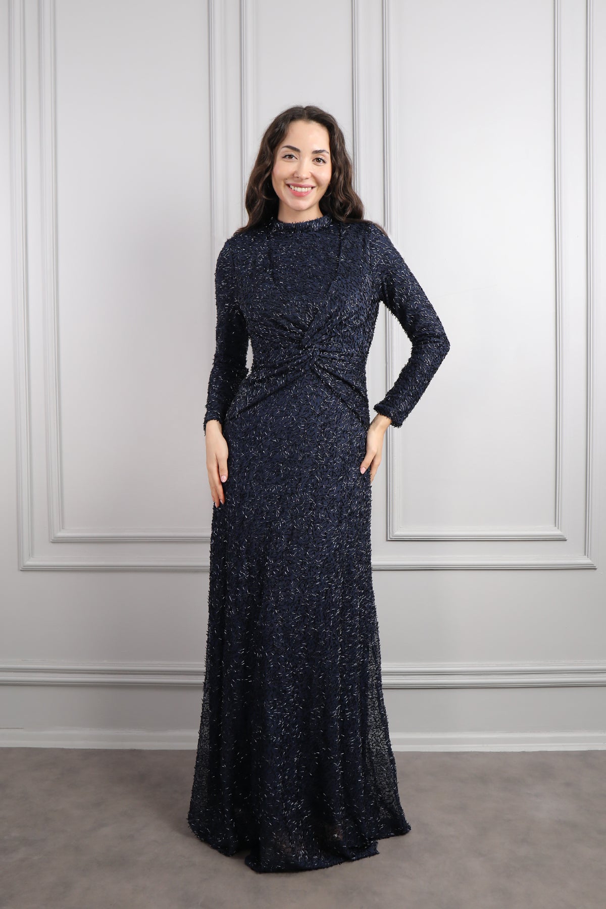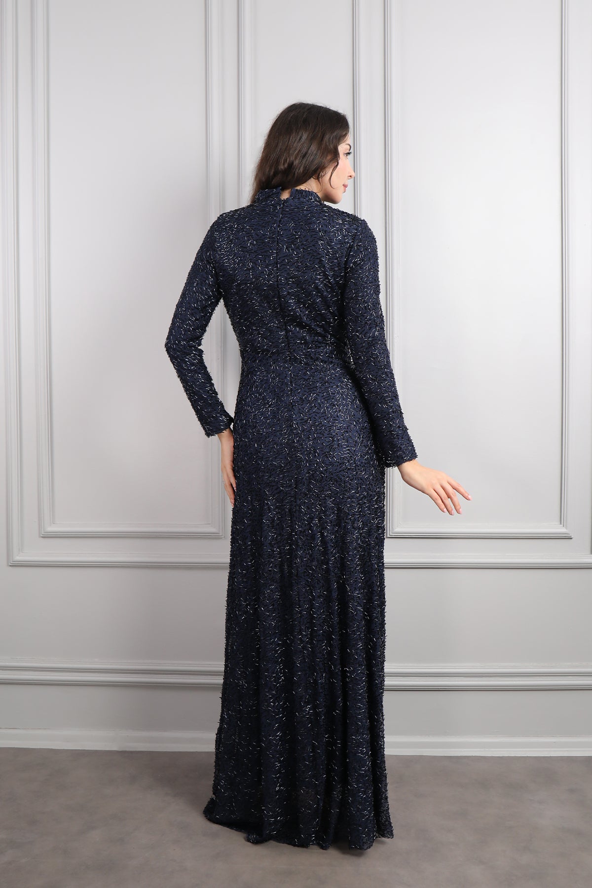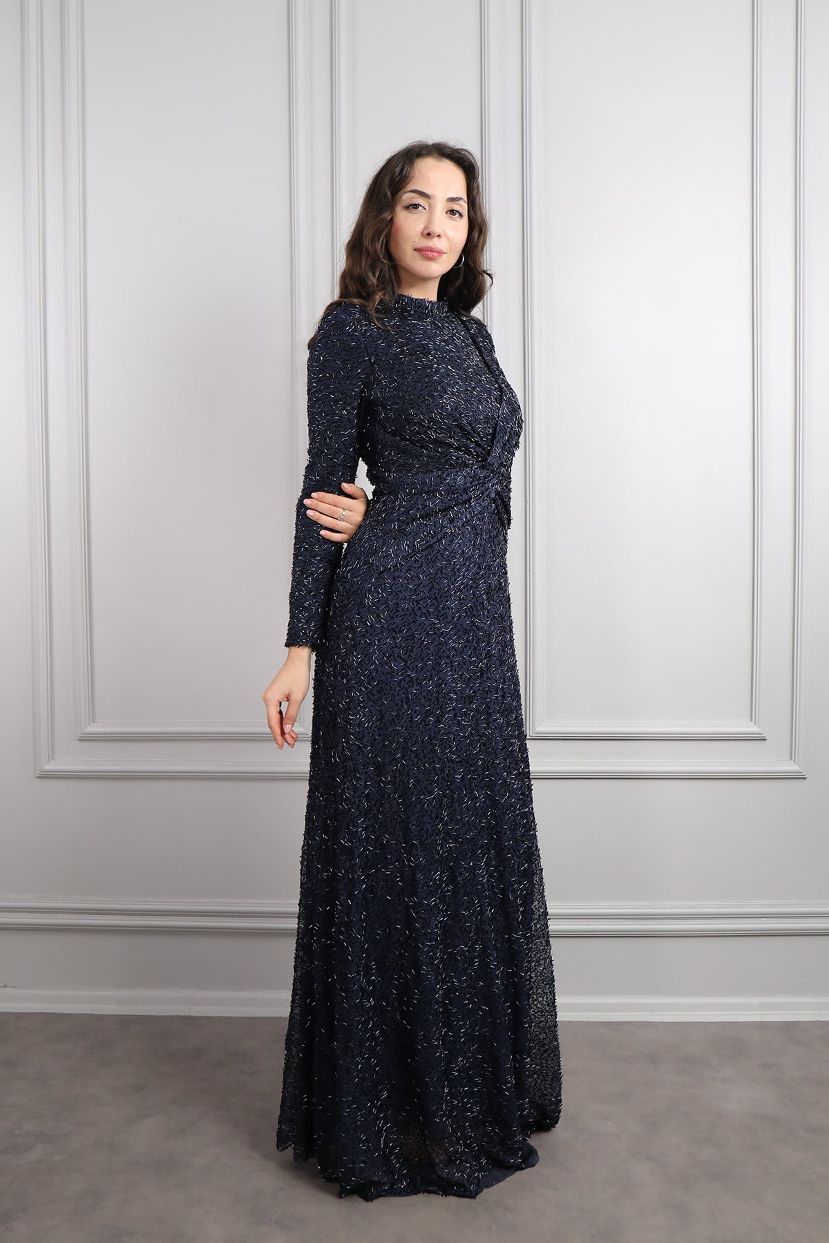 Hakim Yaka Beli Düğüm Detaylı Boncuk İşlemeli Tesettür Büyük Beden Abiye Lacivert