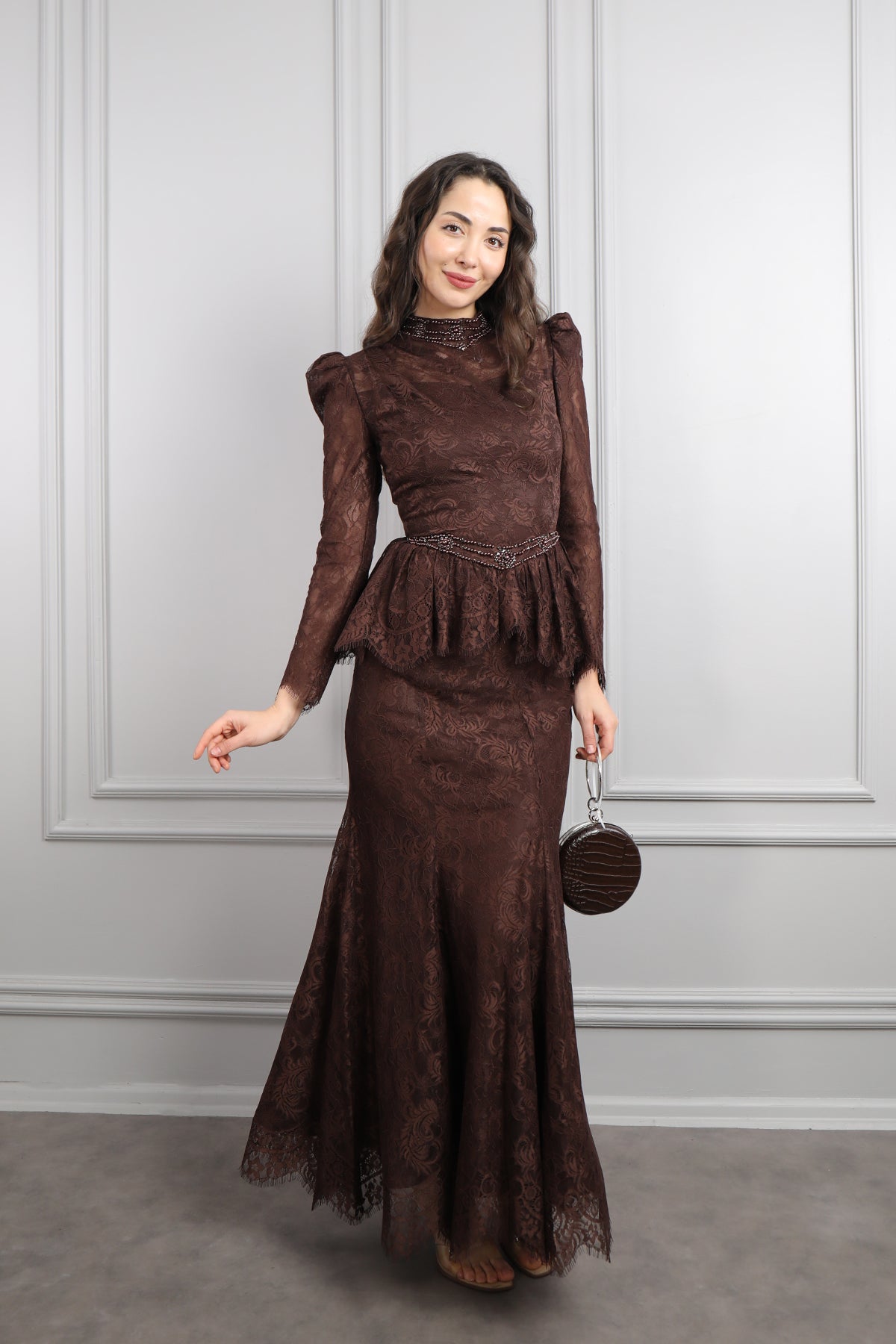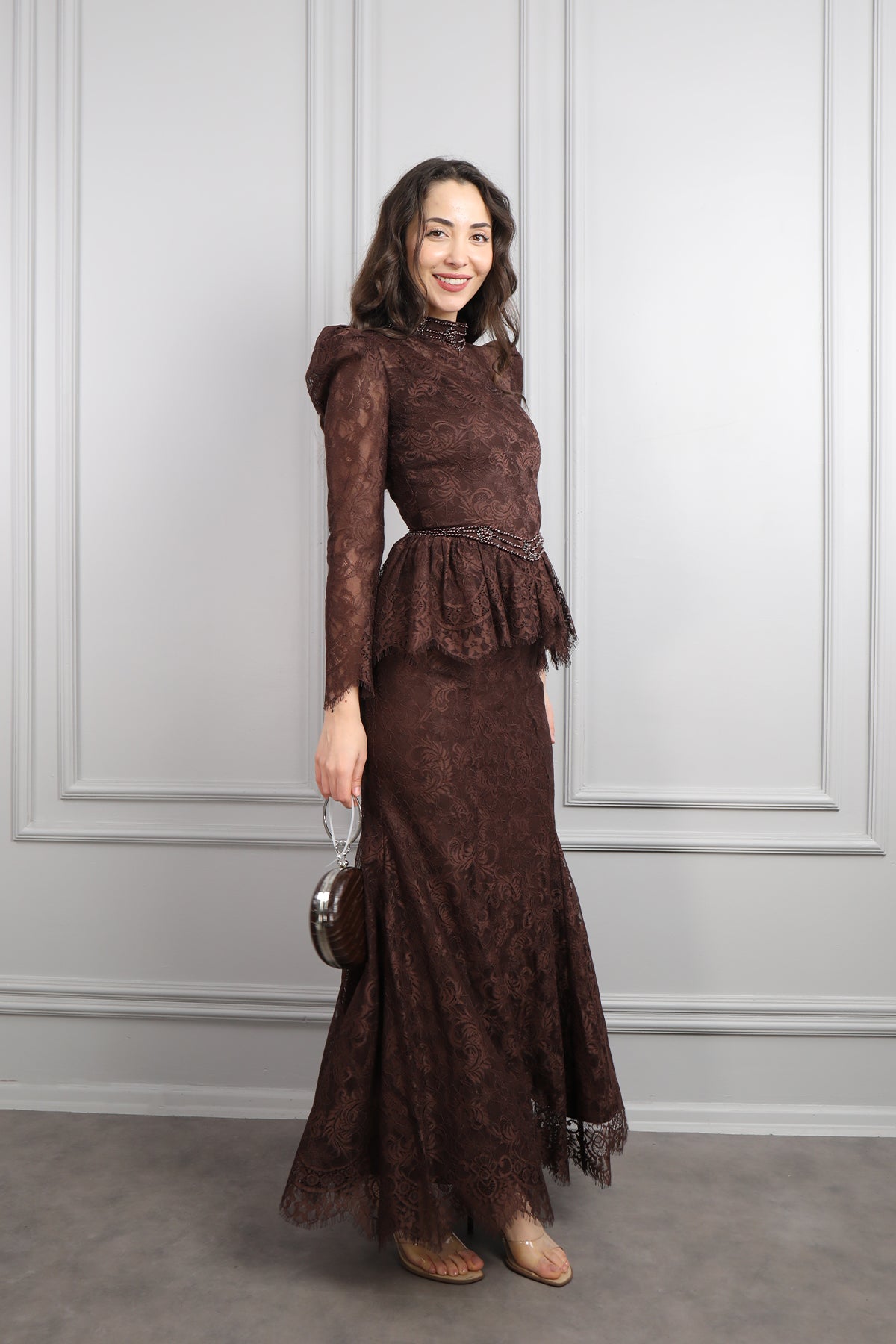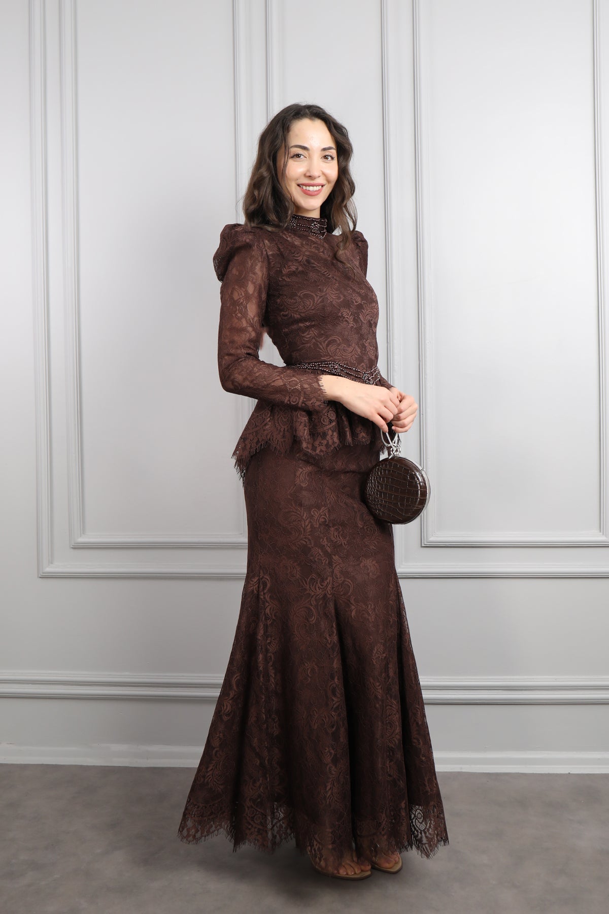 Hakim Yaka Boncuk İşlemeli Çanta Aksesuar Detaylı Dantelli Etek Takım Kahve