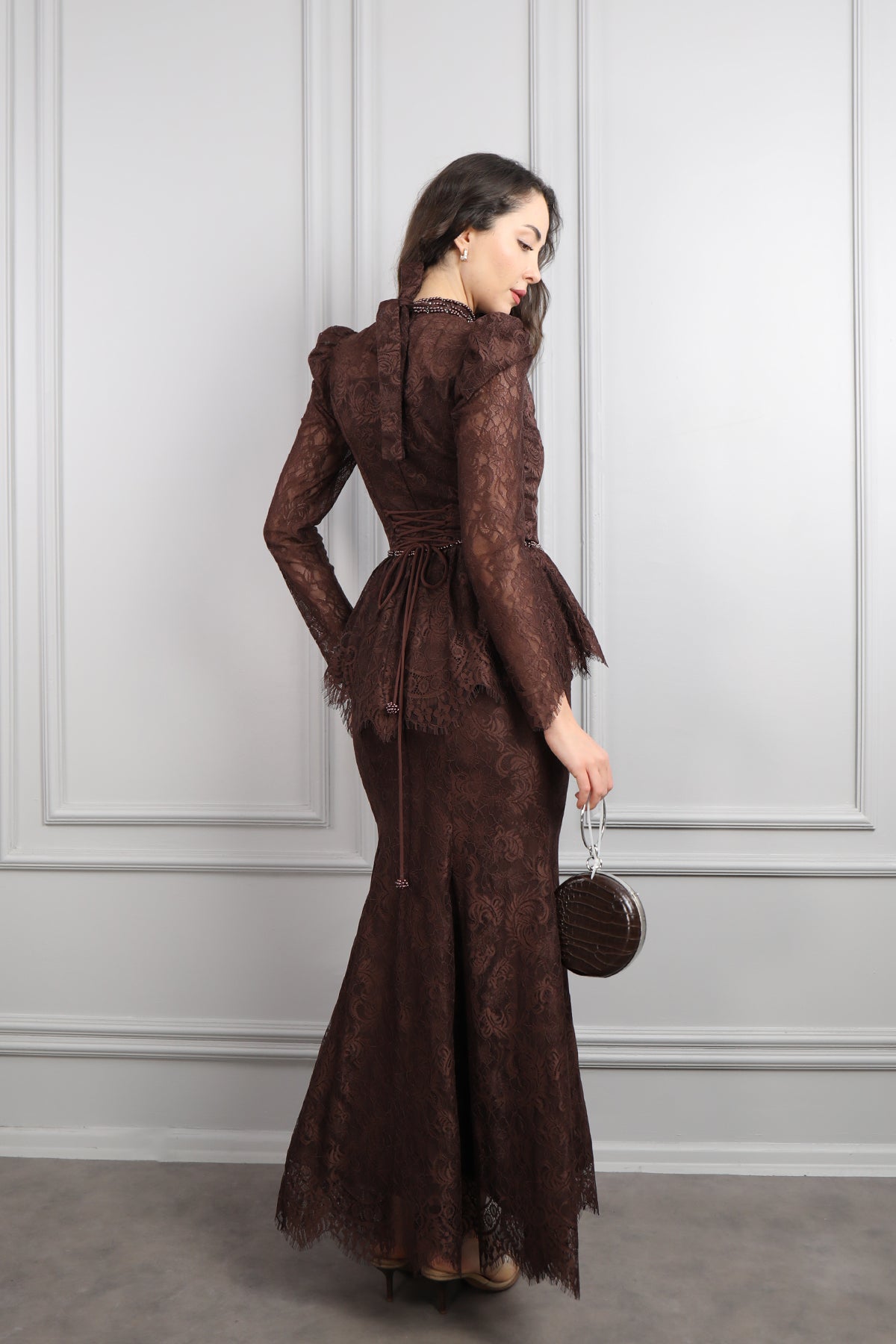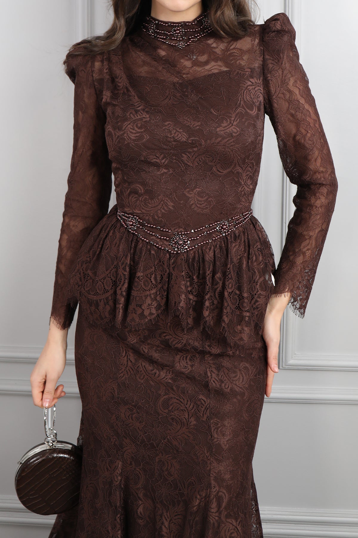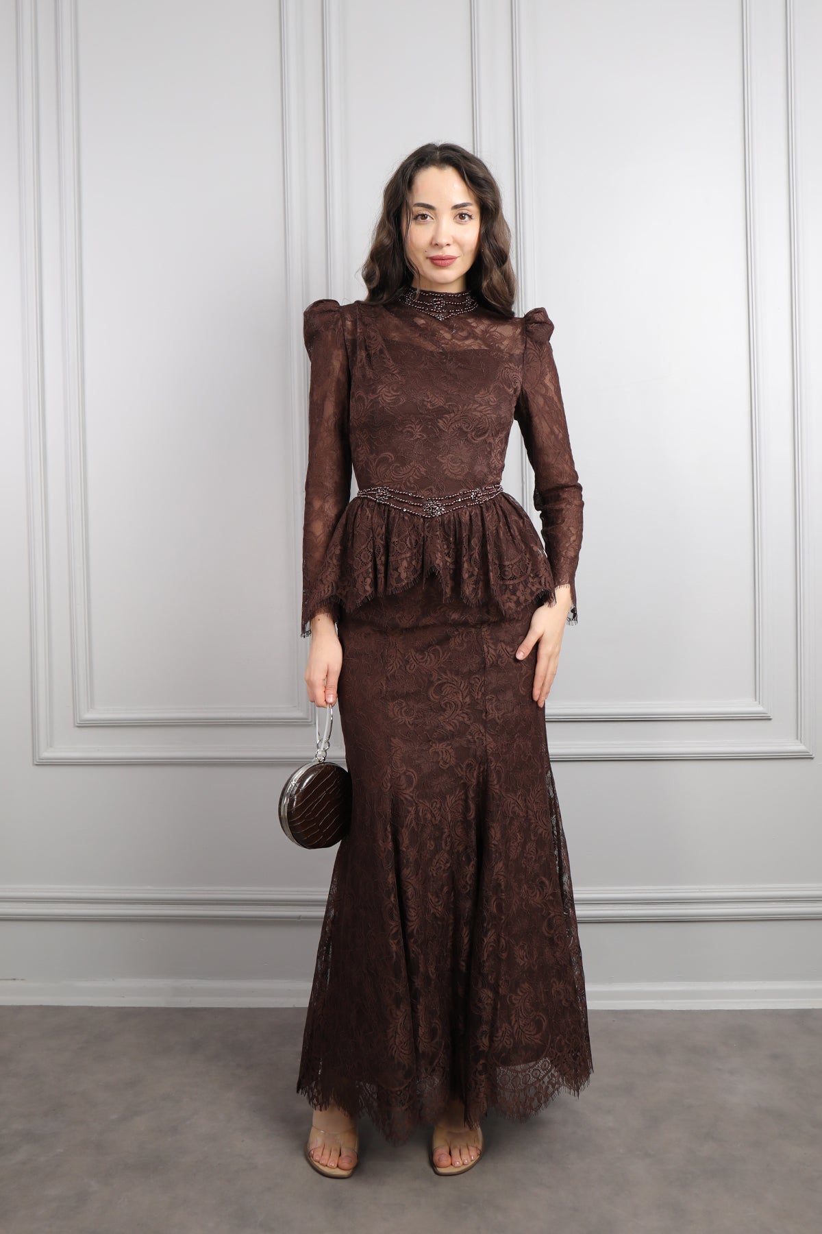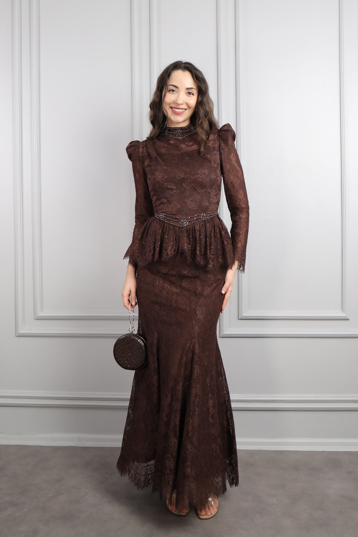 Hakim Yaka Boncuk İşlemeli Çanta Aksesuar Detaylı Dantelli Etek Takım Kahve