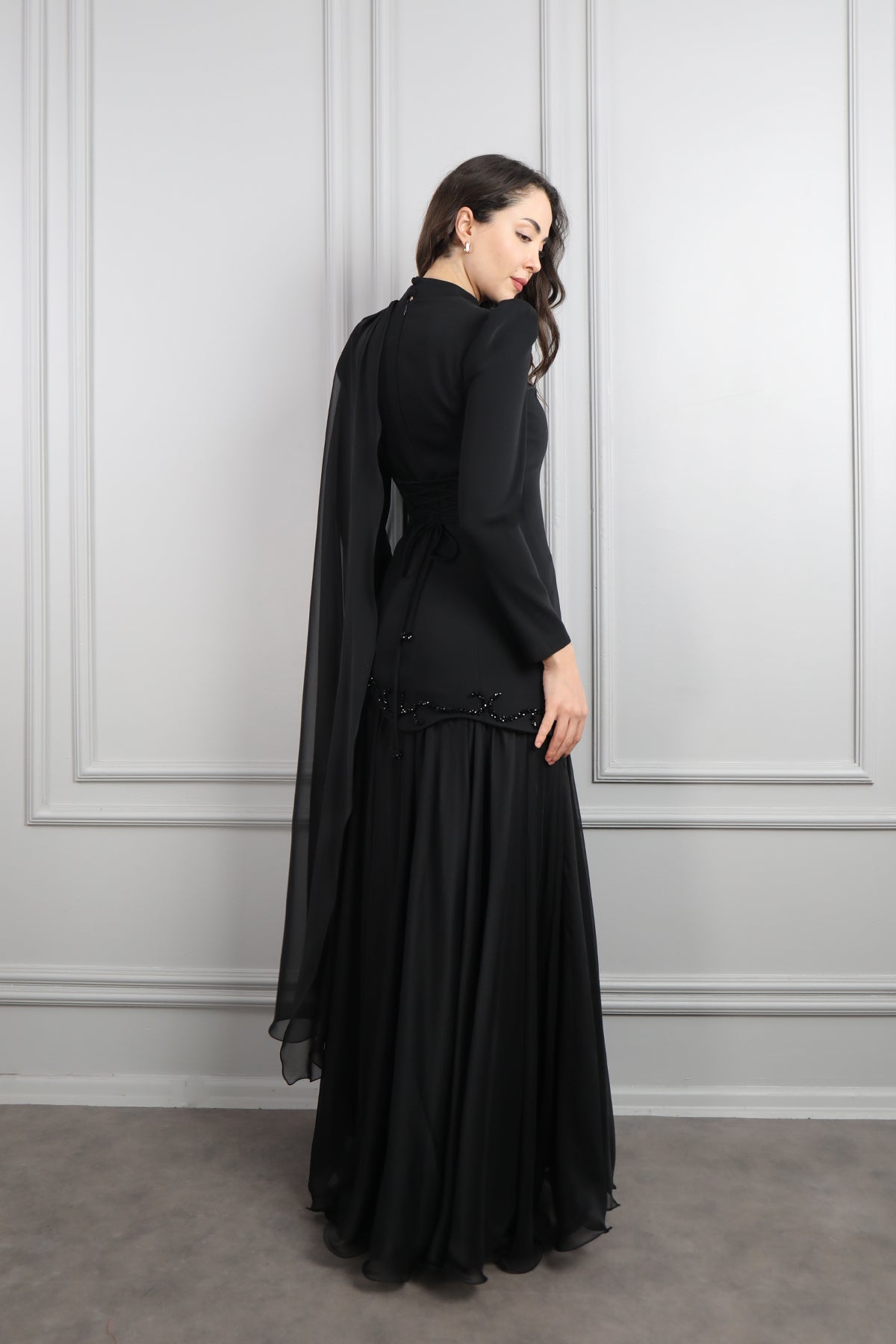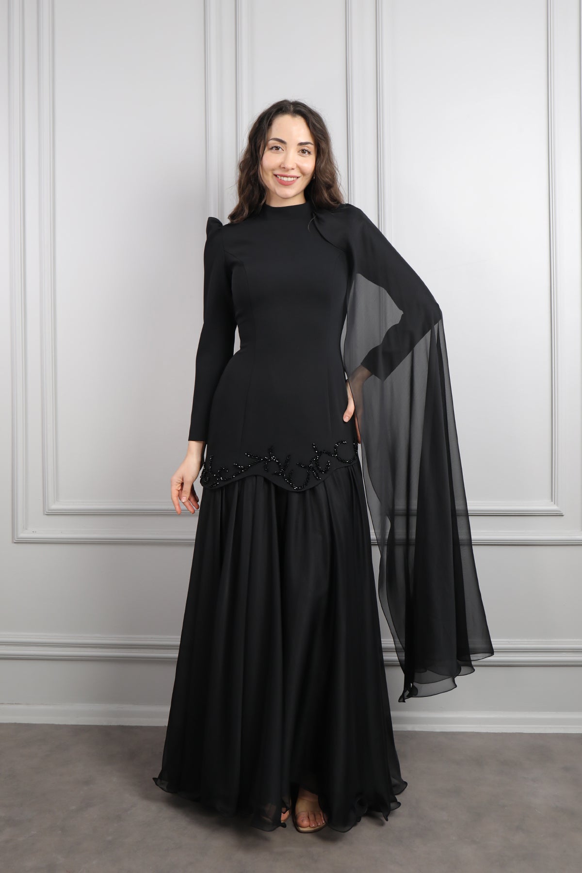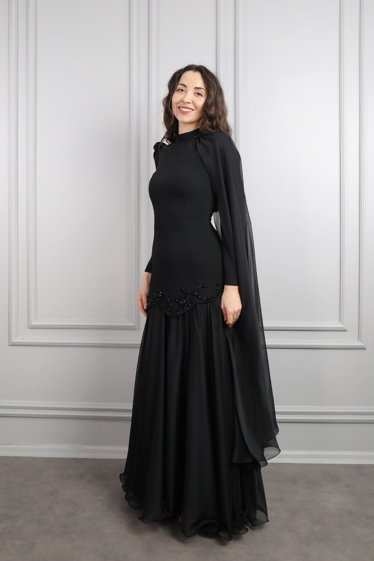 Hakim Yaka Boncuk İşlemeli Omuzdan Pelerin Detaylı Elbise Siyah