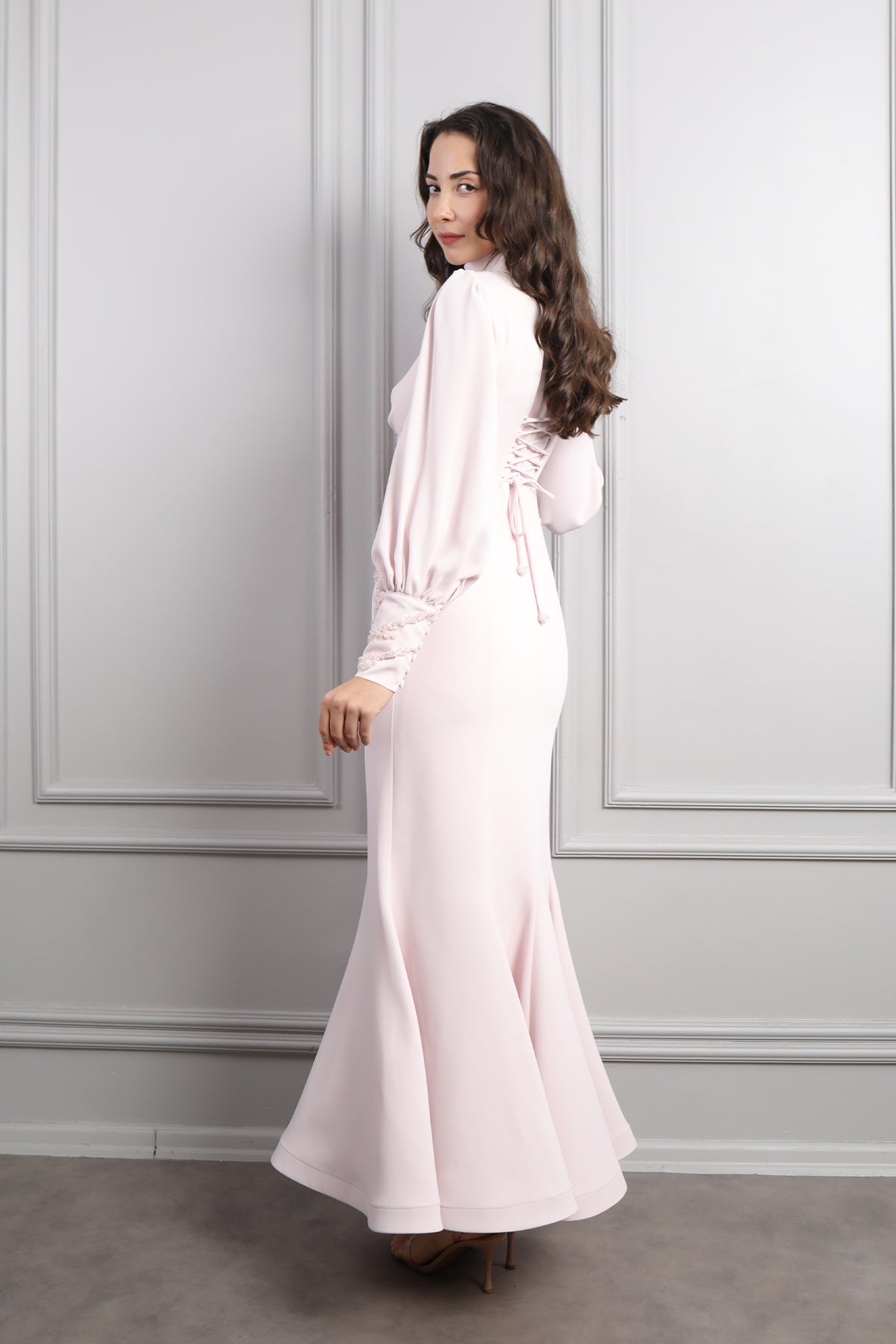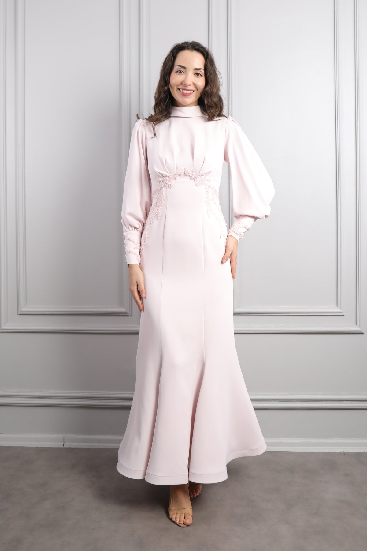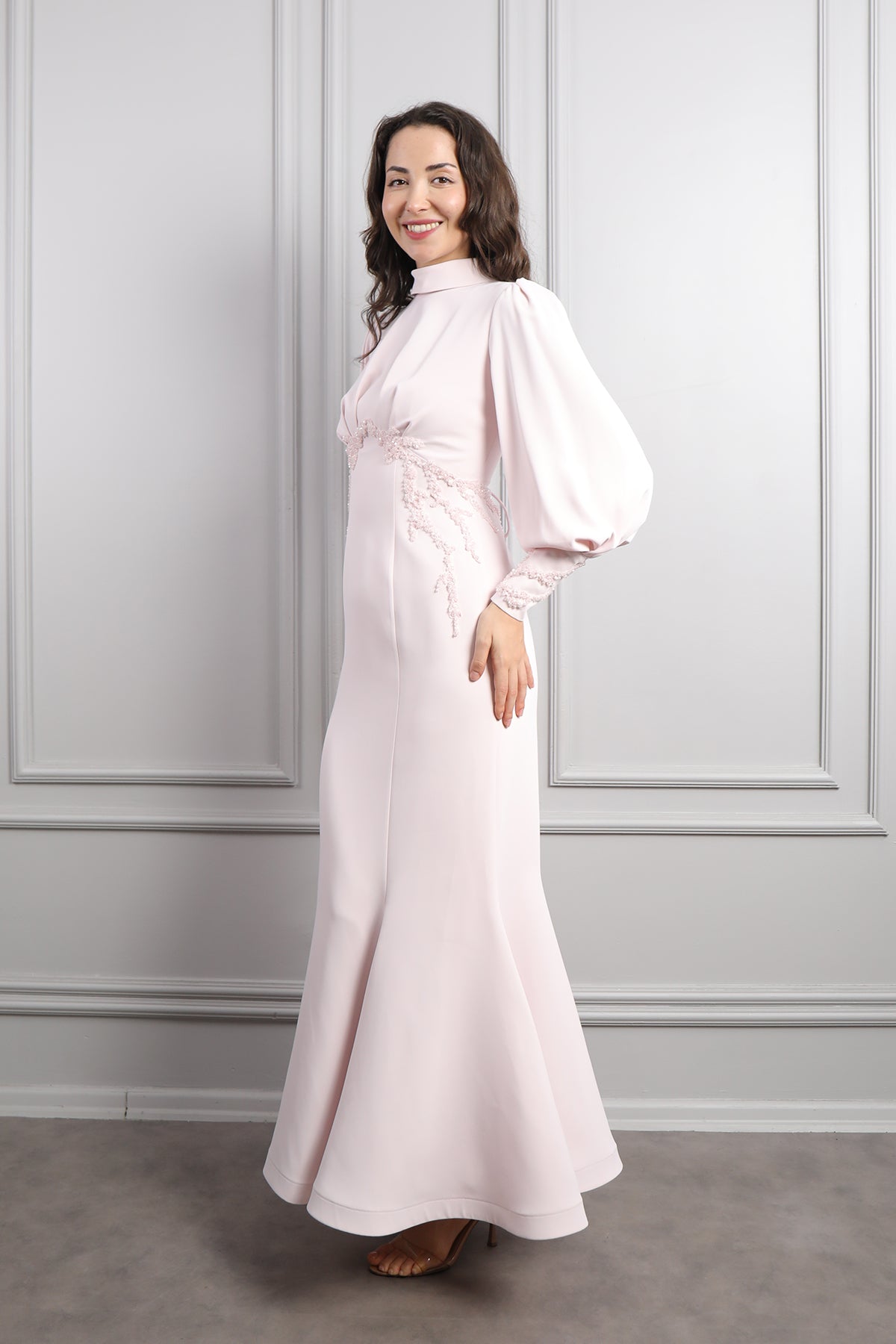 Zarif ve sofistike tasarımıyla öne çıkan Hakim Yaka Boncuk İşlemeli Sırtı Bağlamalı Elbise, Soft tonuyla sade ama etkileyici bir görünüm sunan elbise, hakim yaka detayıyla asil bir duruş kazandırırken uzun balon kollarıyla da modern bir siluet oluşturuyor. Bel kısmındaki ince boncuk işlemeleri, feminen bir ışıltı katarken vücut hatlarını zarifçe vurguluyor. Sırt kısmındaki bağlama detayıyla klasik tasarımlardan ayrılan bu model, Etek kısmının dökümlü formu yürüdükçe zarif bir hareket sağlarken, kumaşın akıcı yapısı rahatlığı ve şıklığı bir arada sunar. Nişan, söz, mezuniyet veya özel davetlerde sofistike ve romantik bir stil elde etmek isteyenlere ideal bir seçimdir.