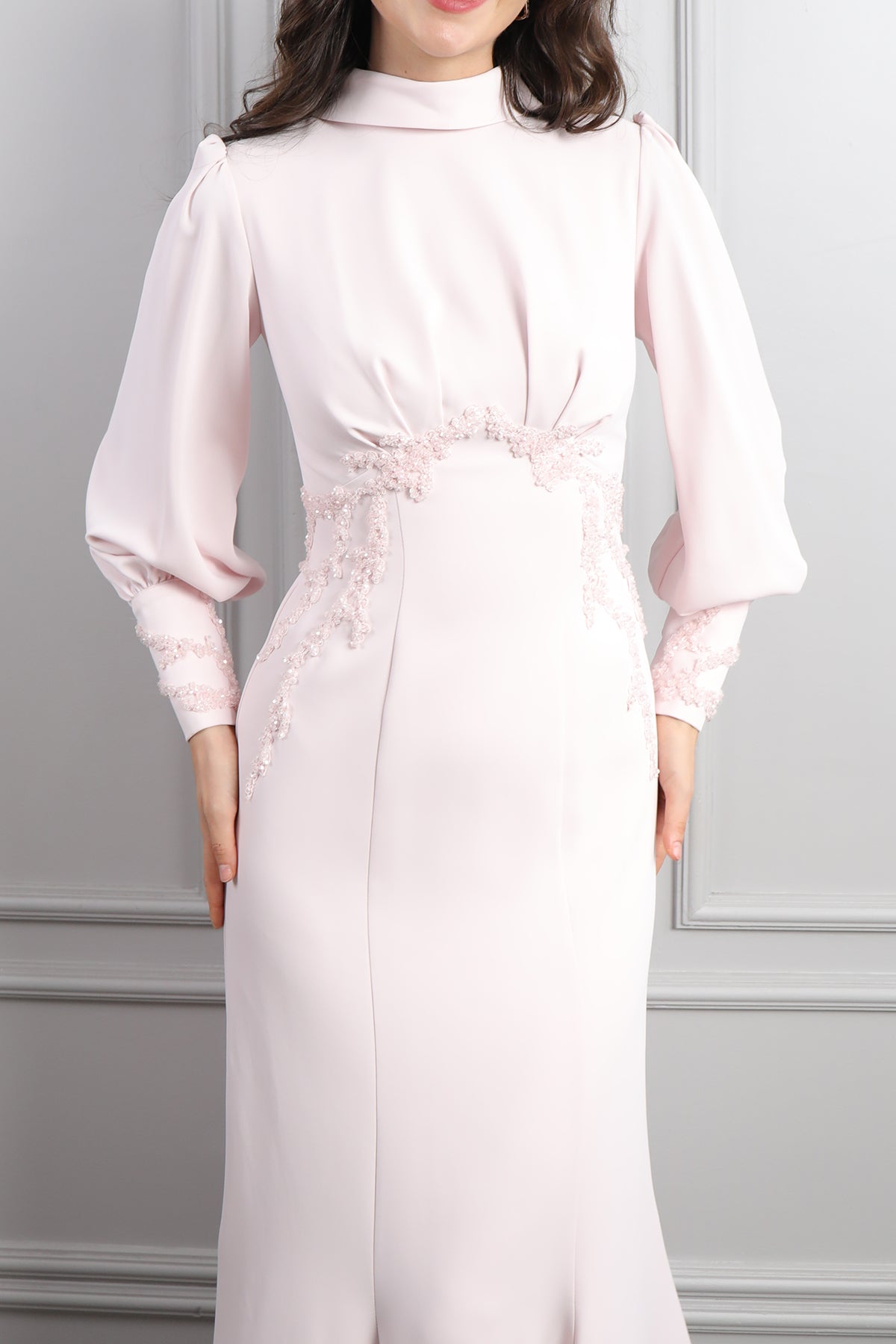 Hakim Yaka Boncuk İşlemeli Sırtı Bağlamalı Elbise Pudra
