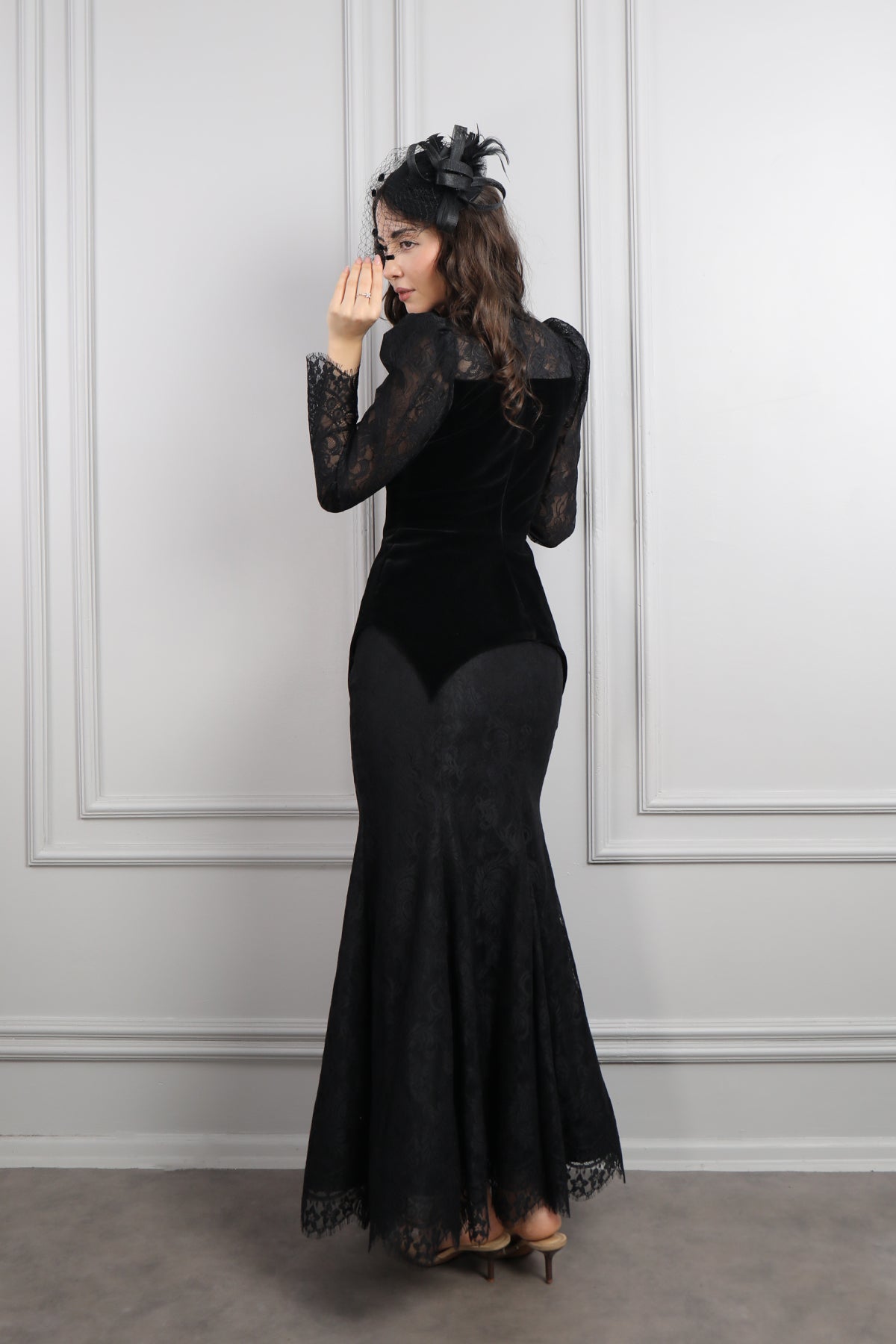Hakim Yaka Danteli Saç Aksesuar Detaylı Kadife Etek Takım Siyah