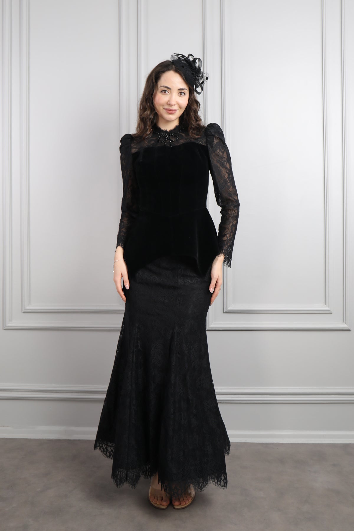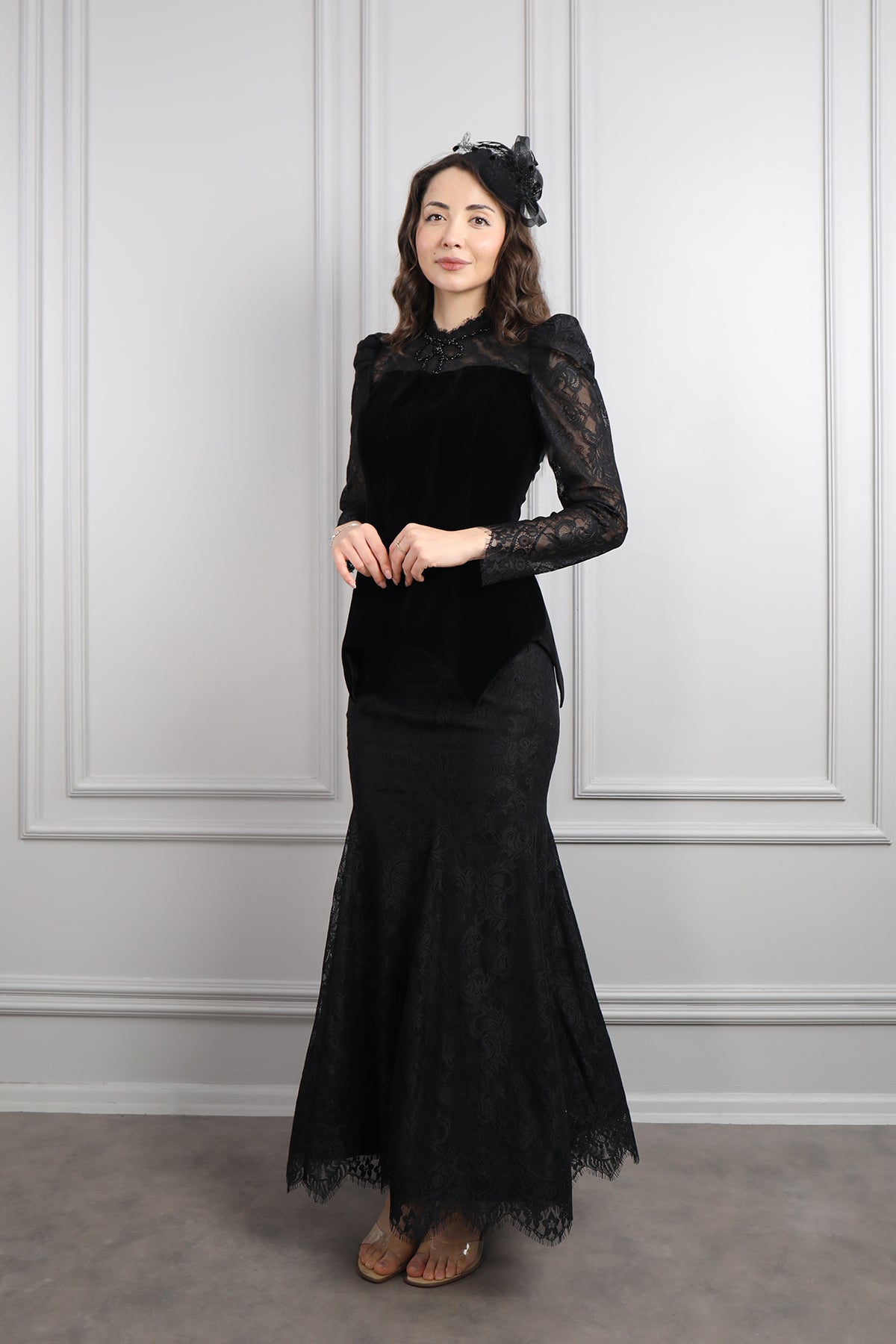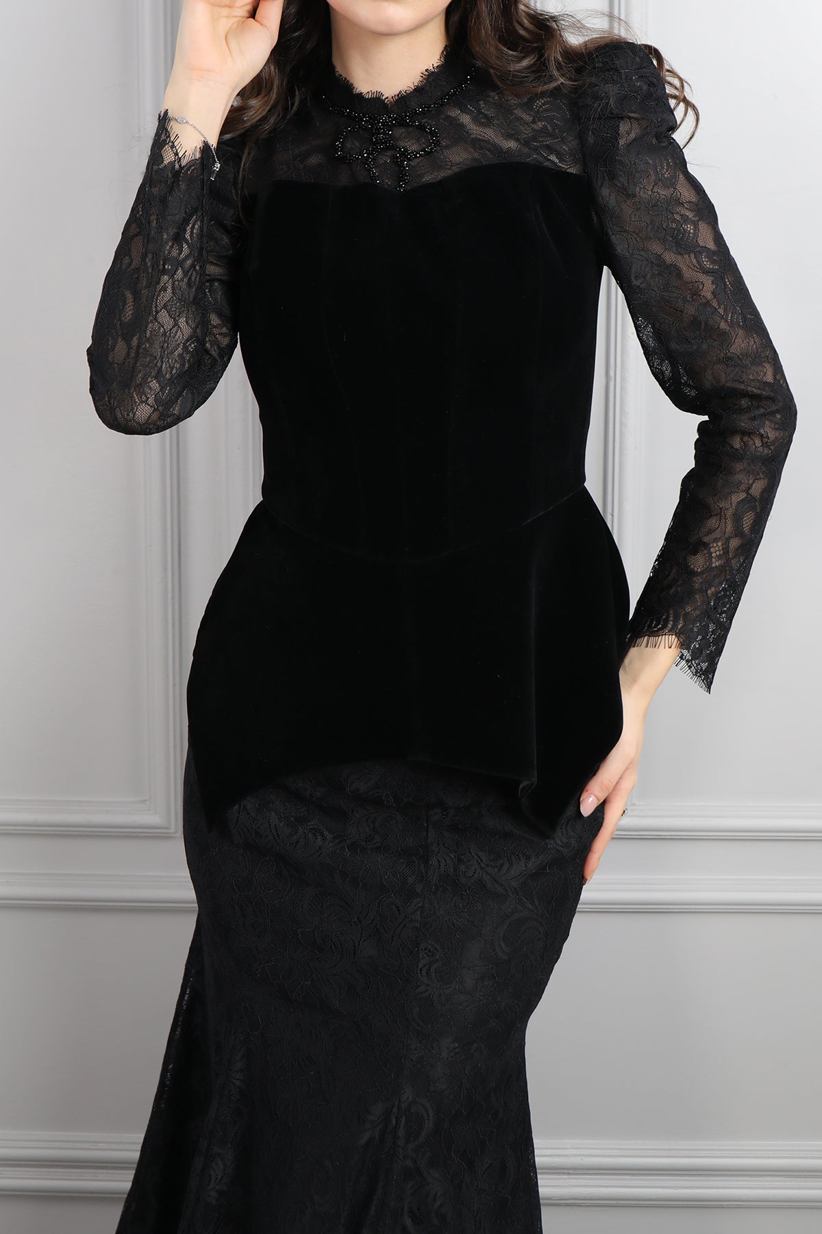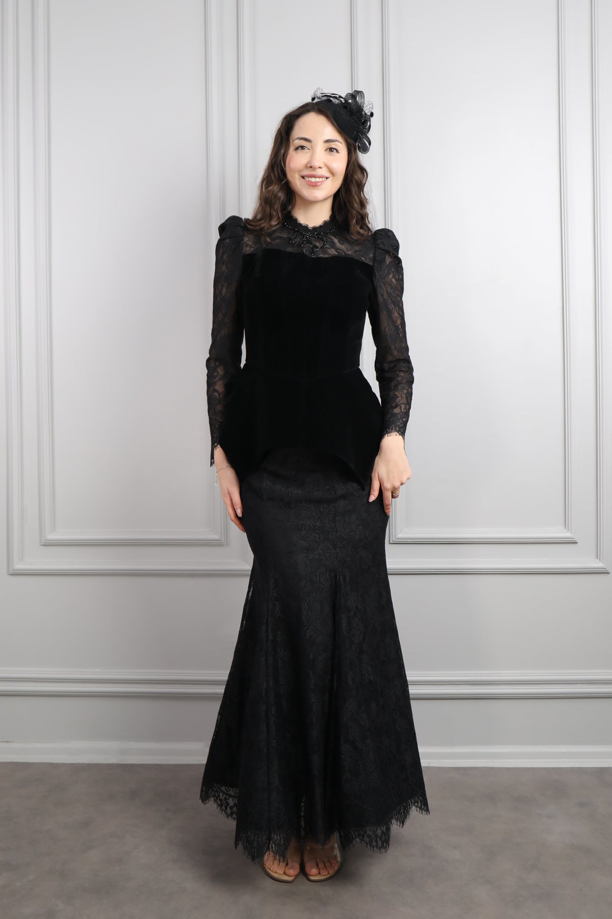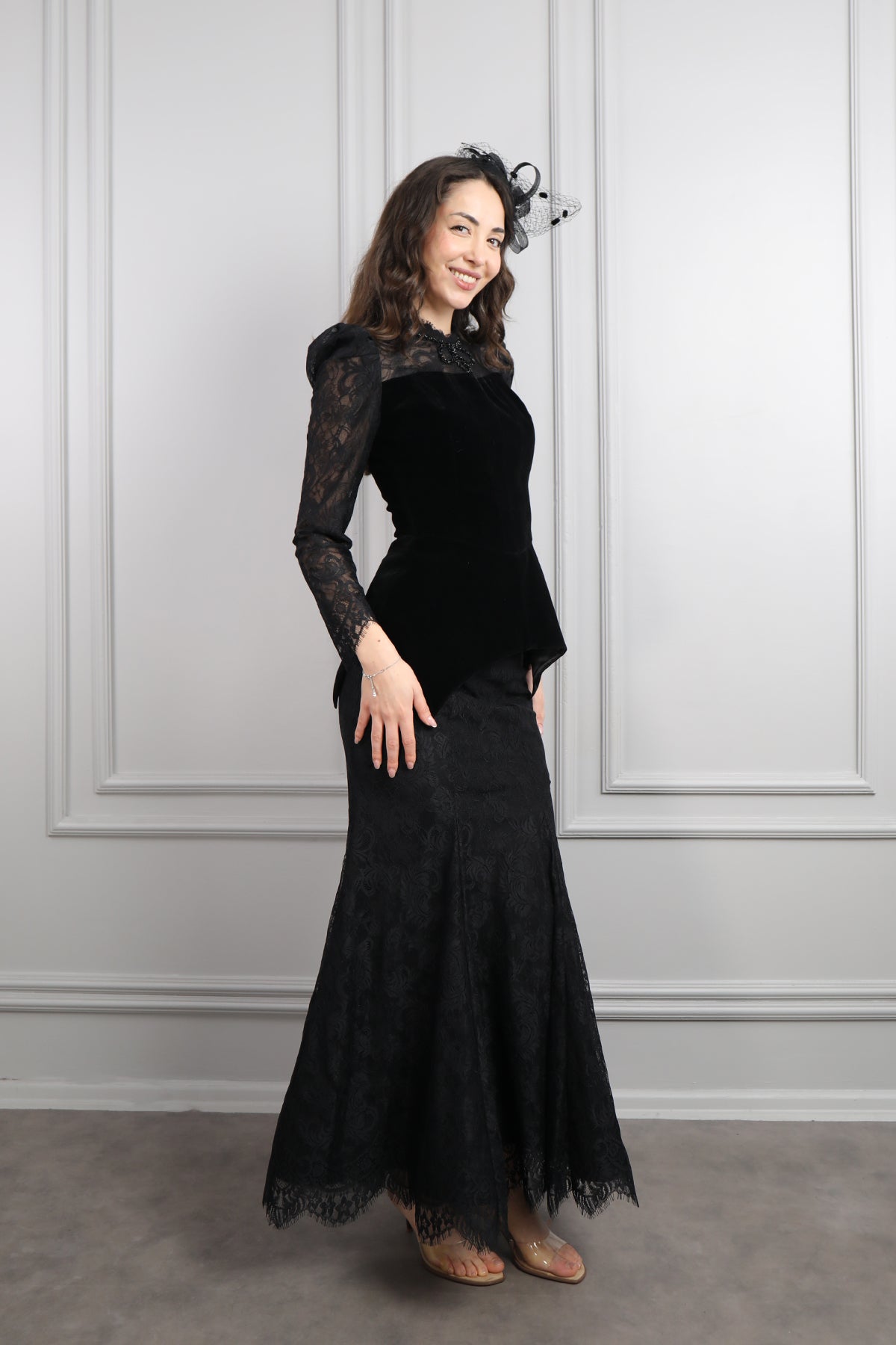 Hakim Yaka Danteli Saç Aksesuar Detaylı Kadife Etek Takım Siyah Özellikleri