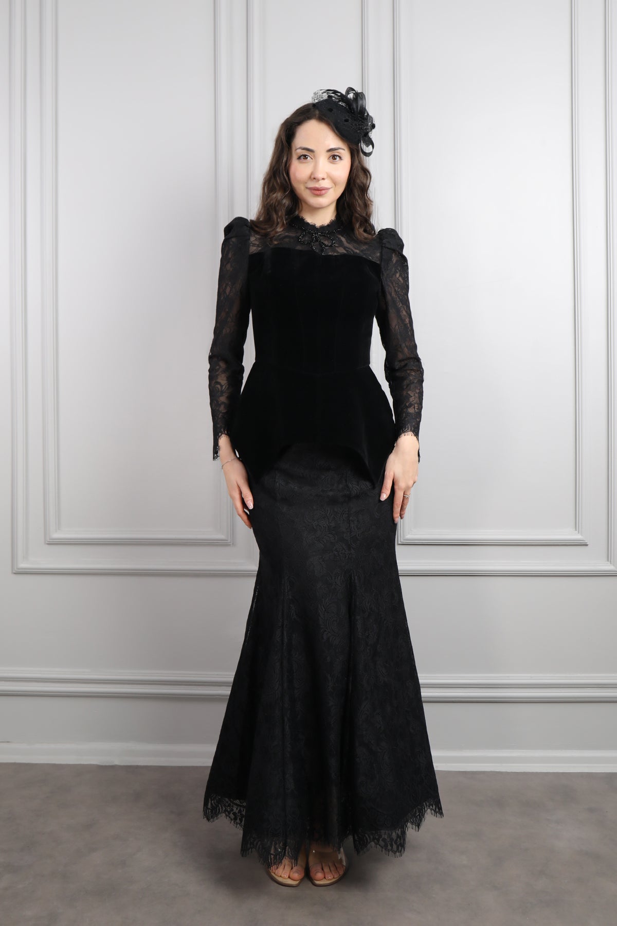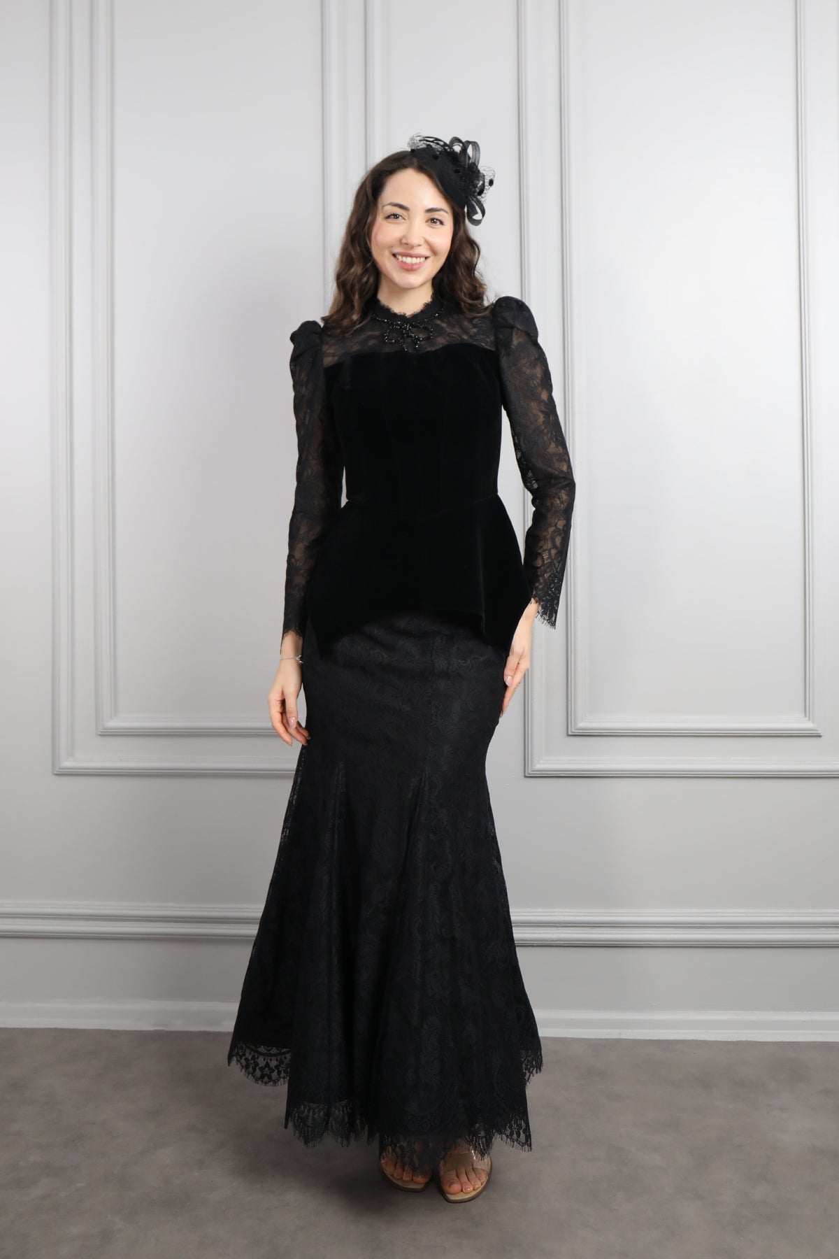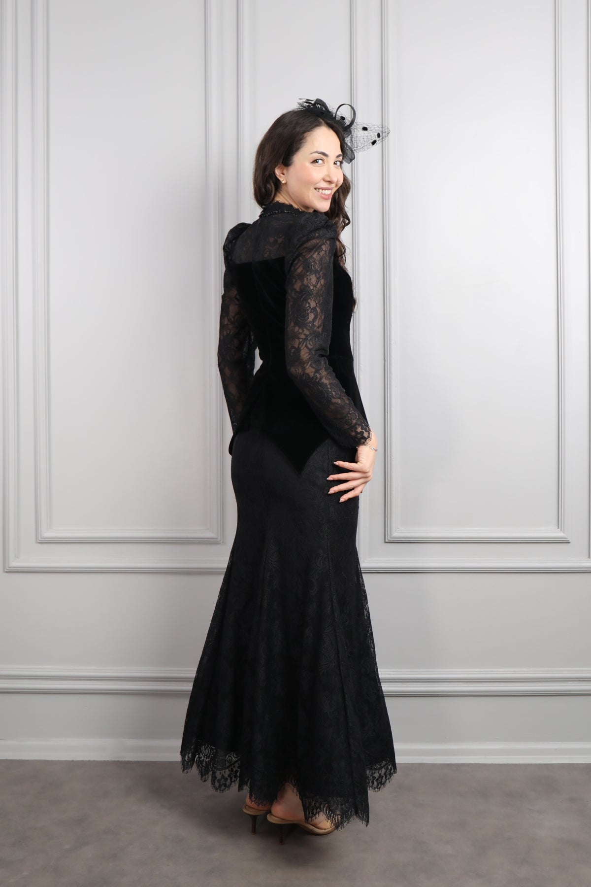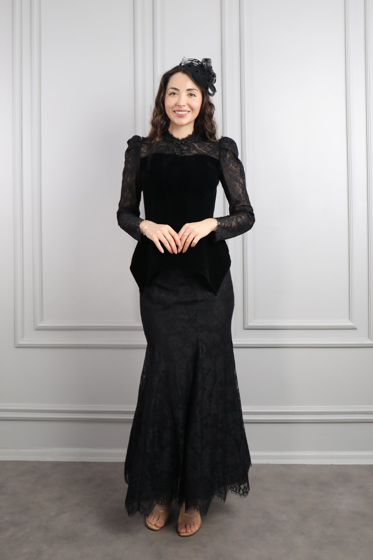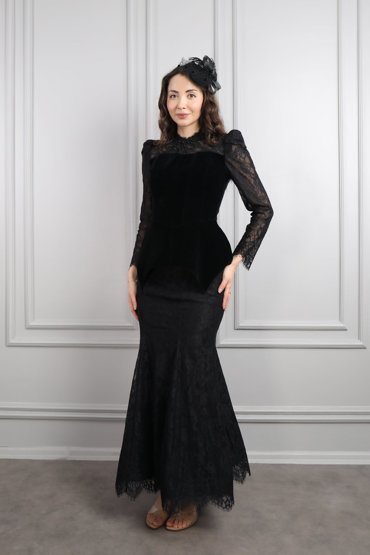 Hakim Yaka Danteli Saç Aksesuar Detaylı Kadife Etek Takım Siyah Özellikleri