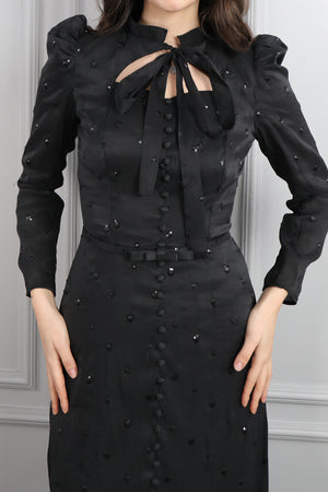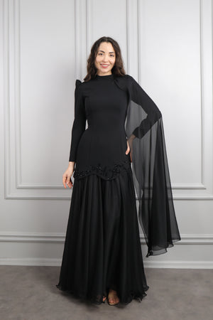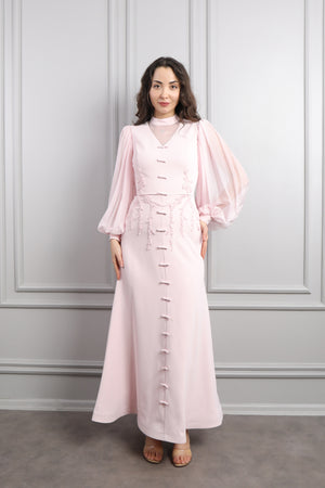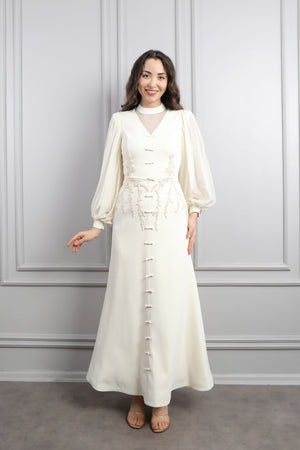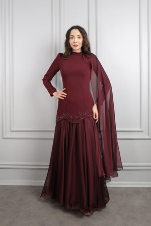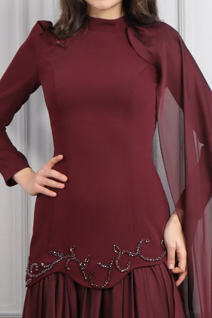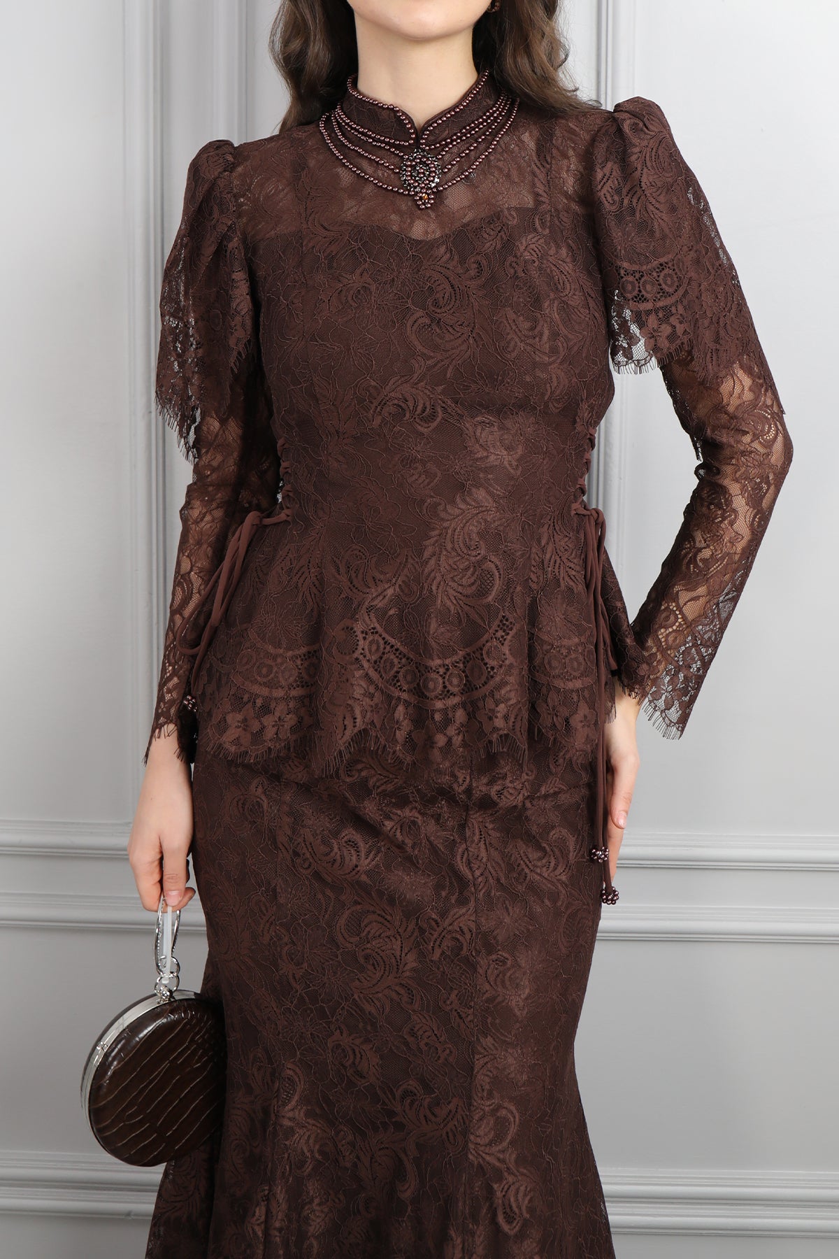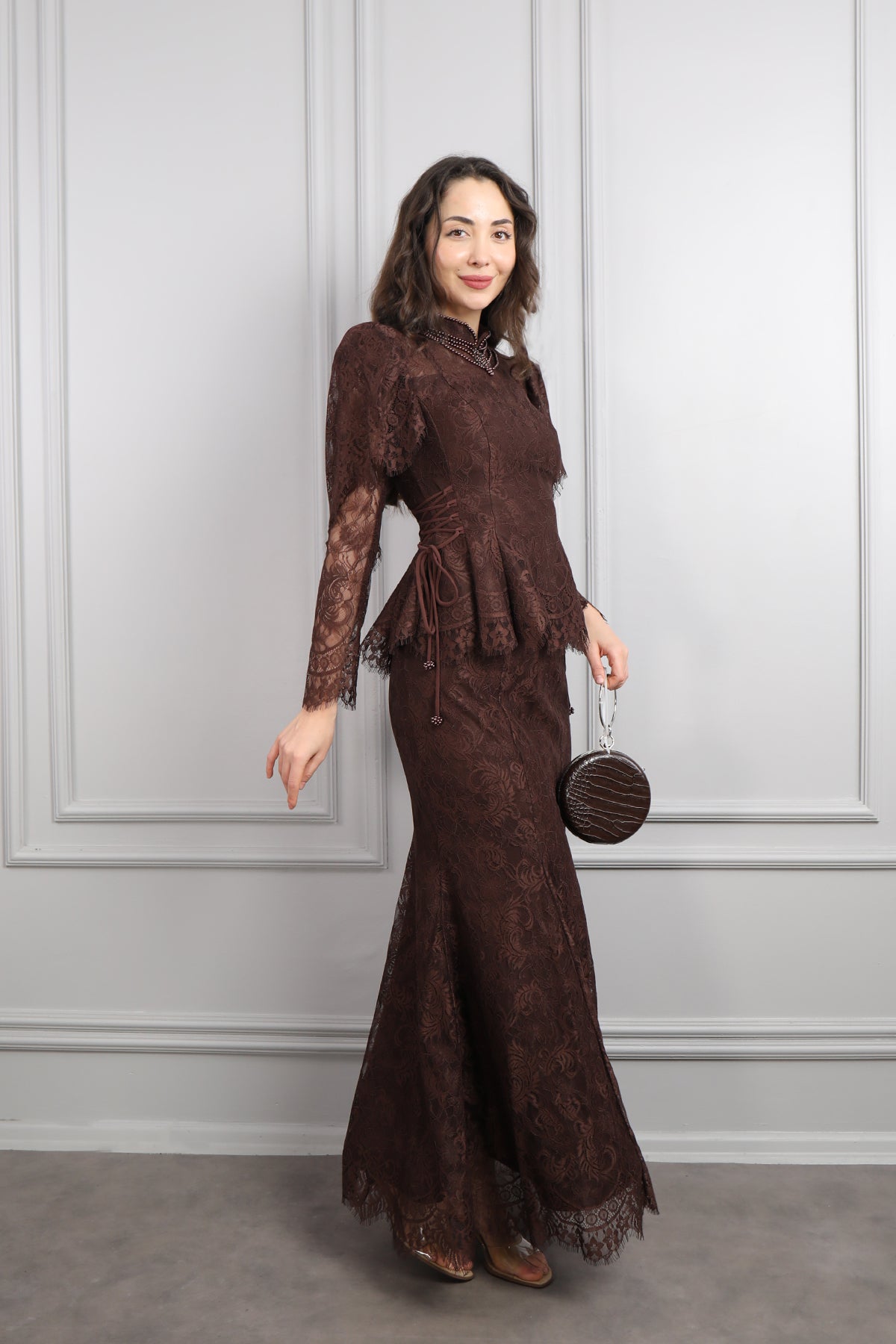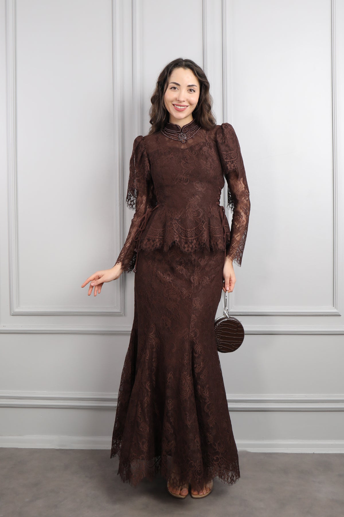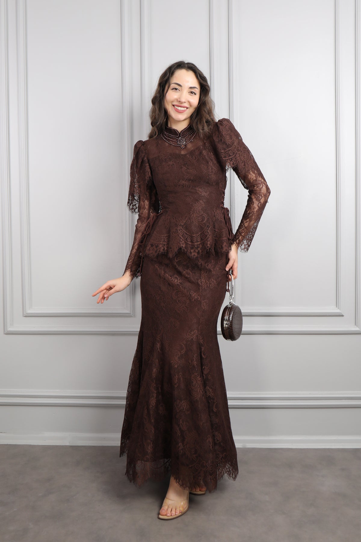 Hakim Yaka İnci İşlemeli Dantelli Etek Takım Kahve Özellikleri