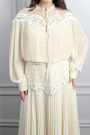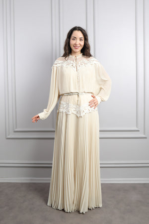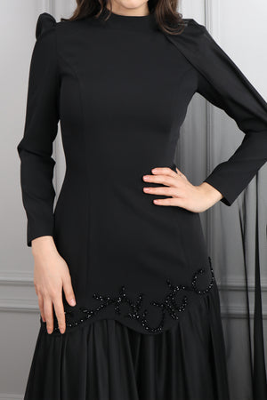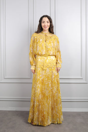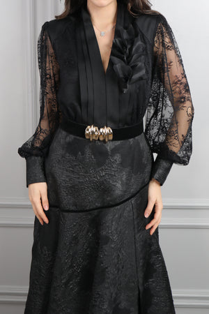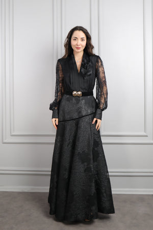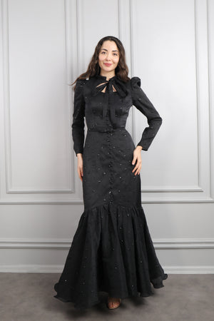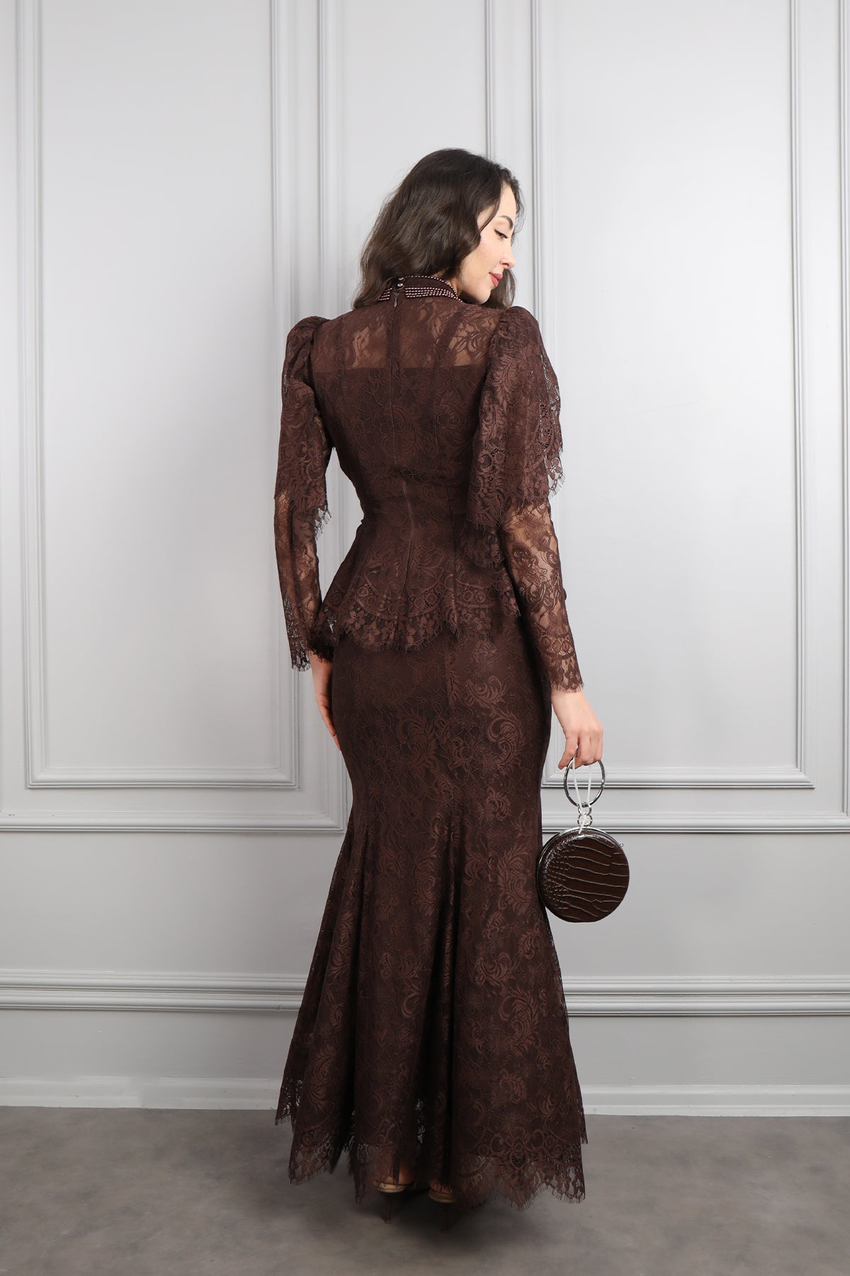 Hakim Yaka İnci İşlemeli Dantelli Etek Takım Kahve