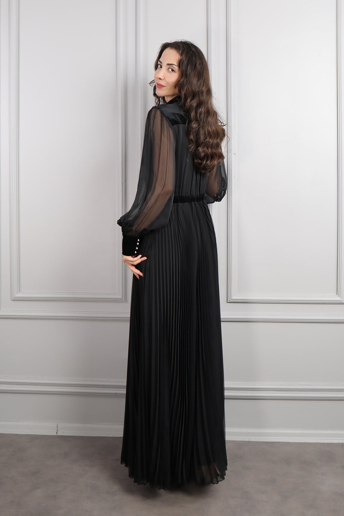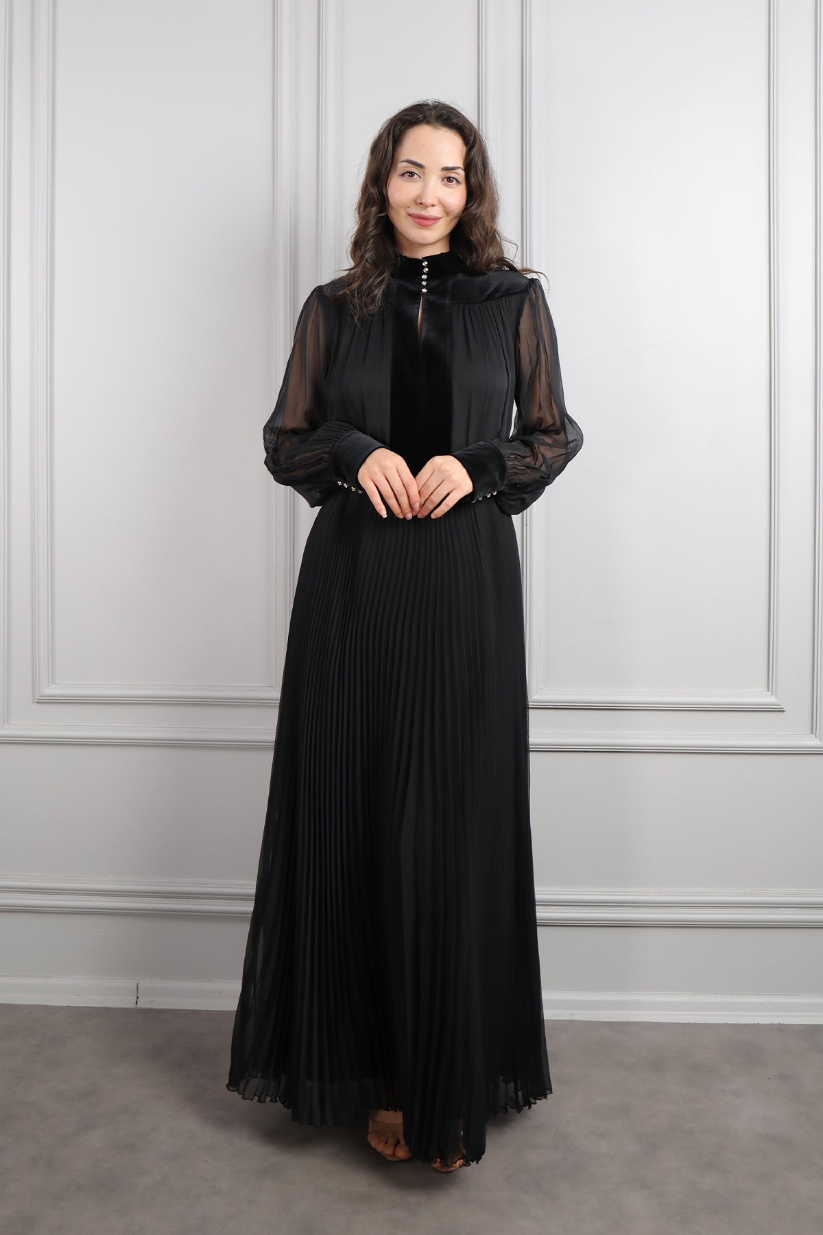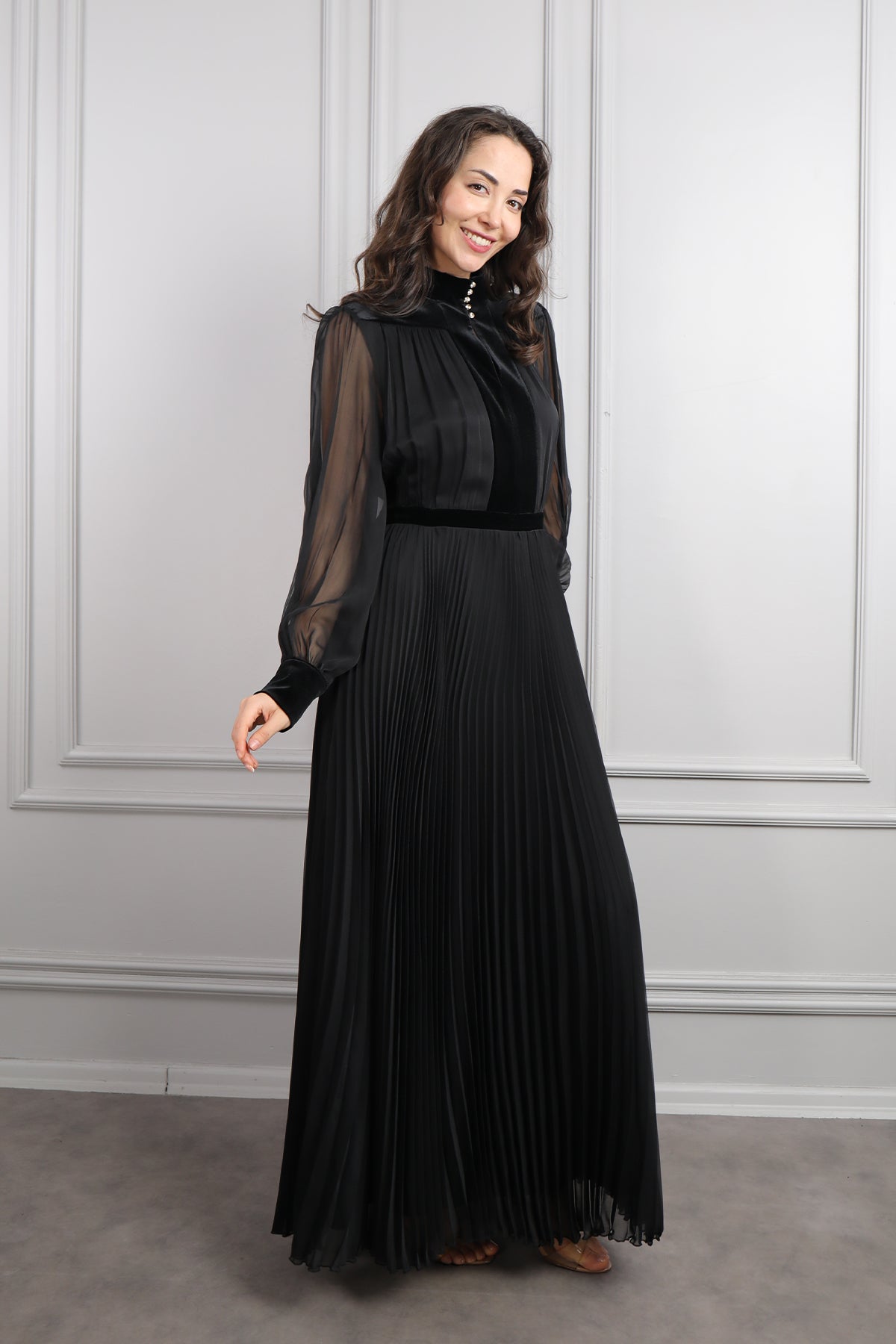 Zarafeti ve modern çizgileri bir araya getiren bu hakim yaka şifon elbise, özel günlerde fark yaratmak isteyen kadınların favorisi olmaya aday. Göğüs kısmında yer alan kadife detaylar, elbiseye asil bir hava katarken, şeffaf uzun kolları feminen bir dokunuş sunuyor. Pileli eteği ise hem şık hem de hareketli bir görünüm sağlıyor. Vücuda tam oturan yapısı sayesinde kusursuz bir siluet elde etmenizi sağlayan bu model, hem konfor hem de estetik açısından ideal. Düğün, nişan, davet ve akşam yemeği gibi özel etkinliklerde etkileyici bir duruş yakalamak isteyenler için ideal bir seçimdir.
