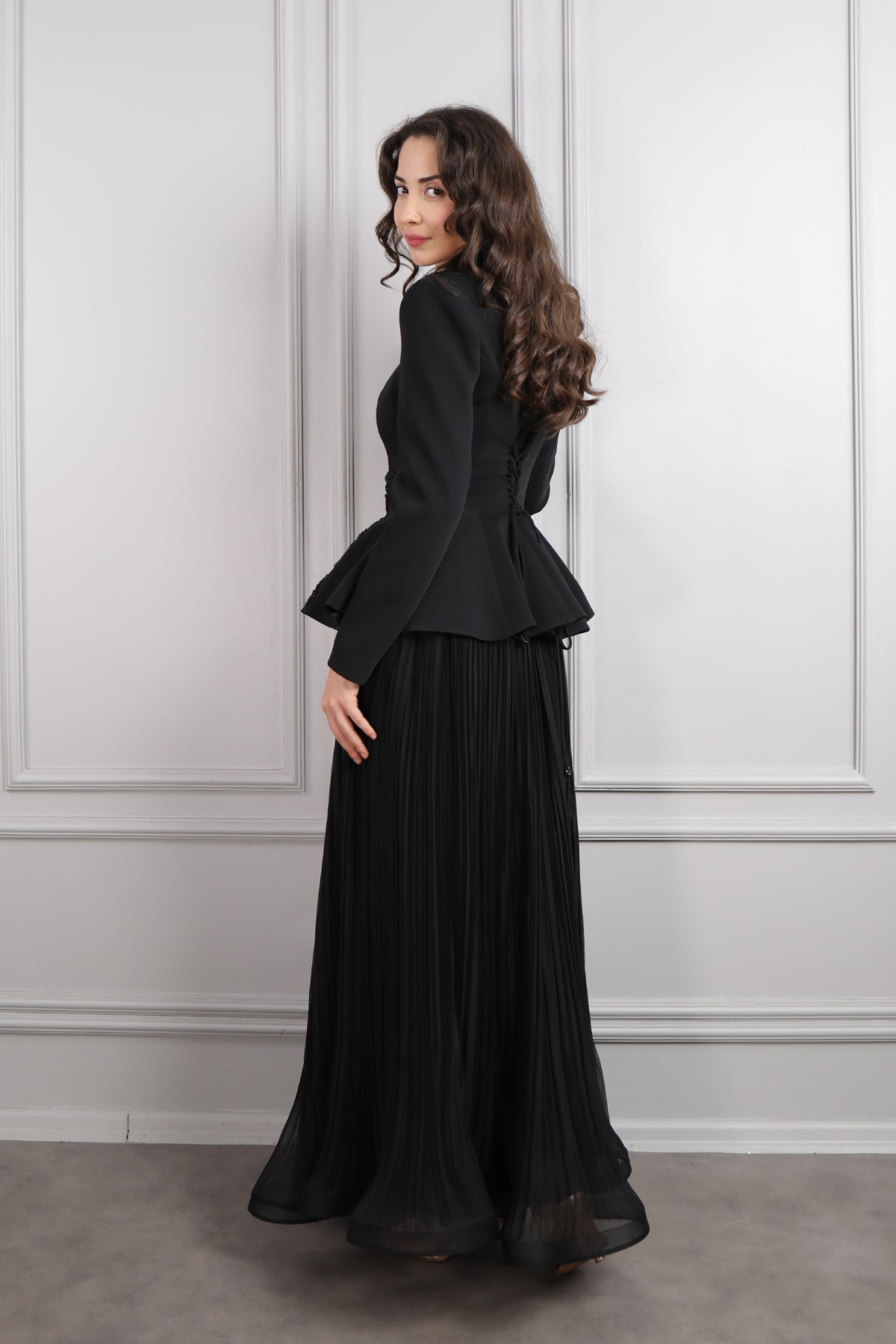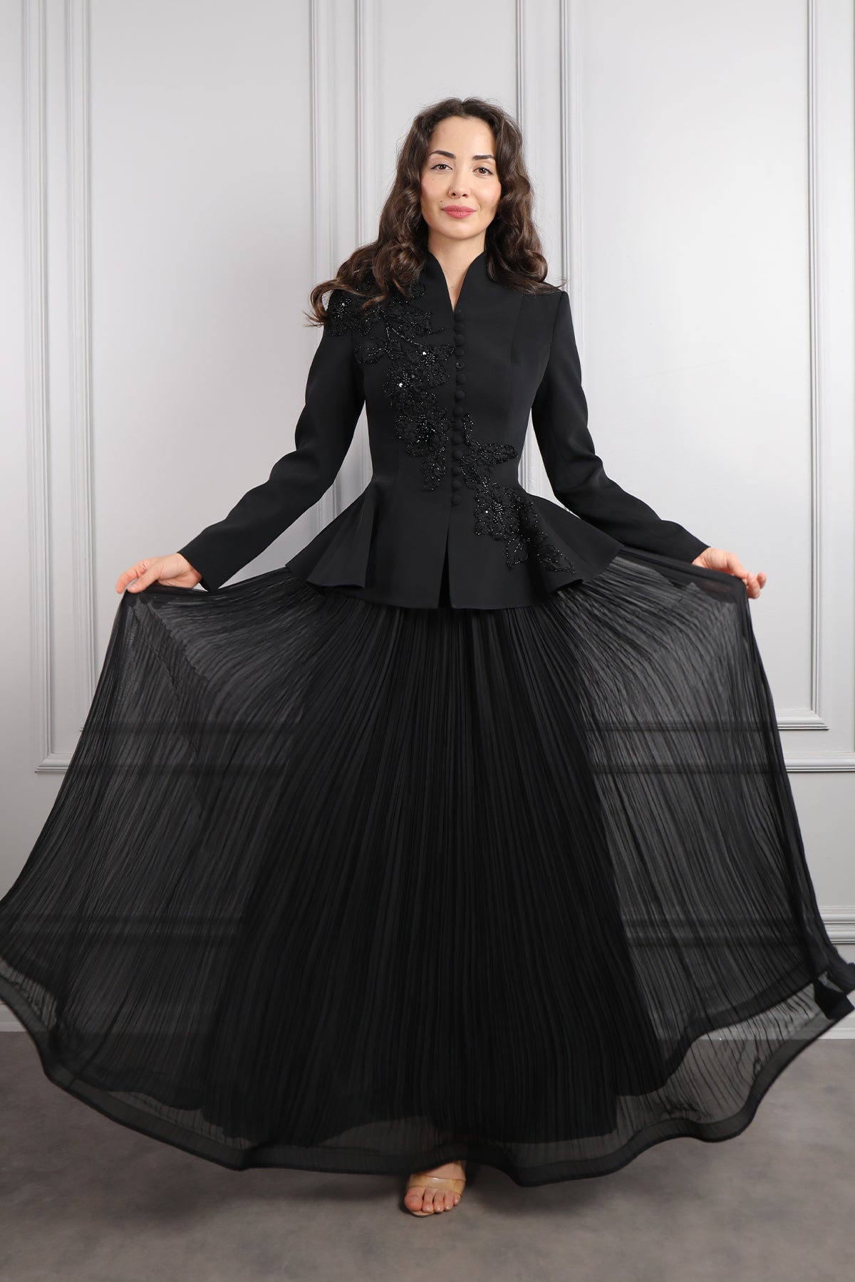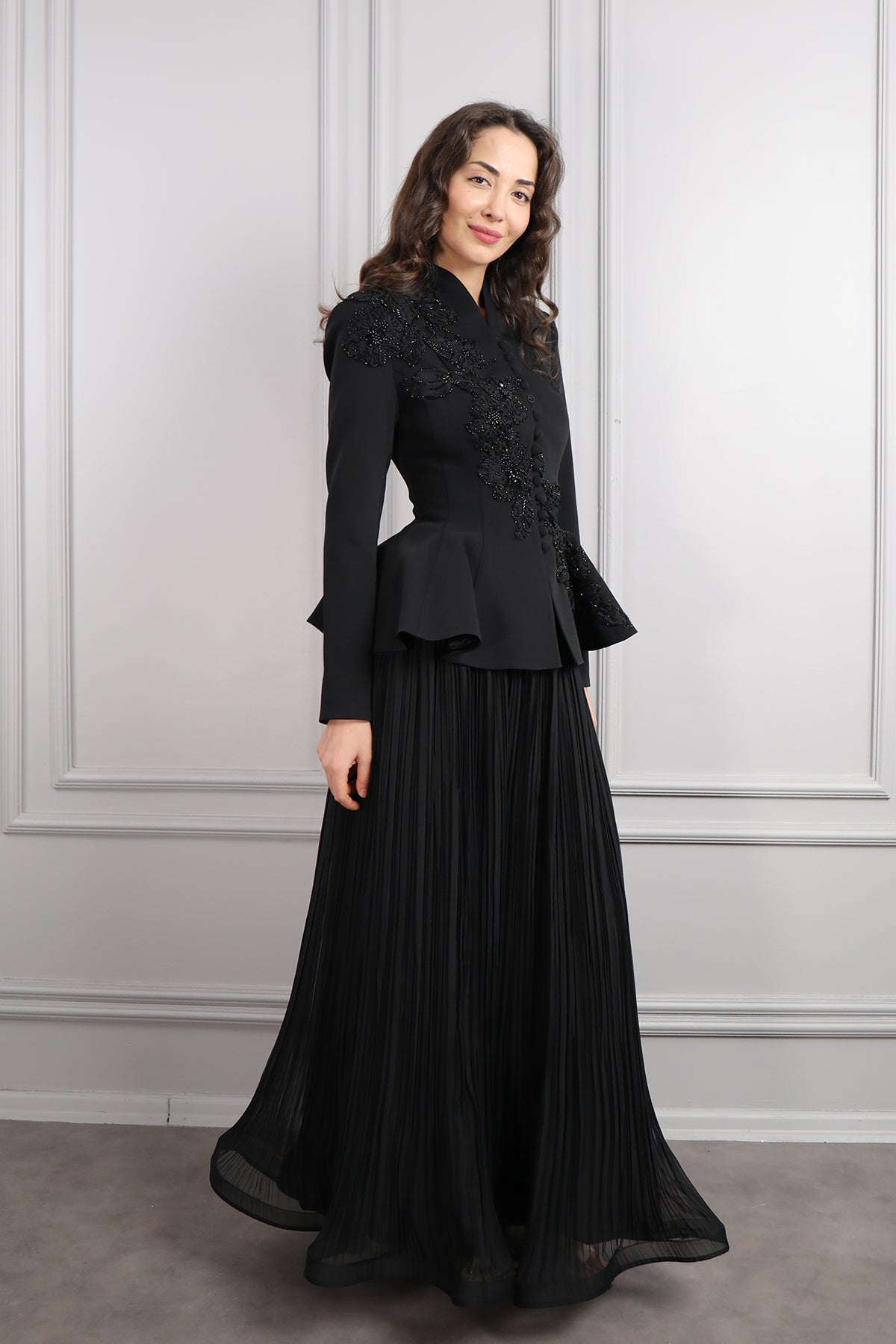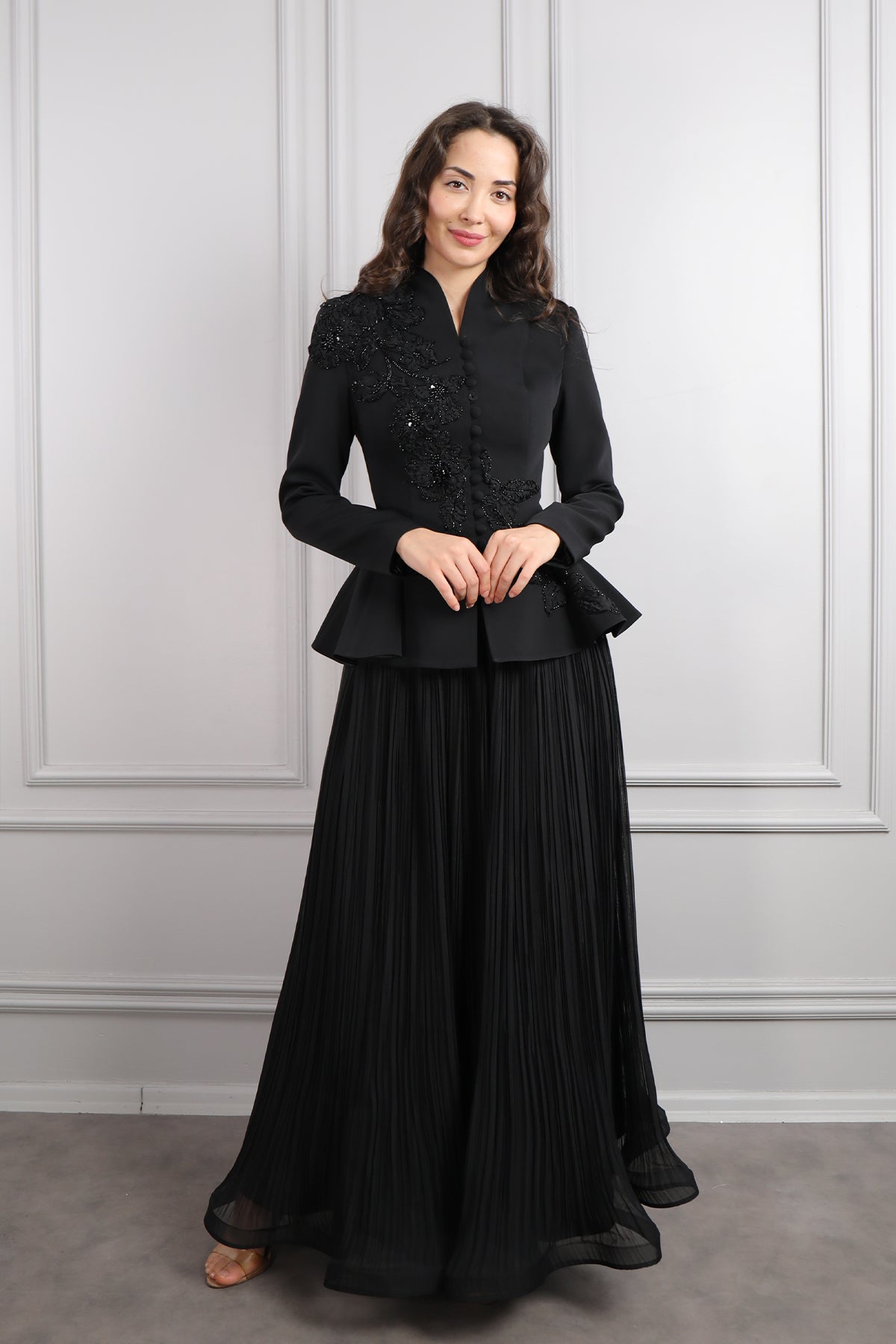 Hakim Yaka Önü Düğmeli Boncuk İşlemeli Pileli Etek Takım Siyah