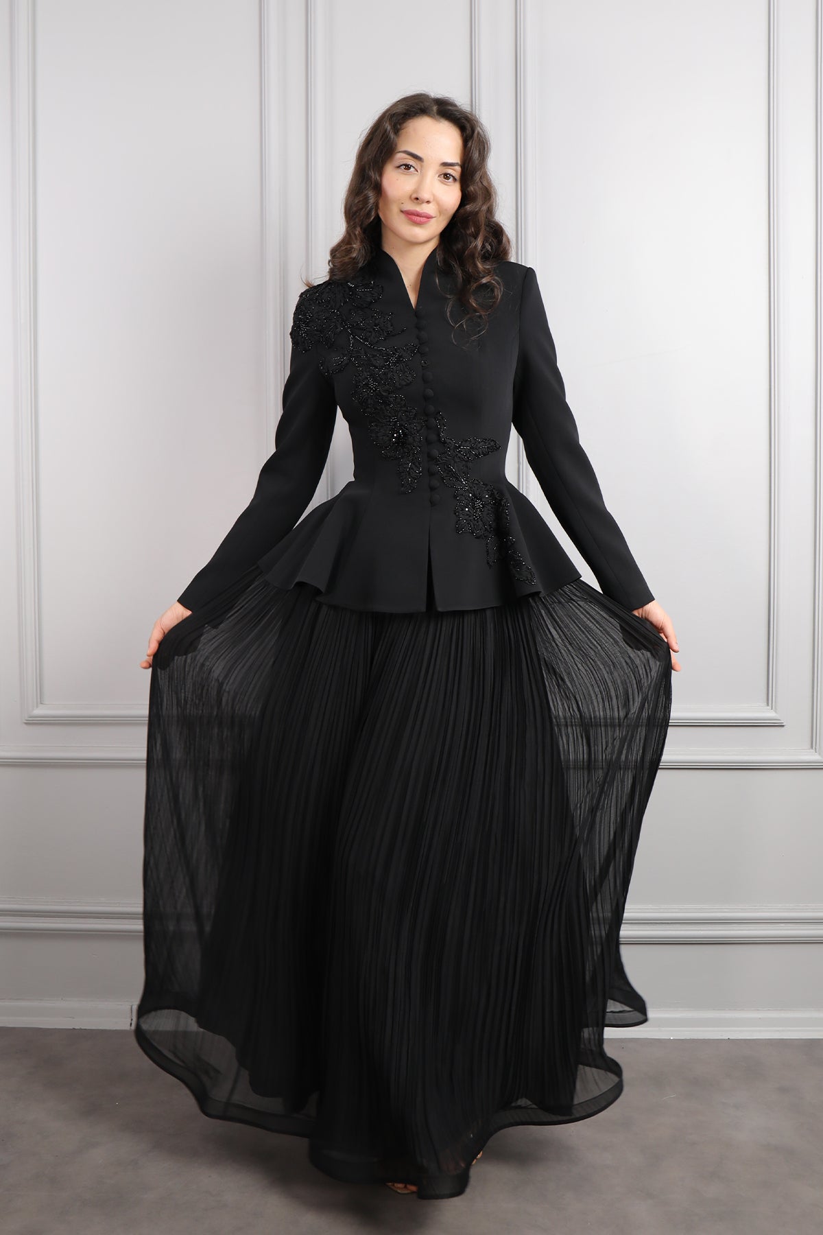 Hakim Yaka Önü Düğmeli Boncuk İşlemeli Pileli Etek Takım Siyah Özellikleri