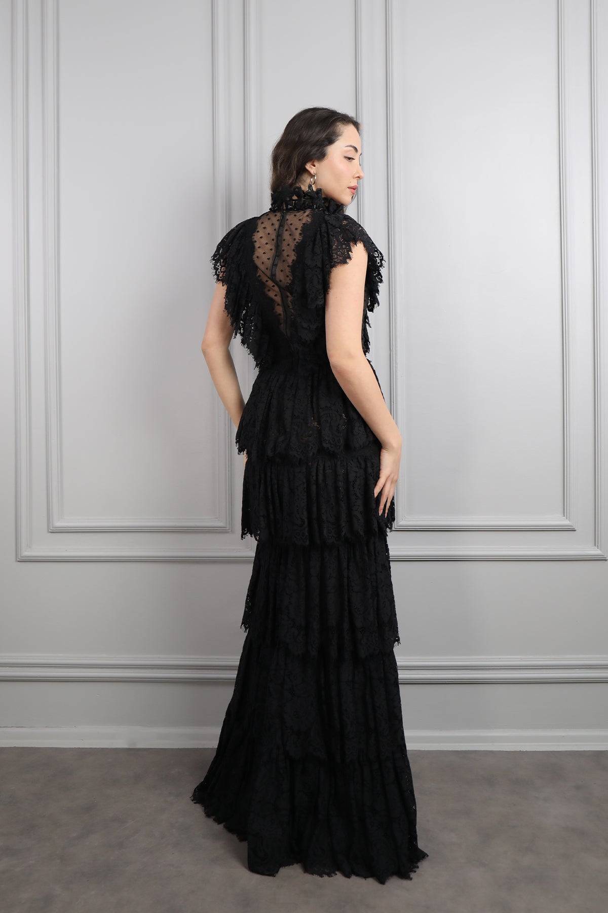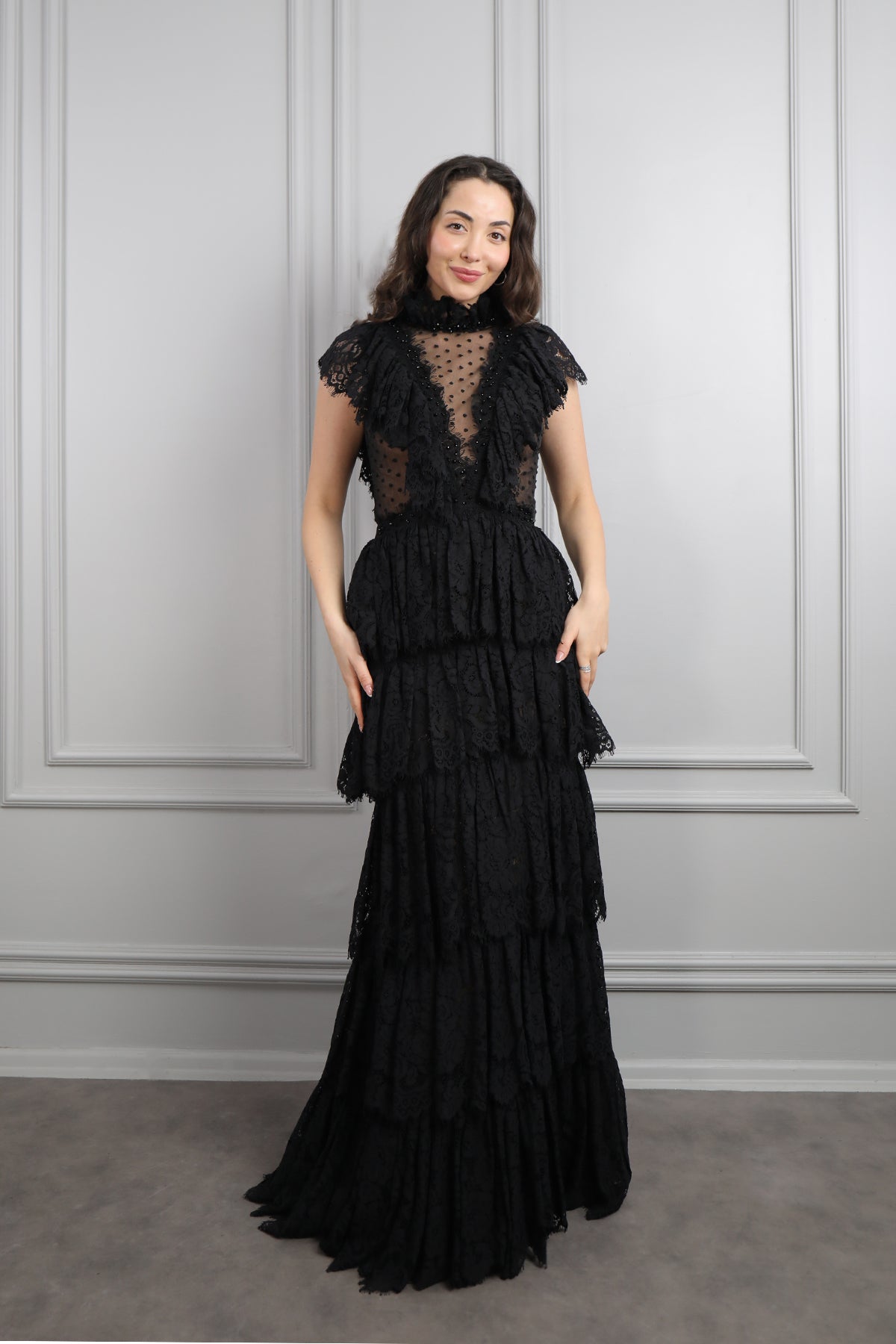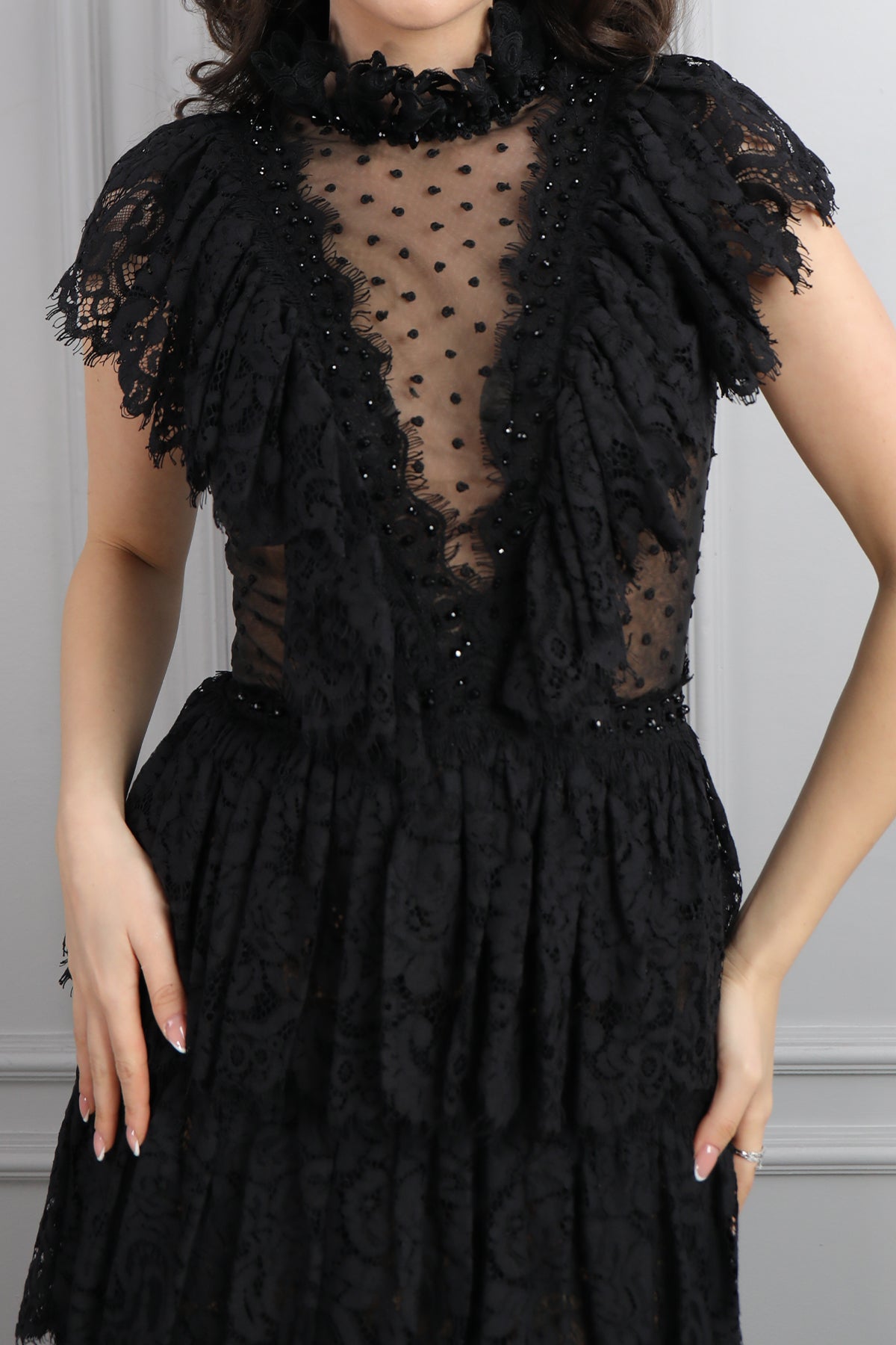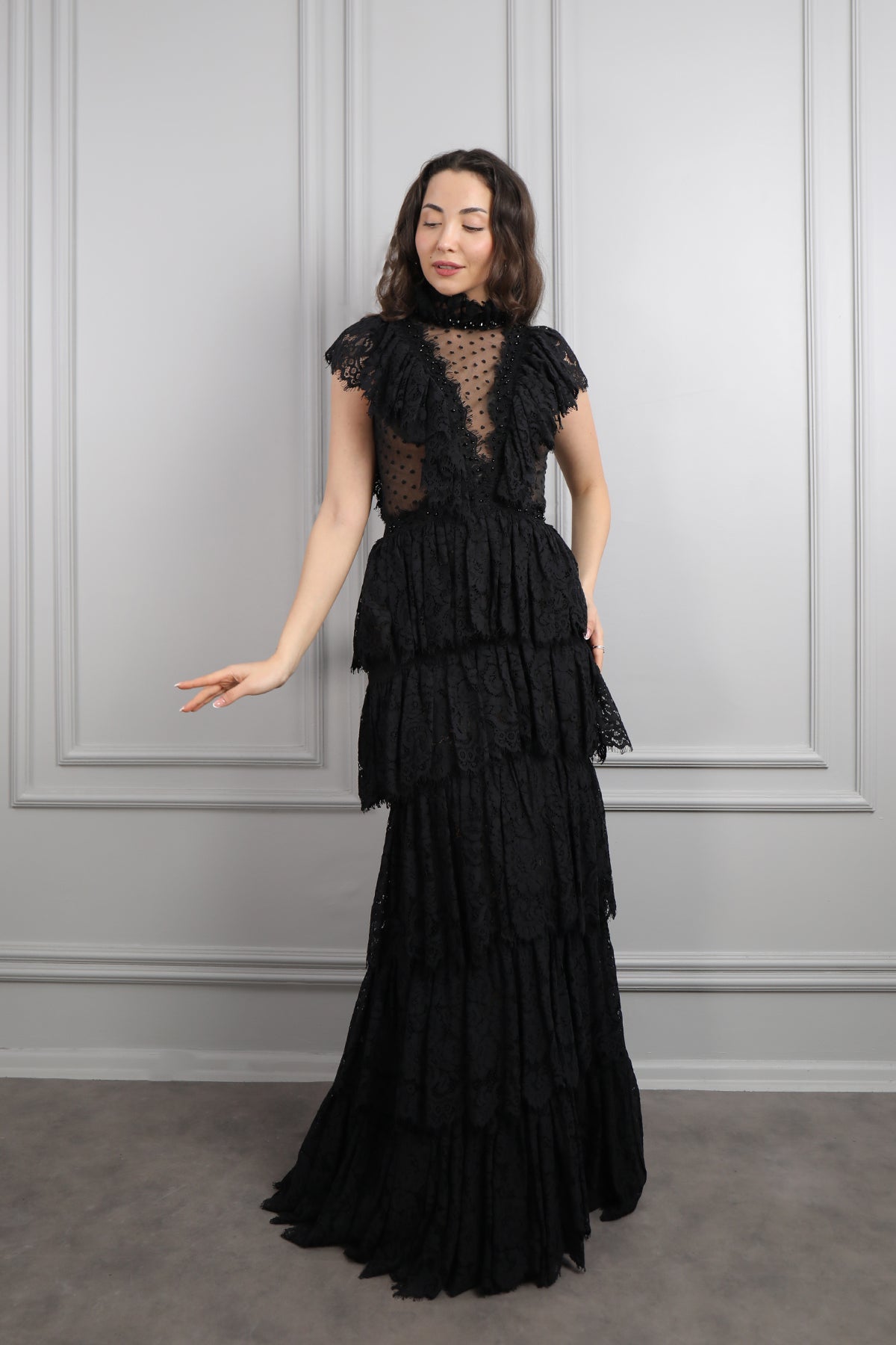Hakim Yaka Transparan Detaylı Fırfırlı Dantelli Büyük Beden Abiye Siyah
