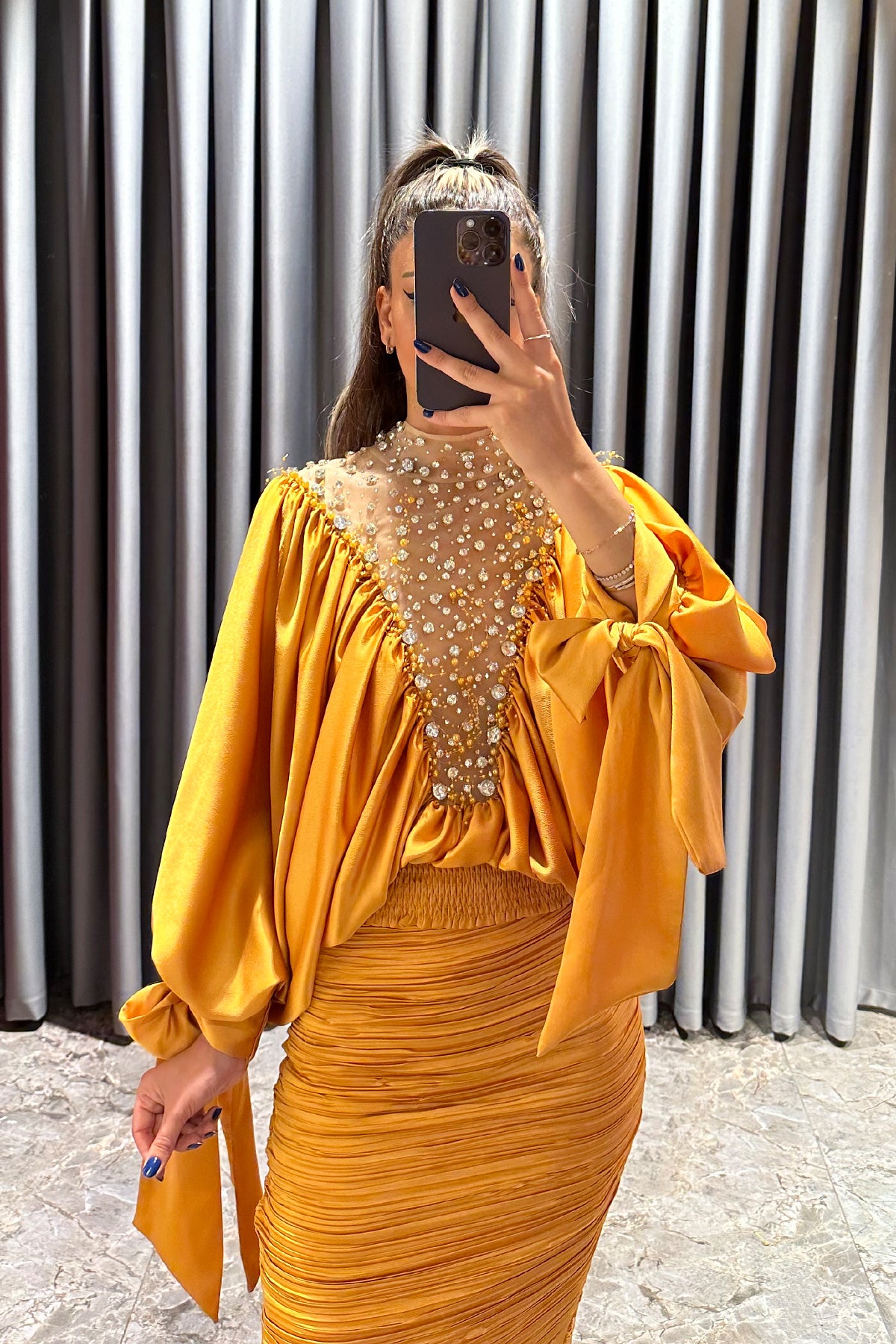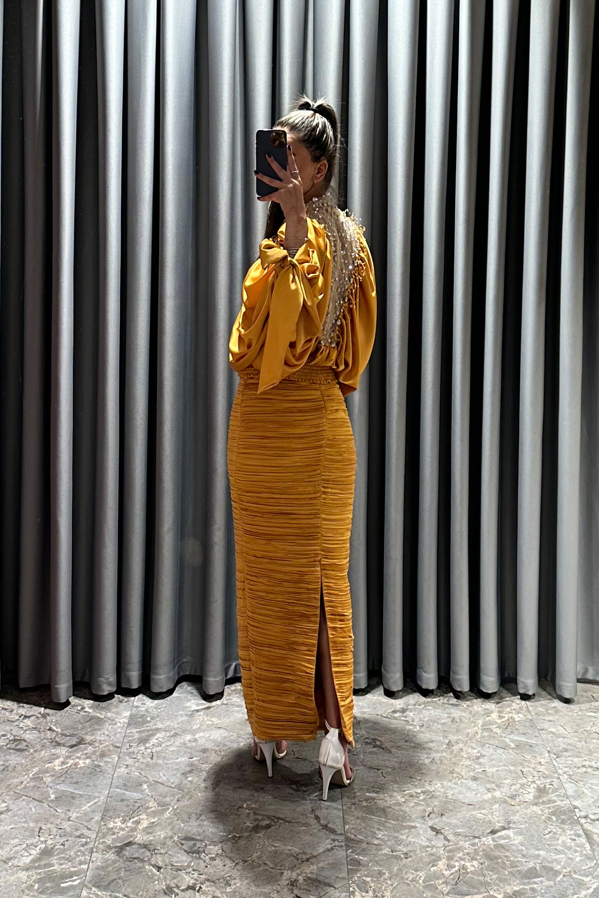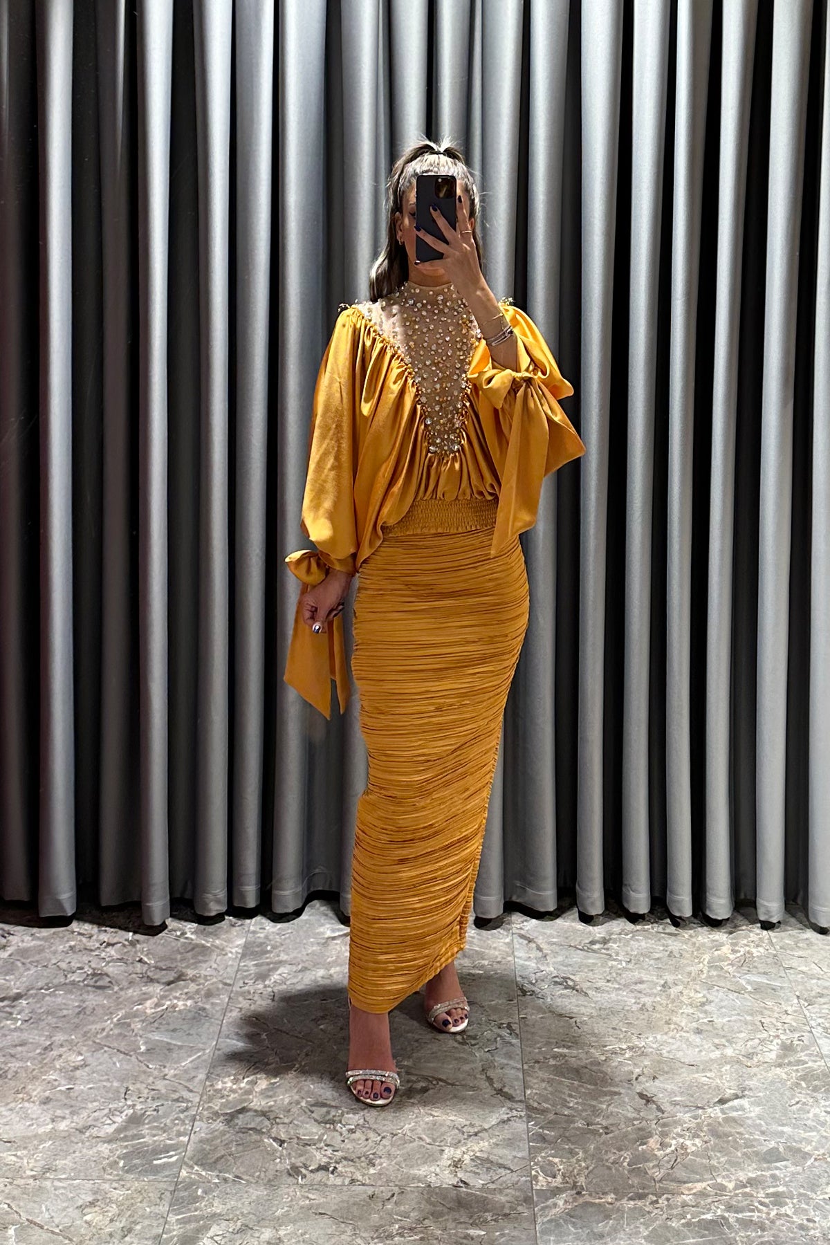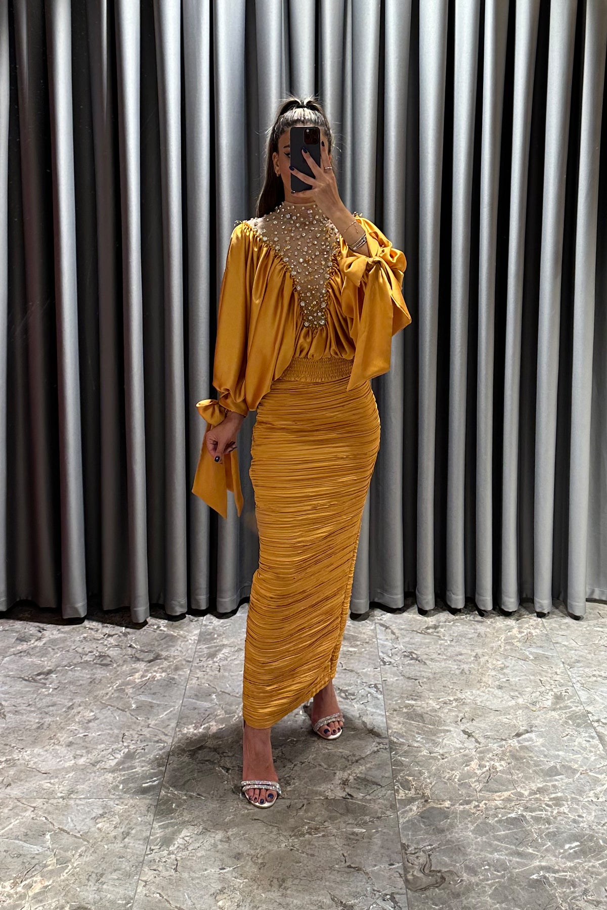 Yakası Taş İşlemeli Saten Etek Takım Hardal