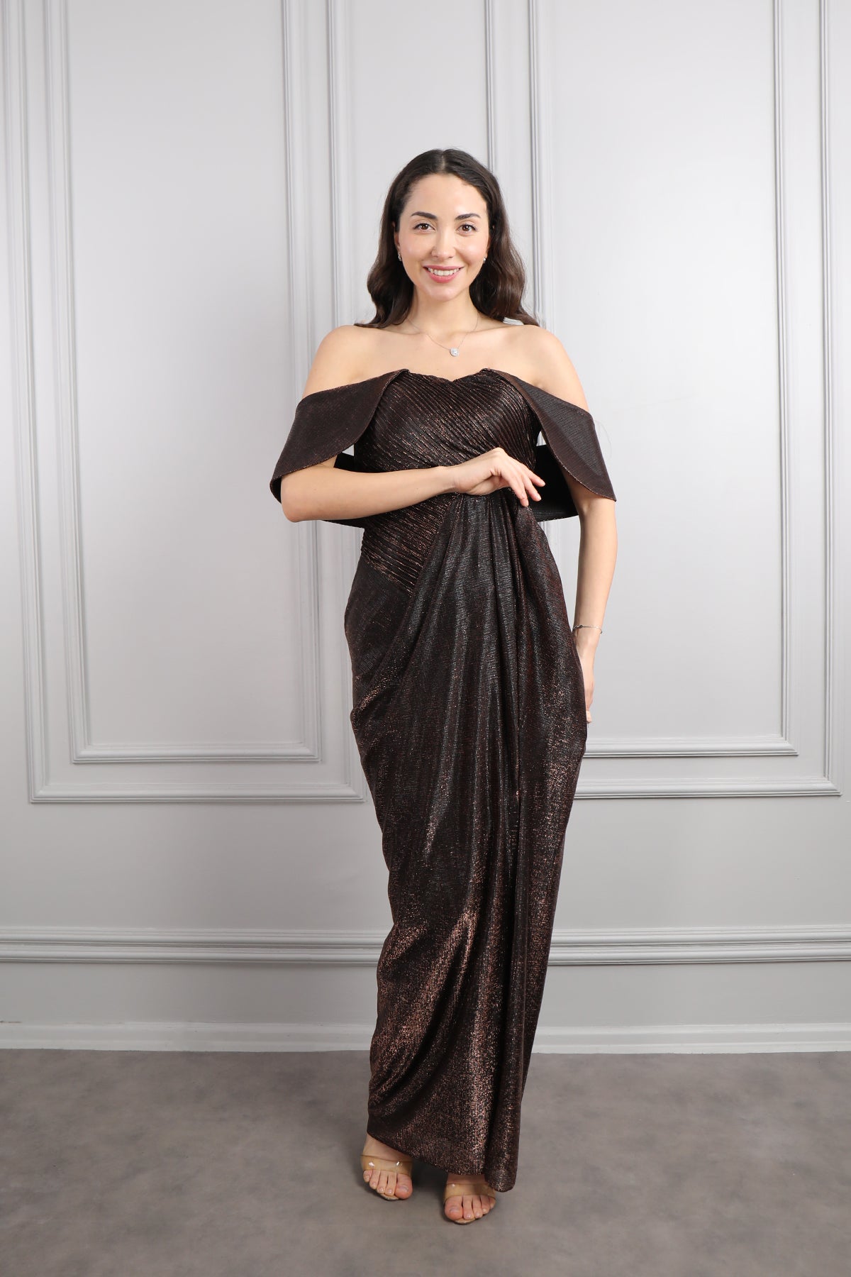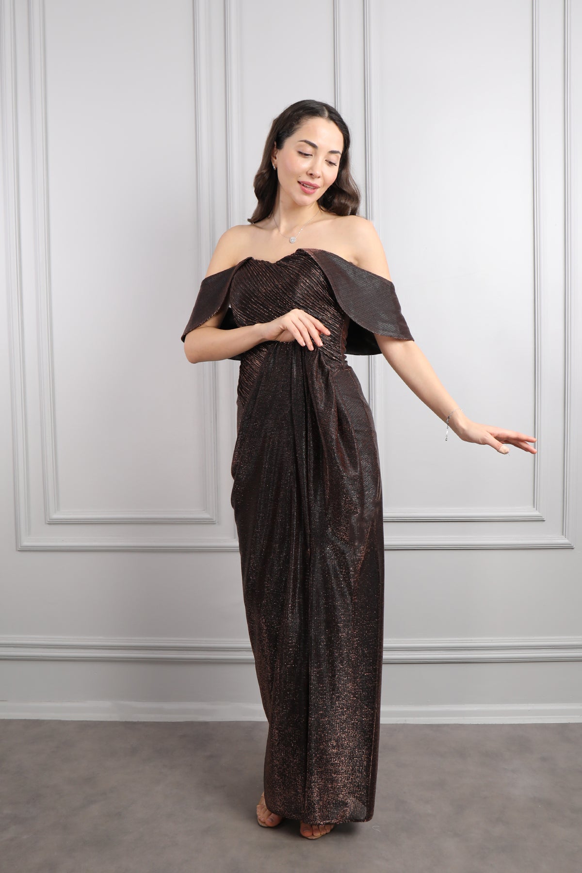 Hayık Yaka Önü Drapeli Yırtmaçlı Parlak Kumaş Abiye Bakır Özellikleri