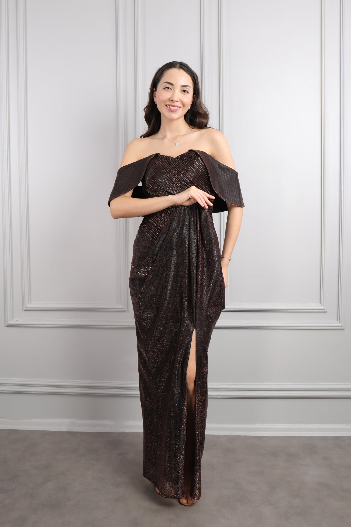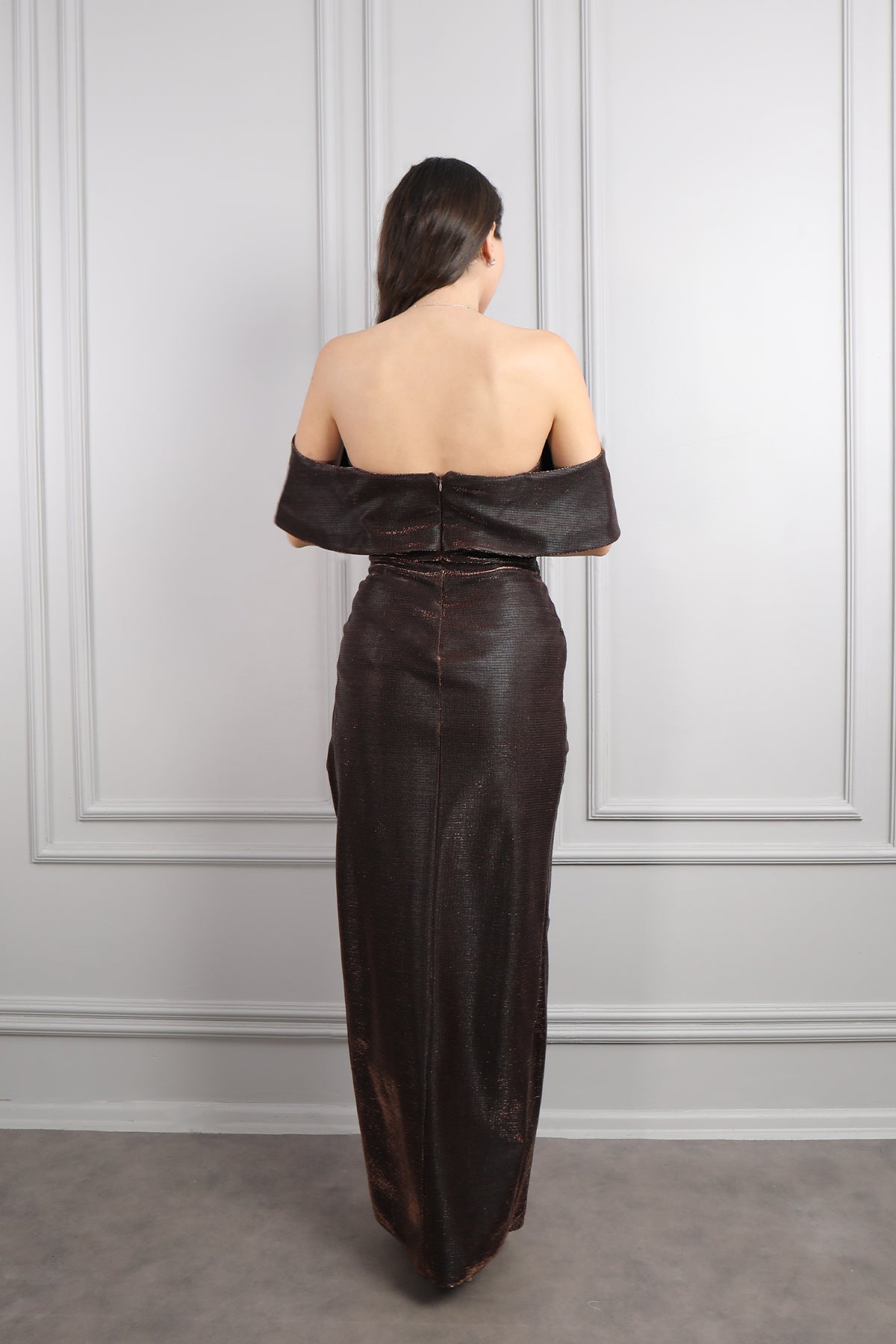 Hayık Yaka Önü Drapeli Yırtmaçlı Parlak Kumaş Abiye Bakır