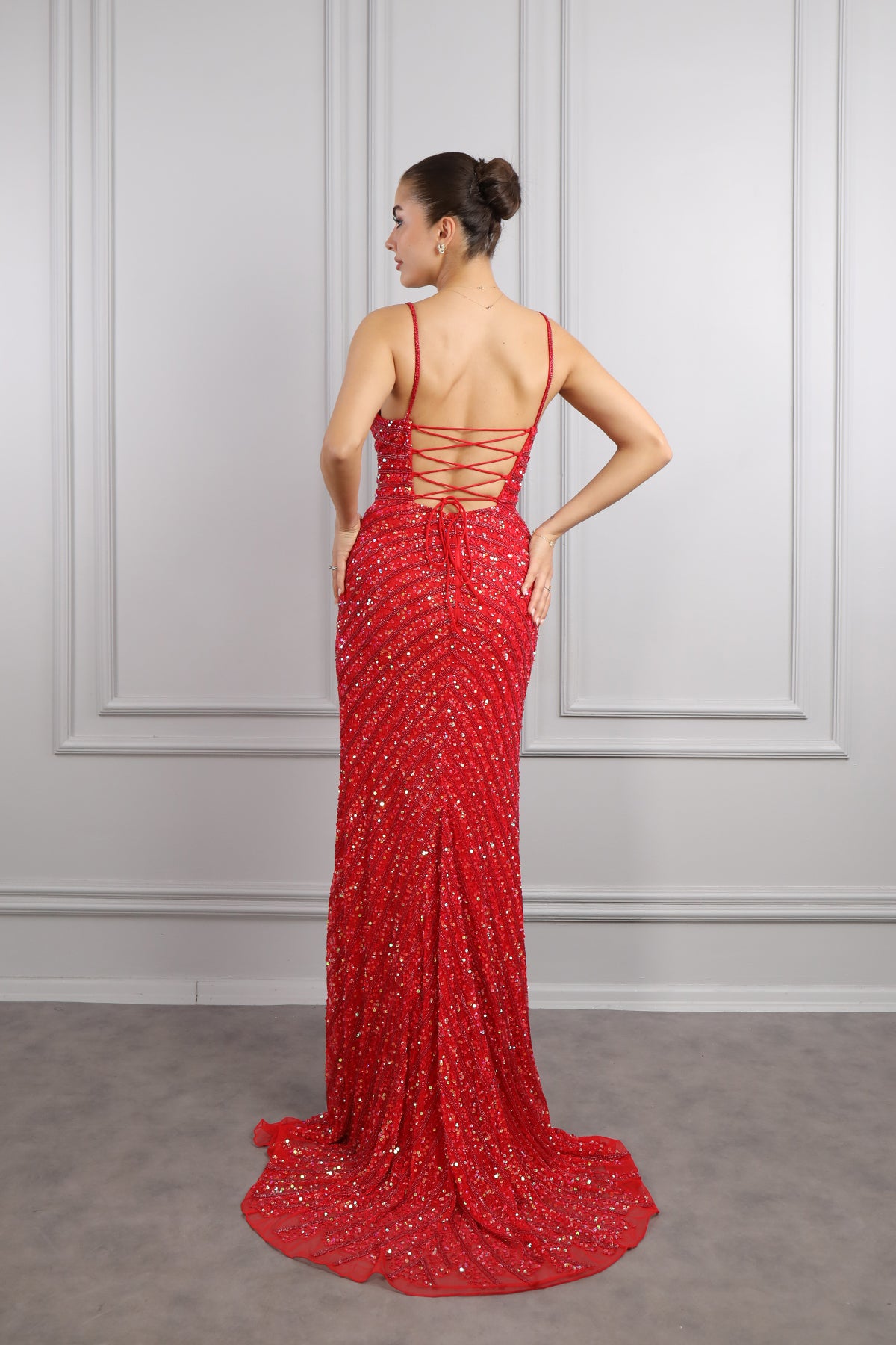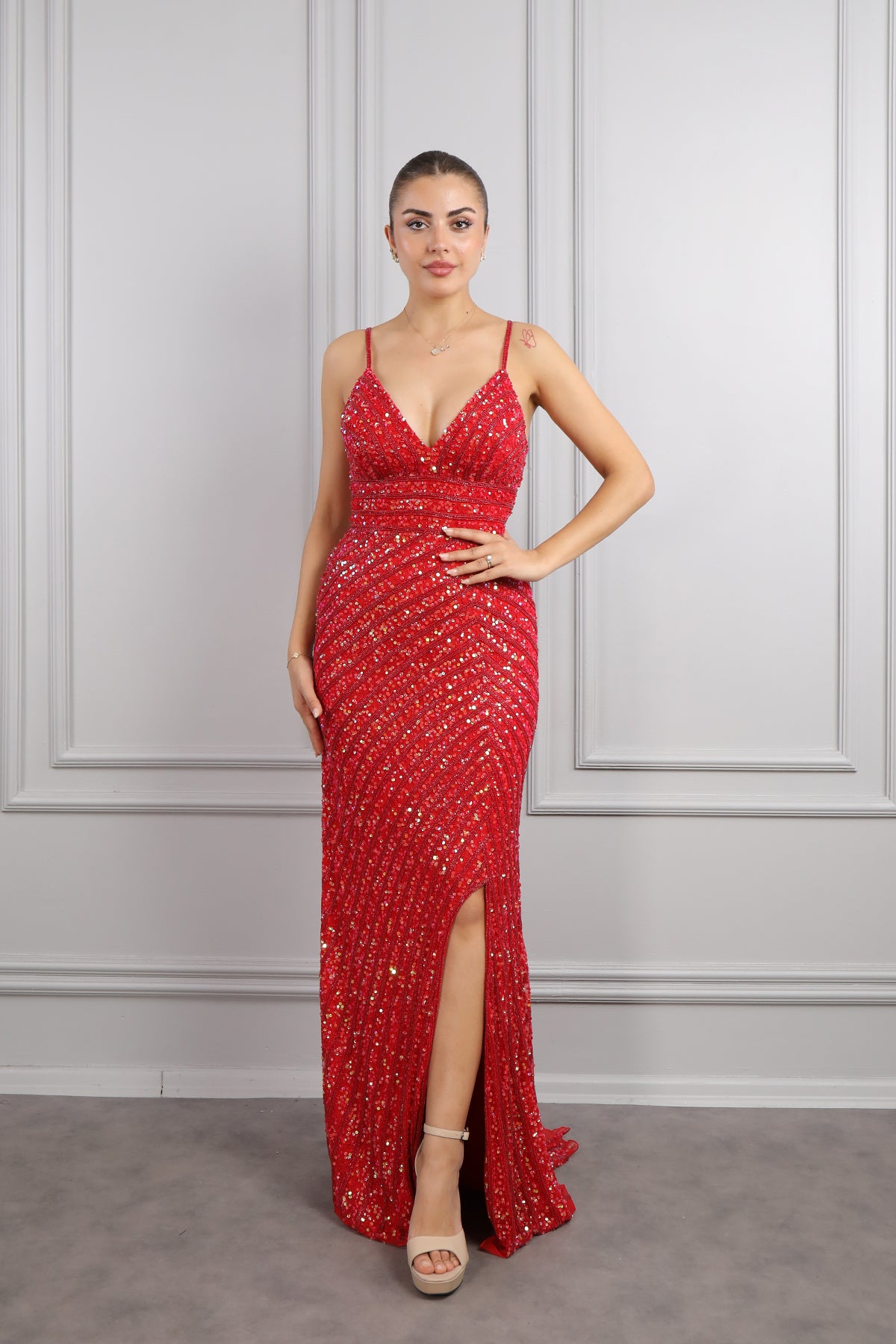 İnce Askılı Sırtı Bağlamalı Pul Payet İşlemeli Yırtmaçlı Tasarım Abiye Kırmızı