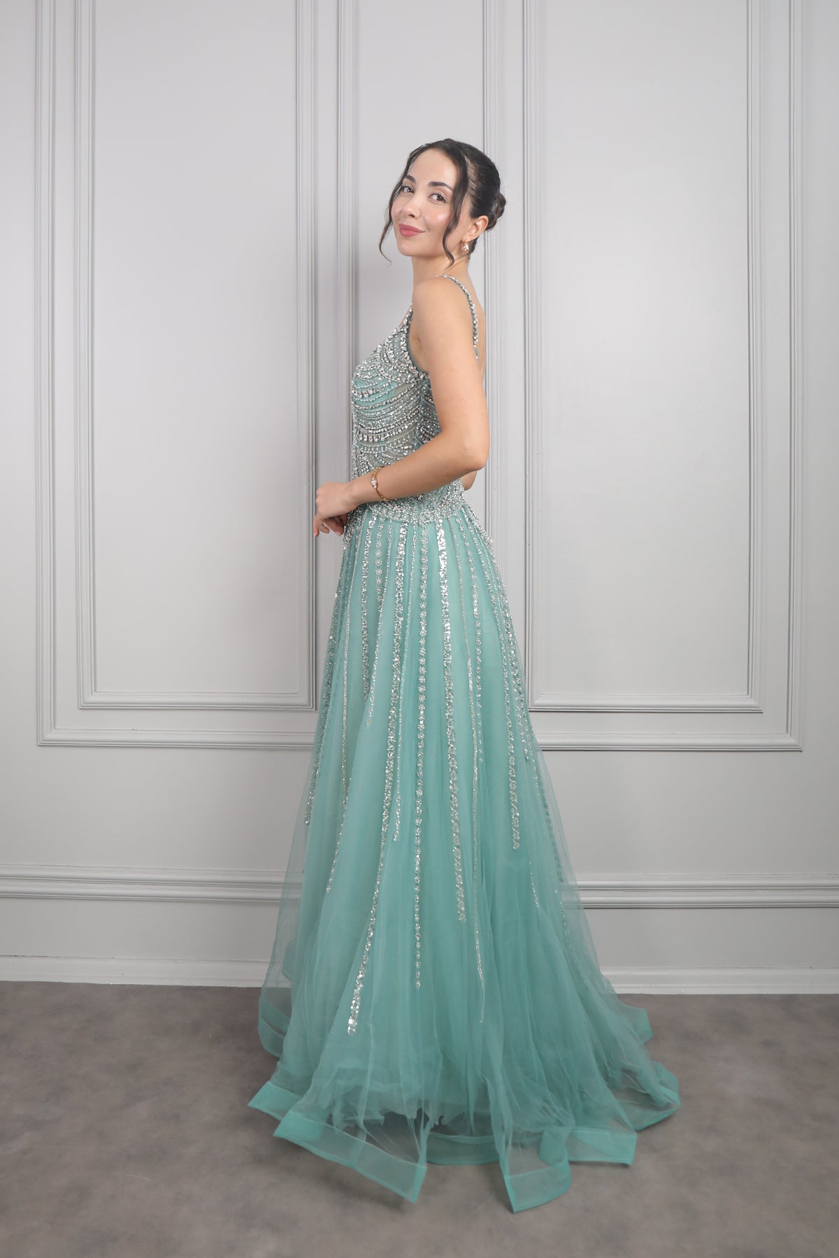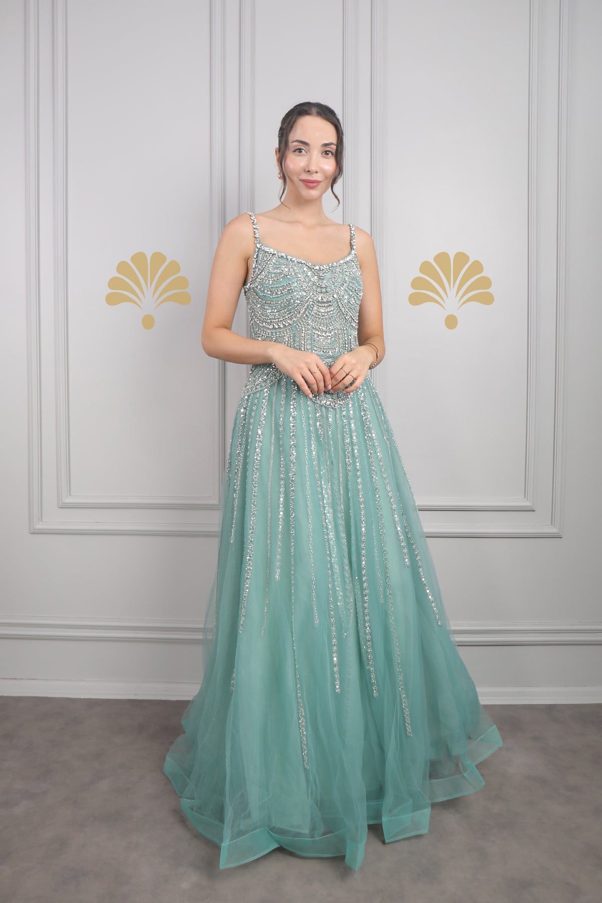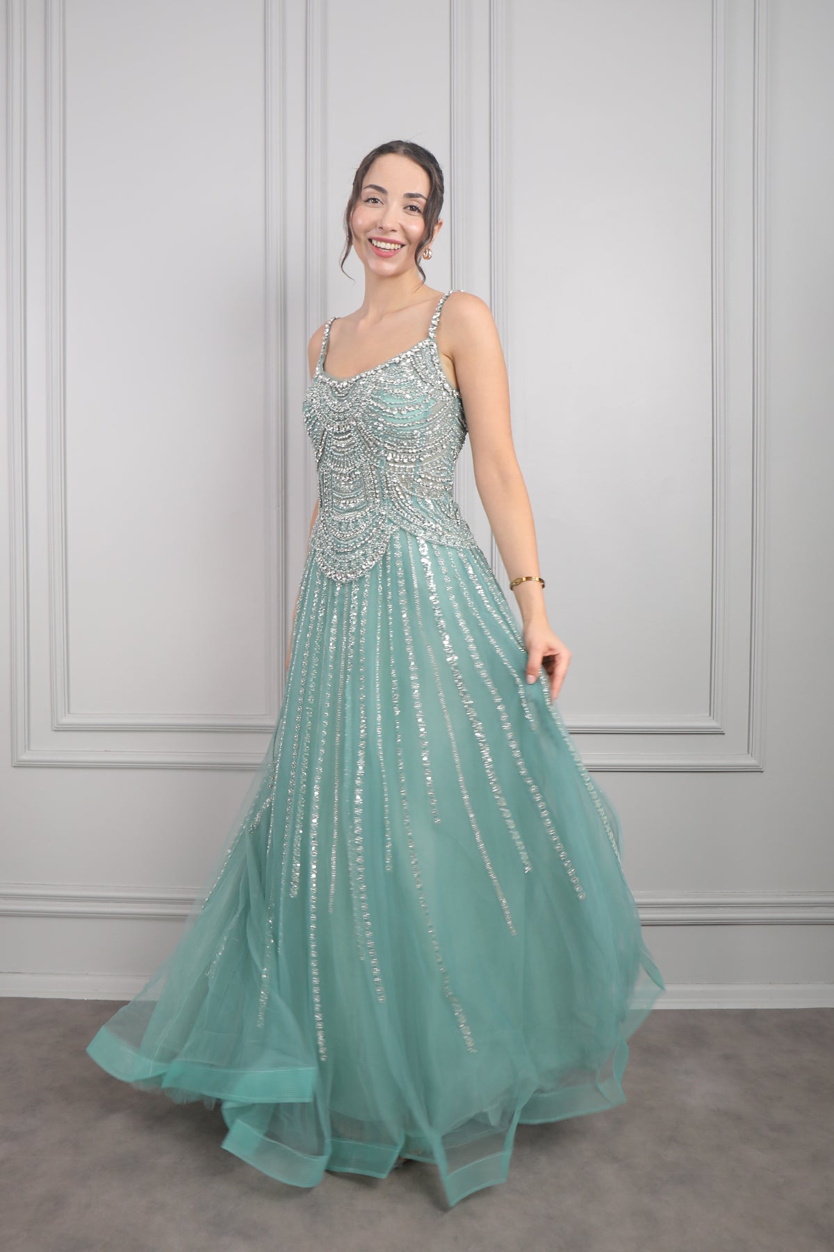 Yeşil tonlarıyla sunulan bu abiye, taş ve boncuk detayları sayesinde göz kamaştırıcı bir etkiye sahip. Tüllü etek kısmı ve ince askı yapısıyla hem zarif hem de modern bir duruş sergiler. Mezuniyet, düğün veya akşam davetleri için sofistike bir tercih.