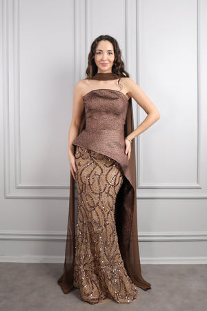 İnce Askılı Derin Dekolteli Önü Transparan Payetli Abiye Bej