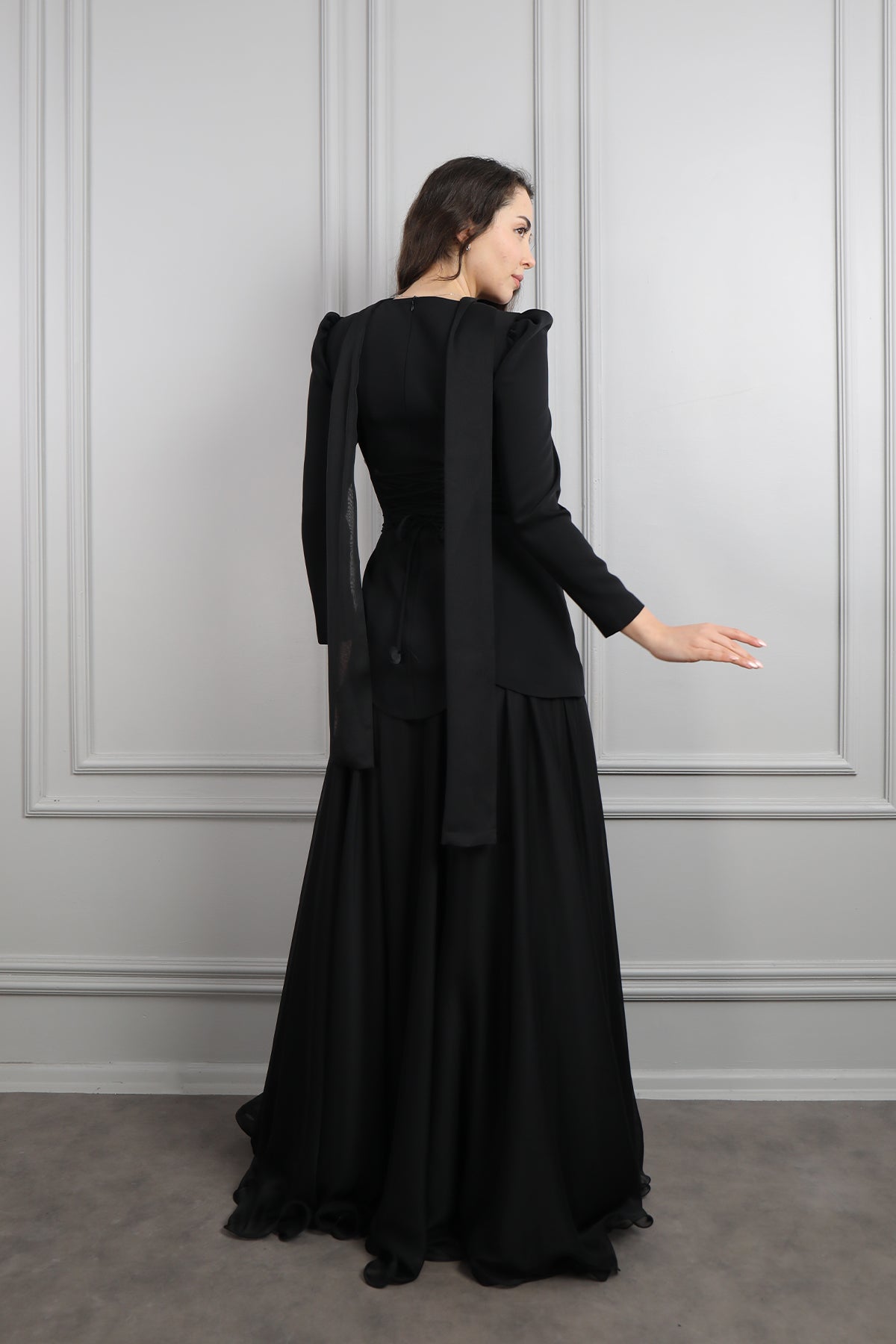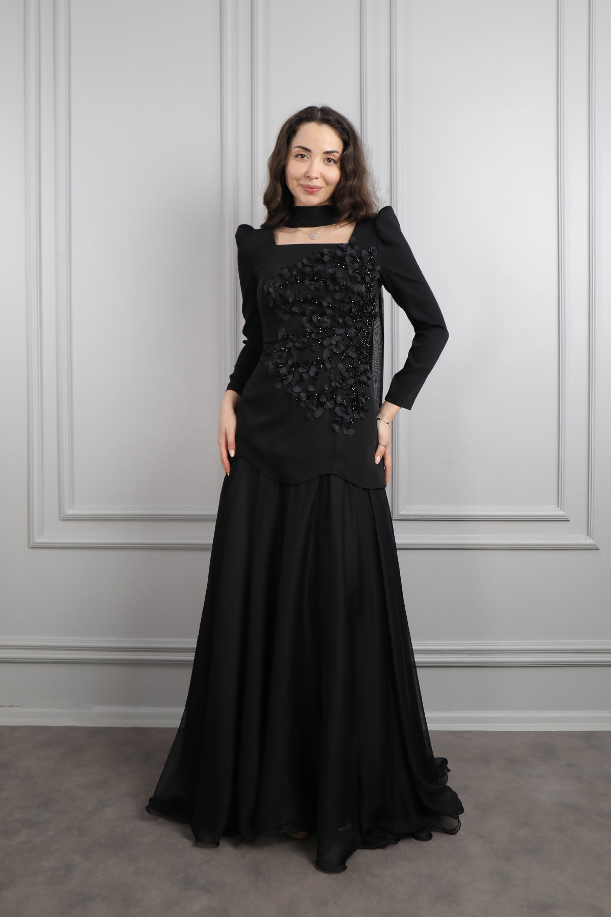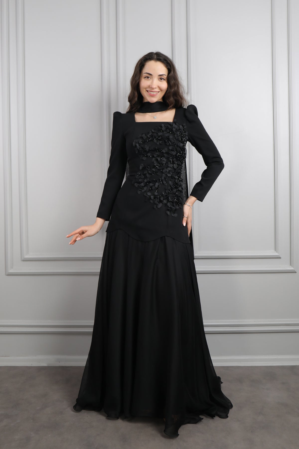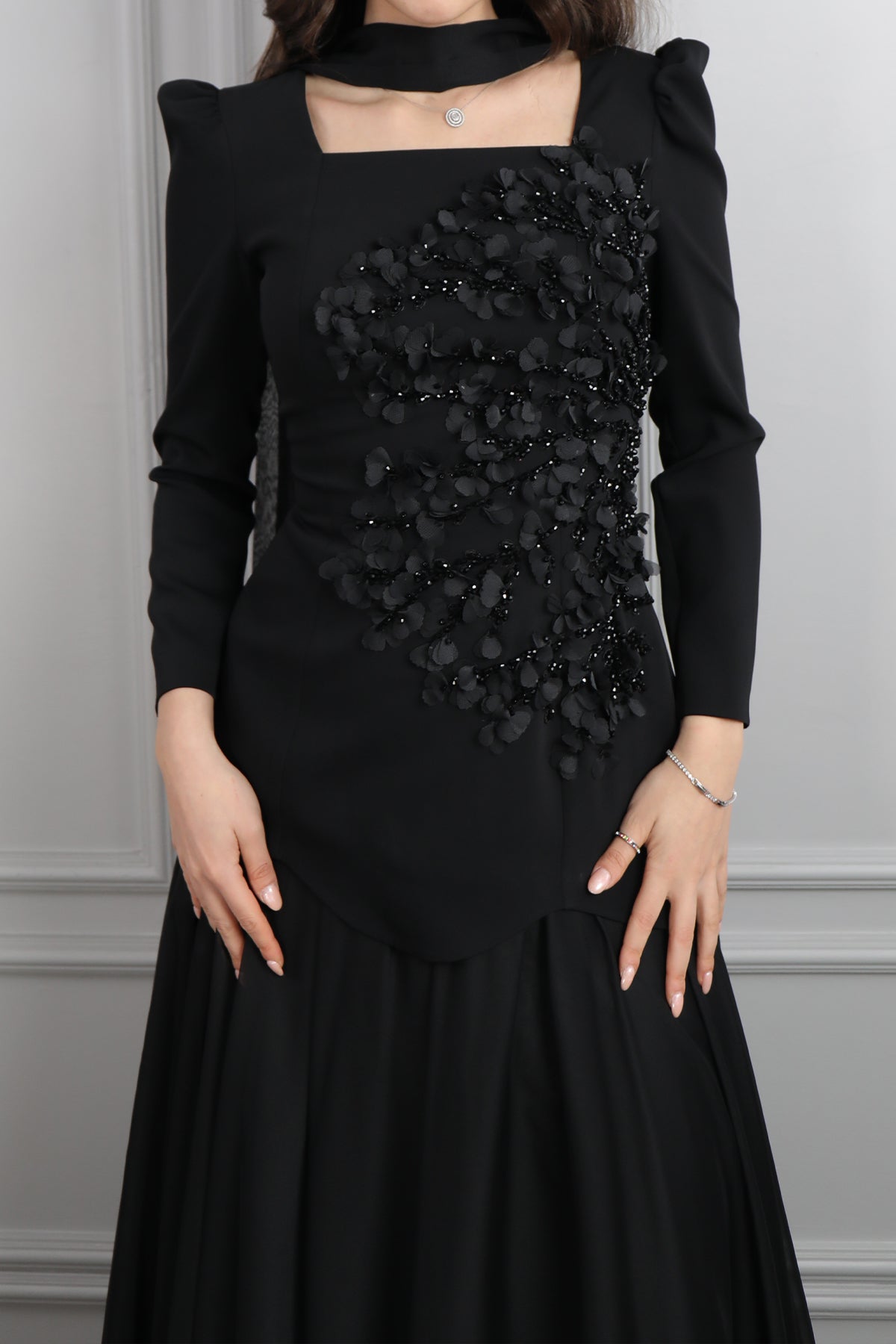 Kare Yaka Boncuk İşlemeli Fular Detaylı Şifon Etek Takım Siyah Özellikleri