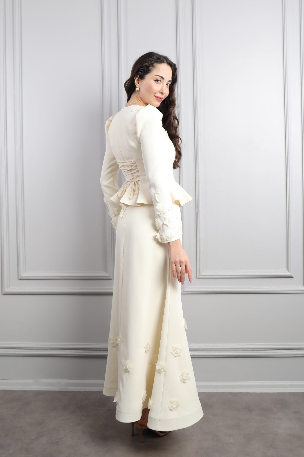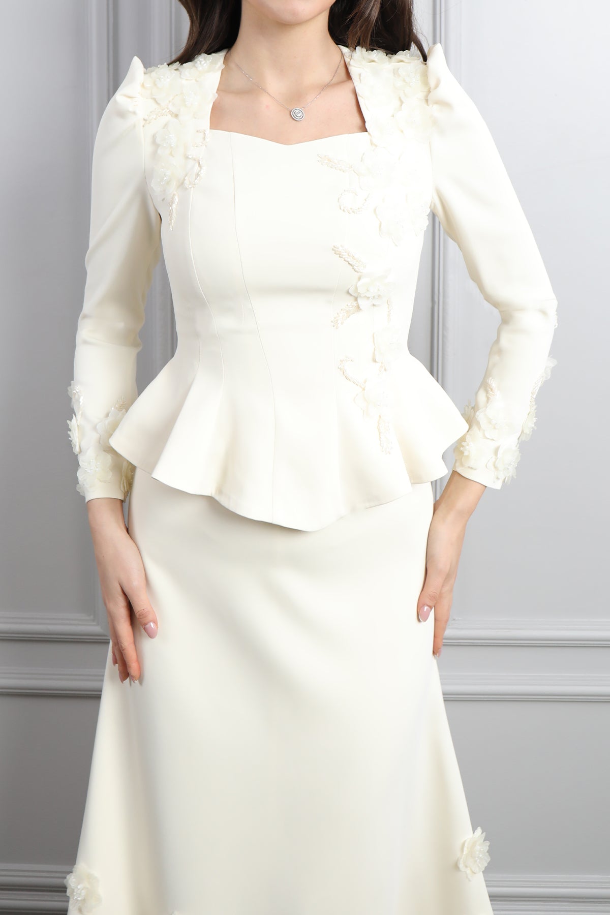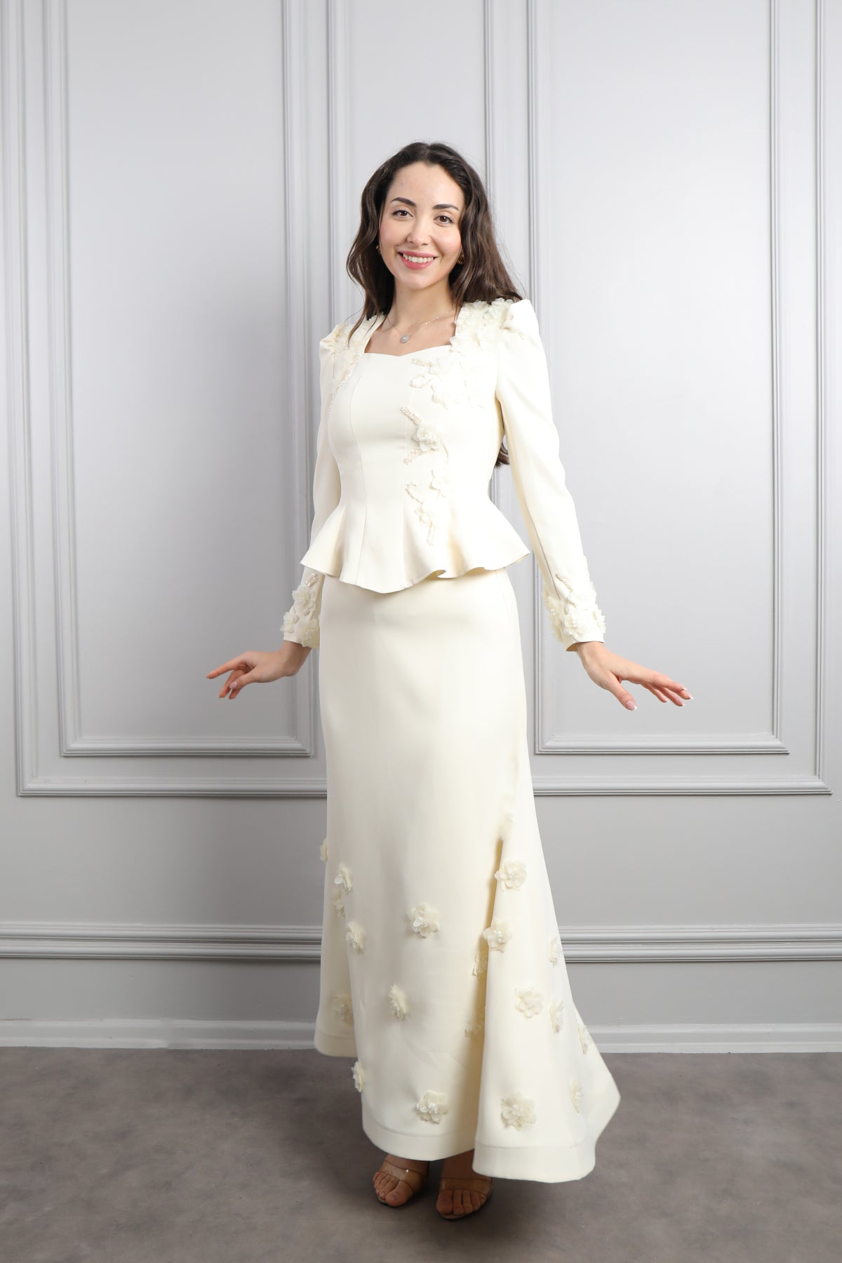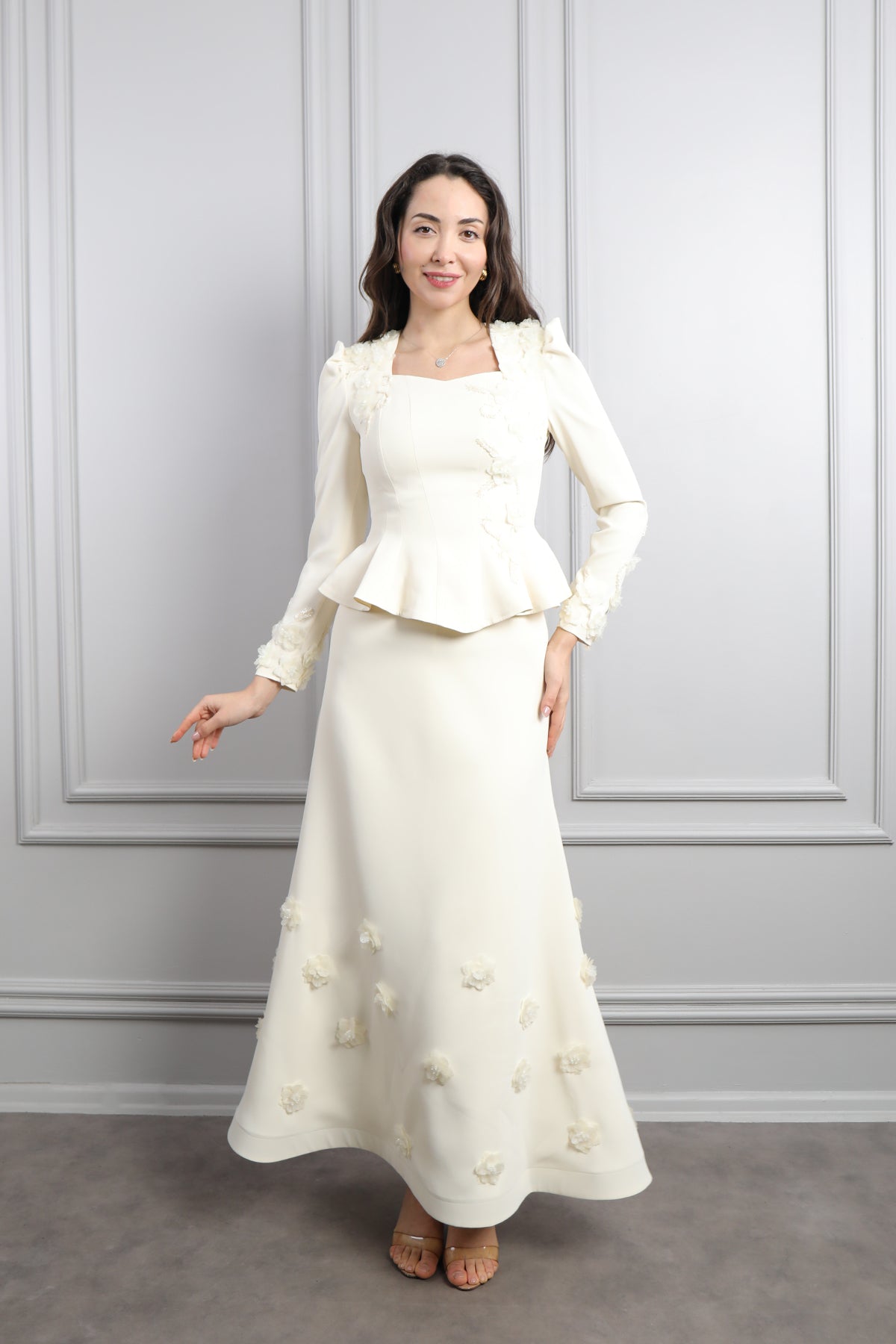 Kare Yaka Çiçek Detaylı Etek Takım Ekru