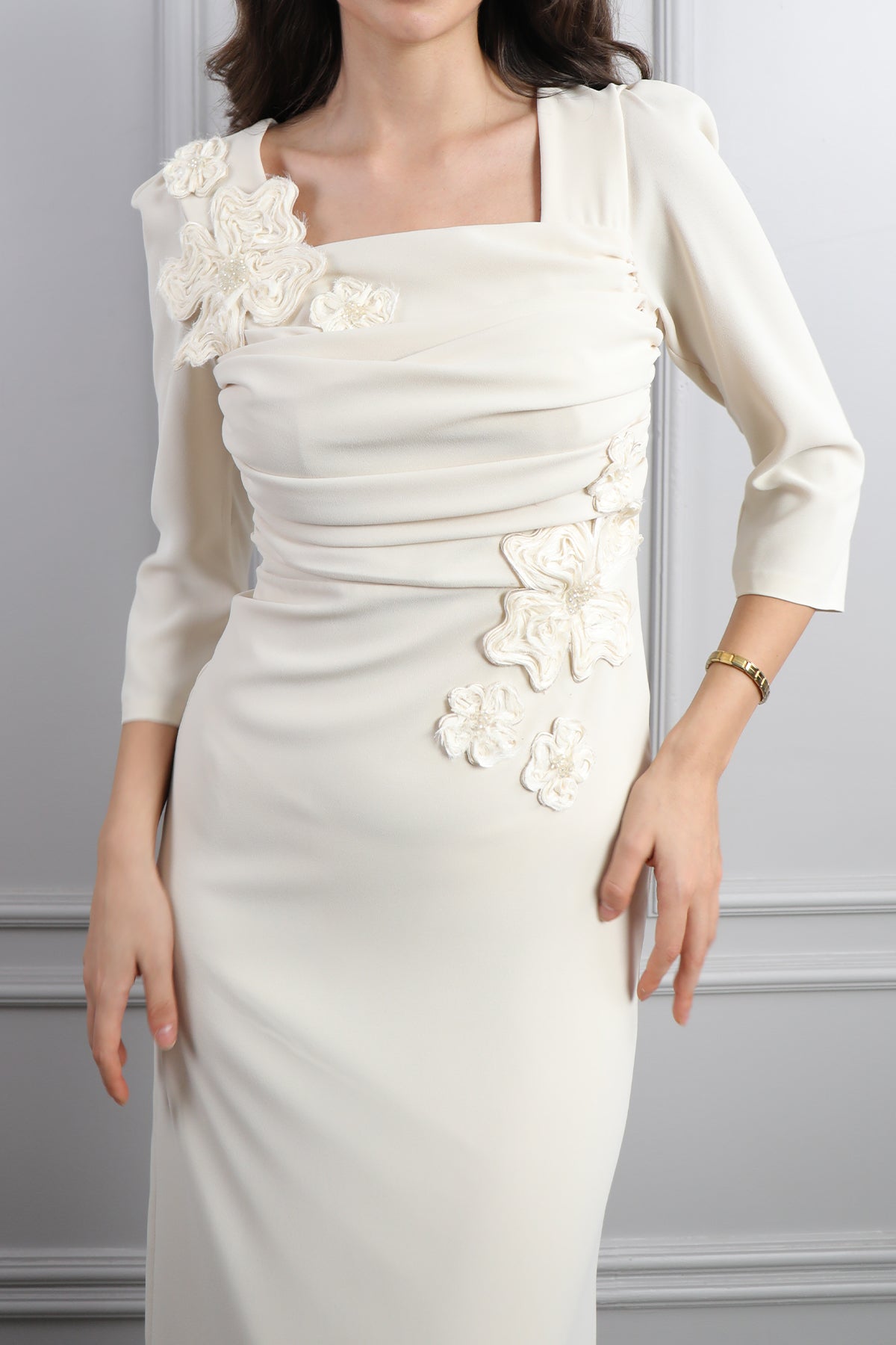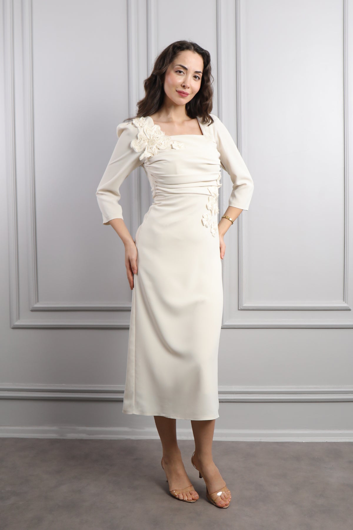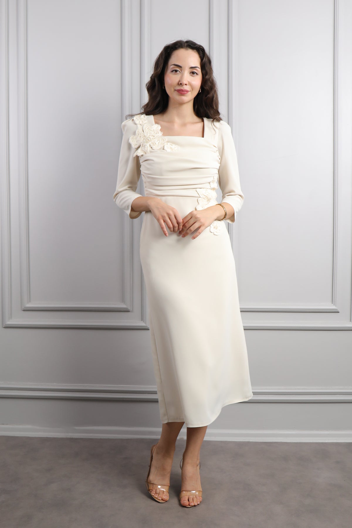 Kare Yaka Çiçek Detaylı Midi Boy Elbise Taş