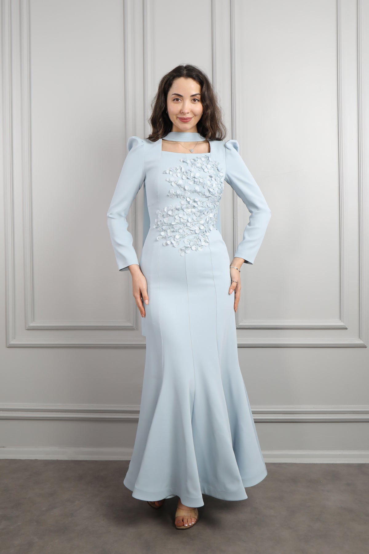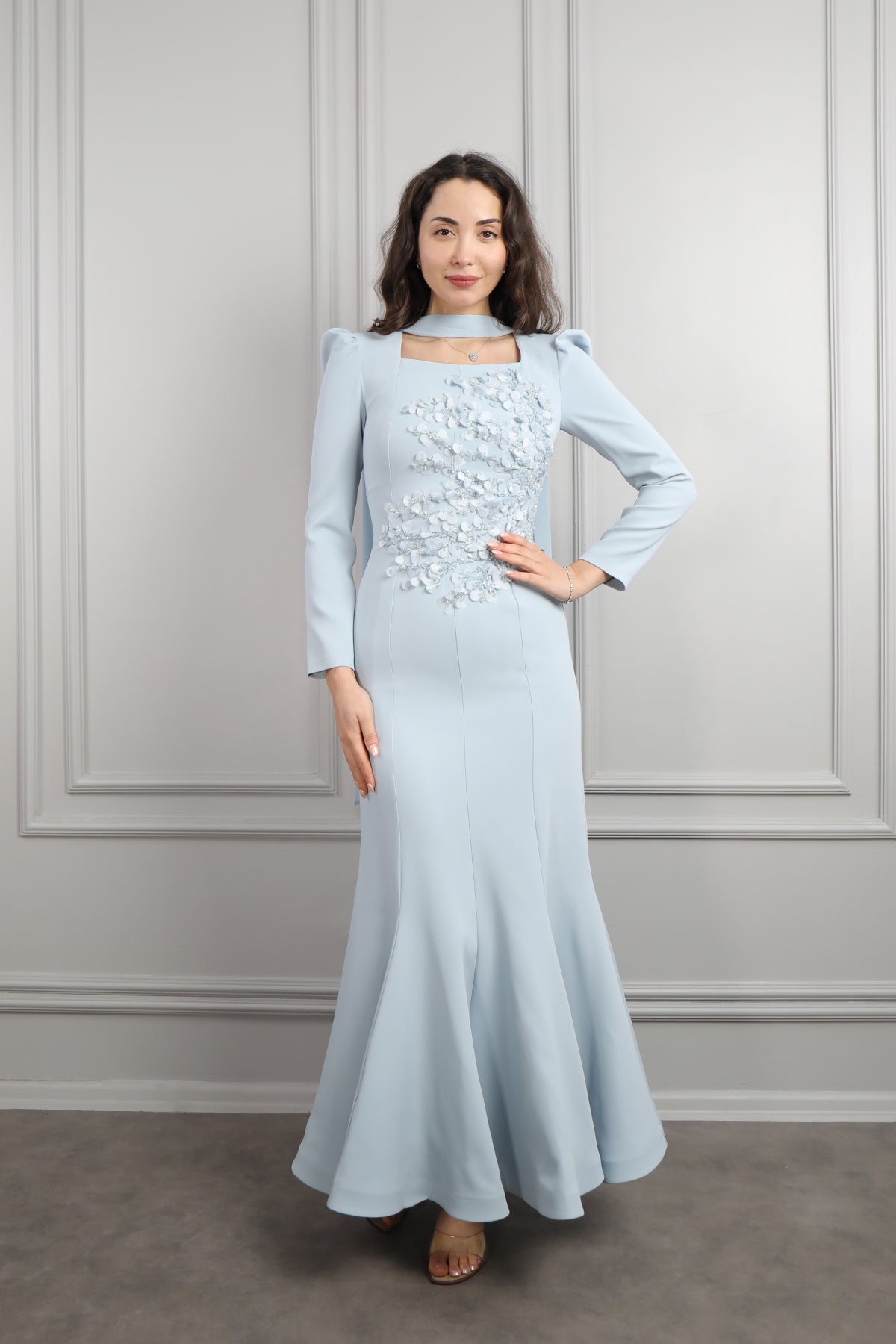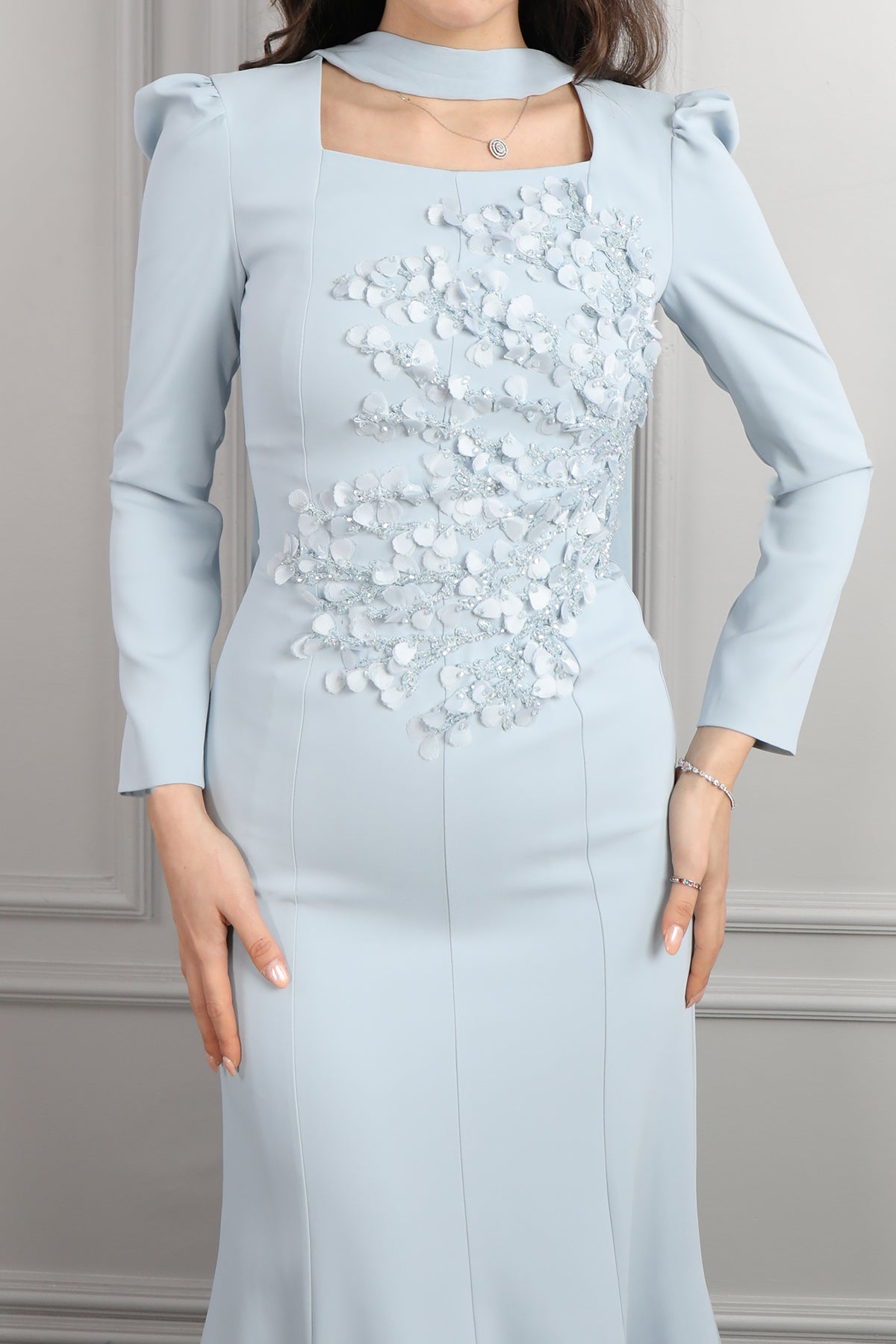Kare Yaka Çiçekli Fular Detaylı Elbise Mavi Özellikleri