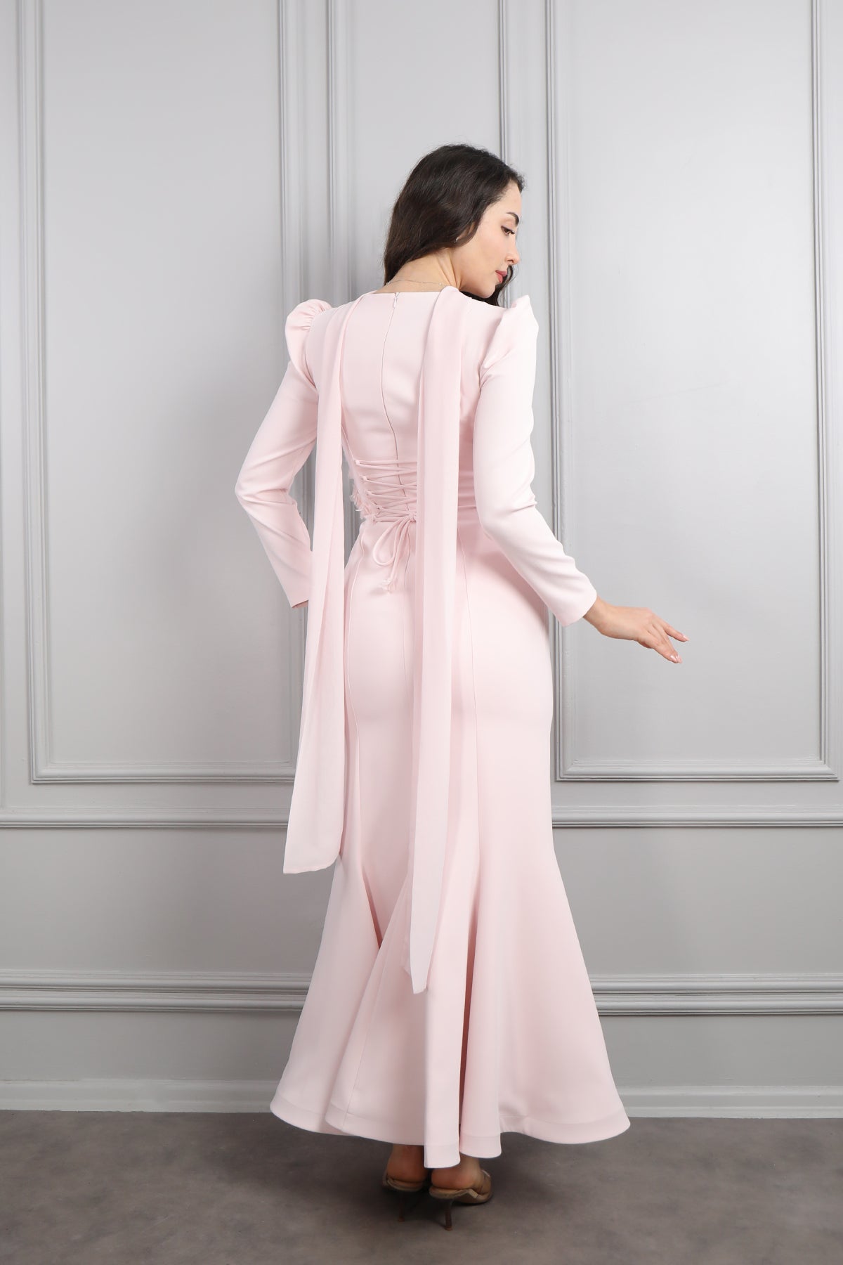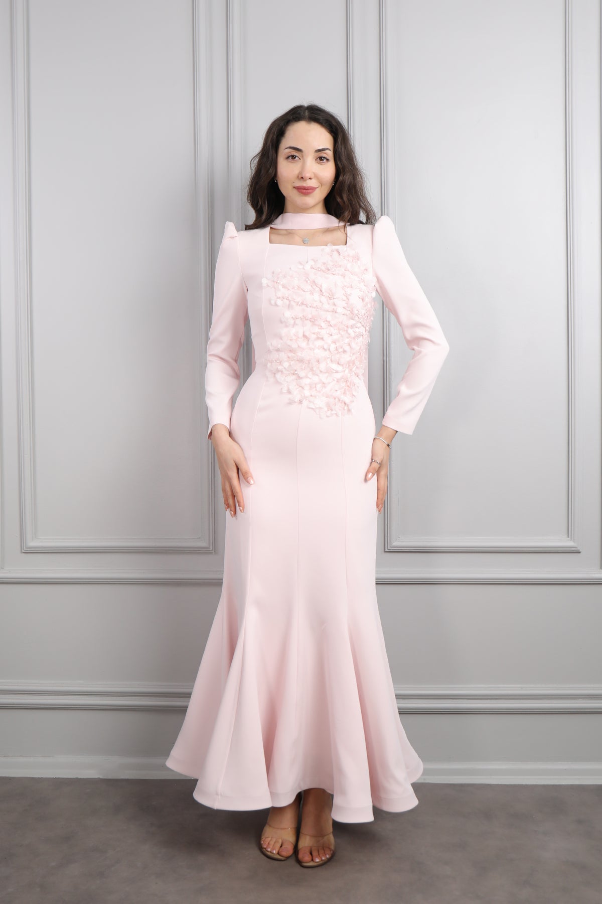 Kare Yaka Çiçekli Fular Detaylı Elbise Pudra Özellikleri