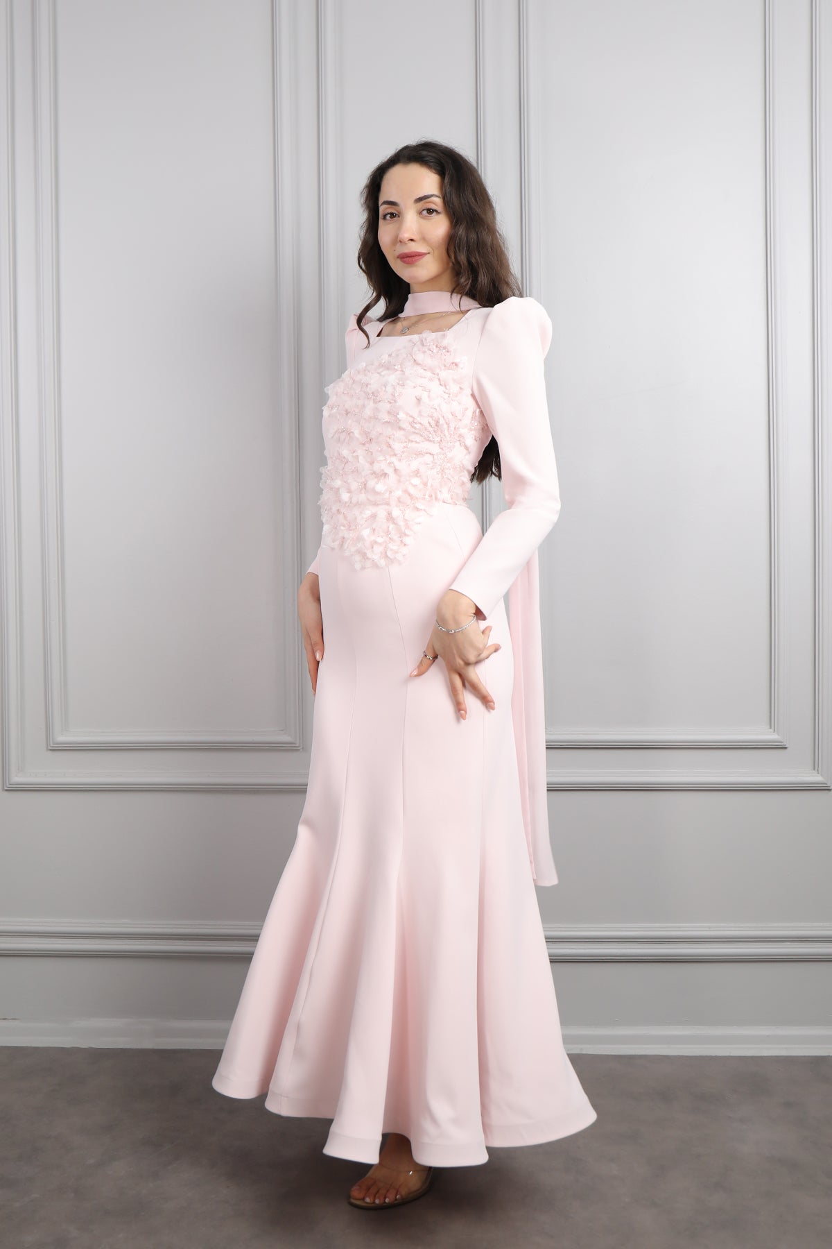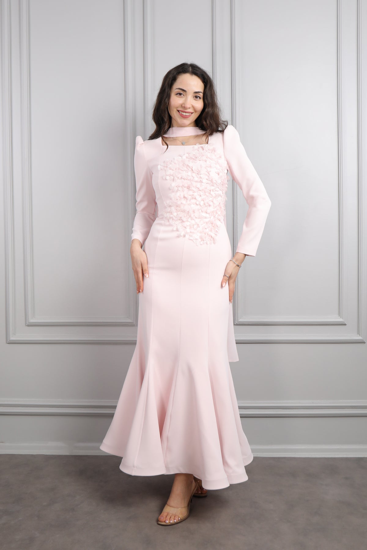 Kare Yaka Çiçekli Fular Detaylı Elbise Pudra