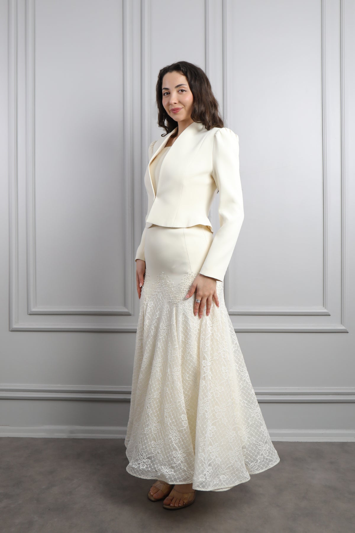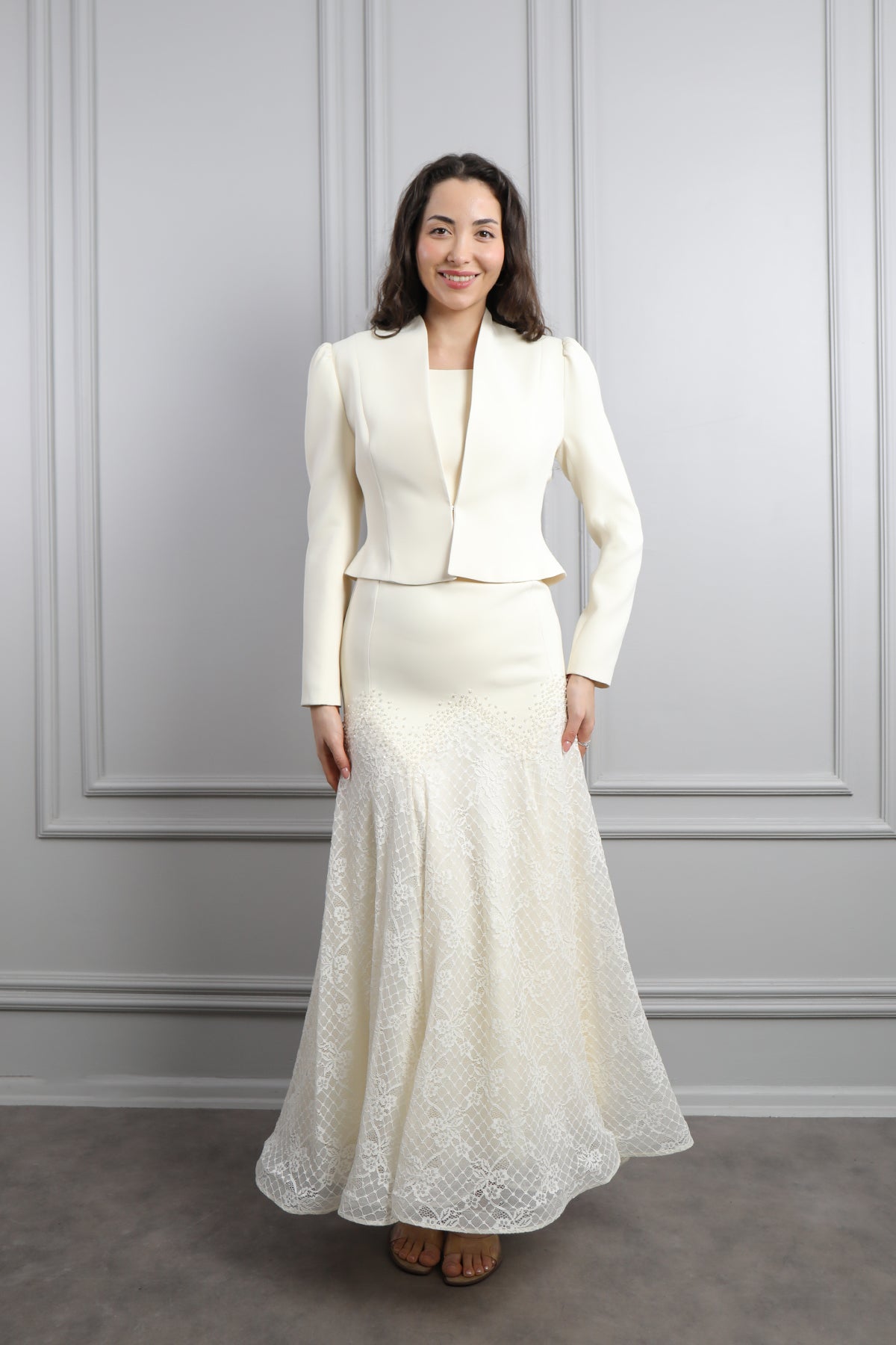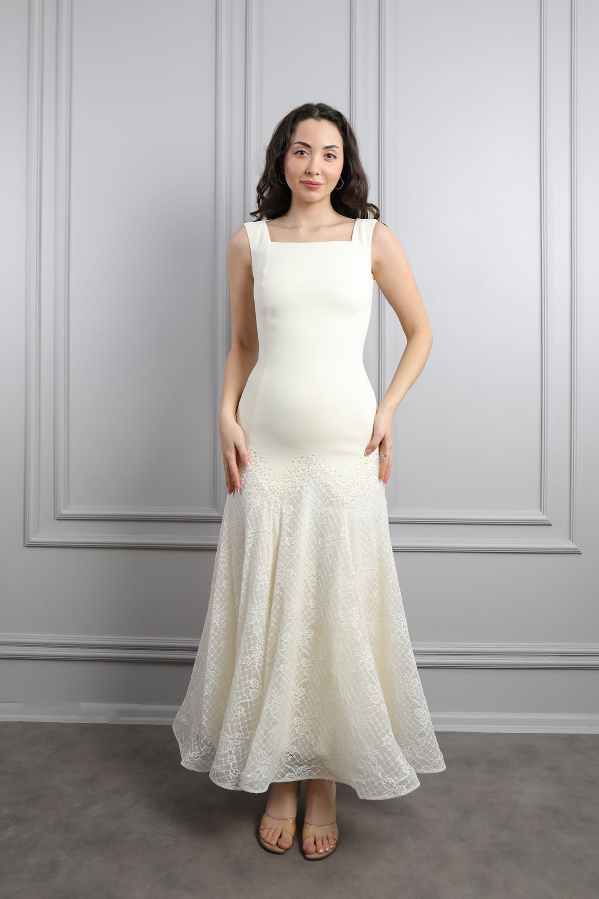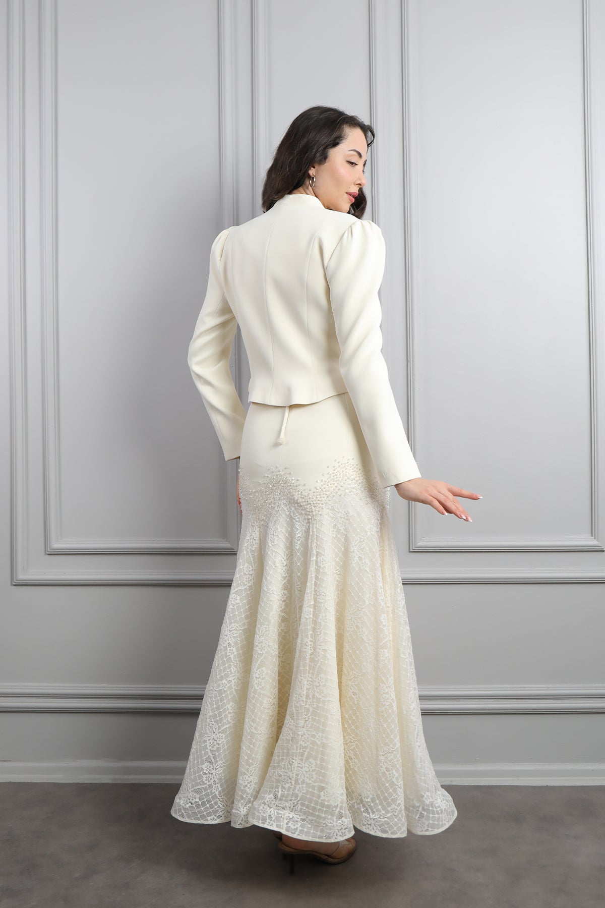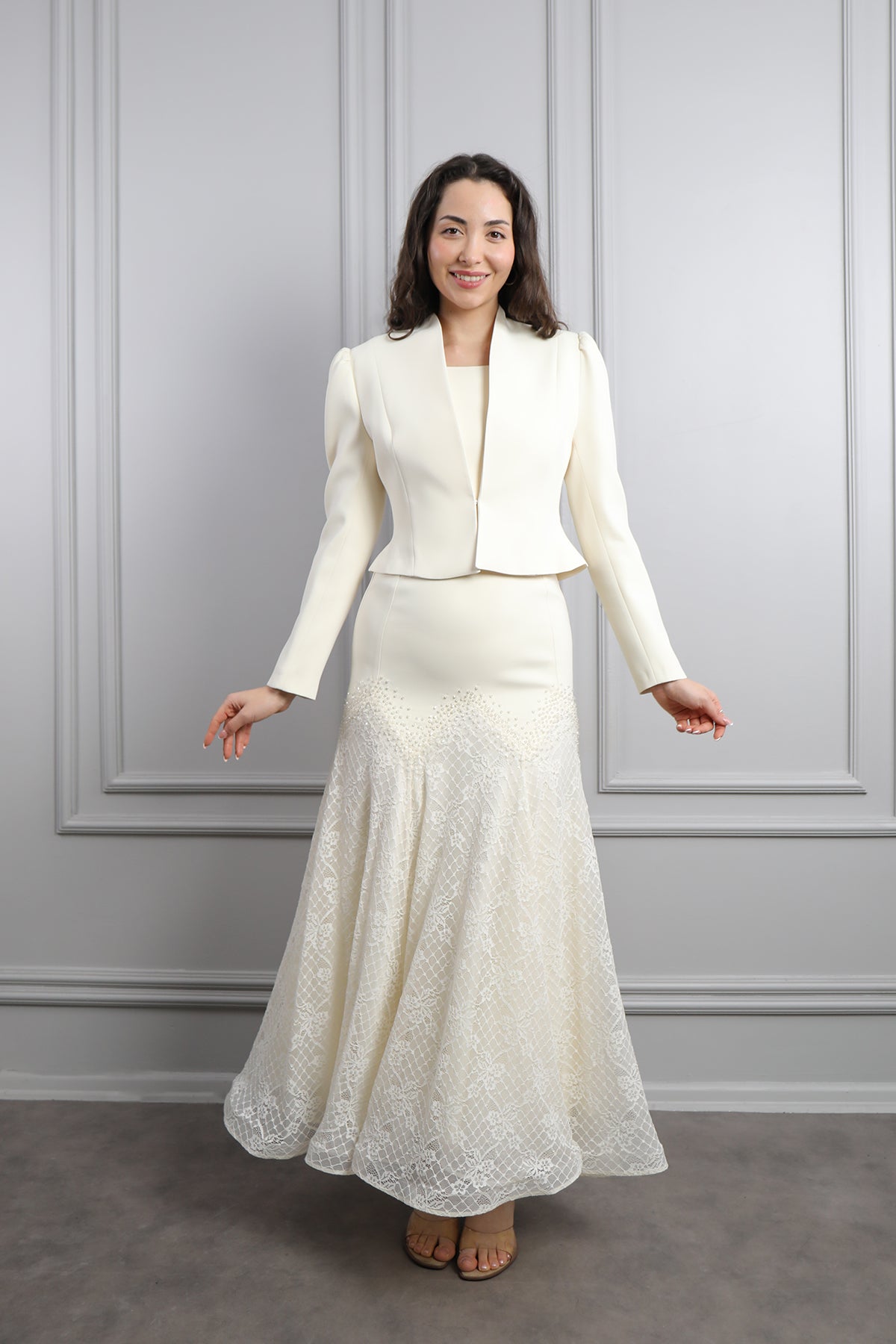 Kare Yaka Eteği Dantelli Elbise Takım Ekru