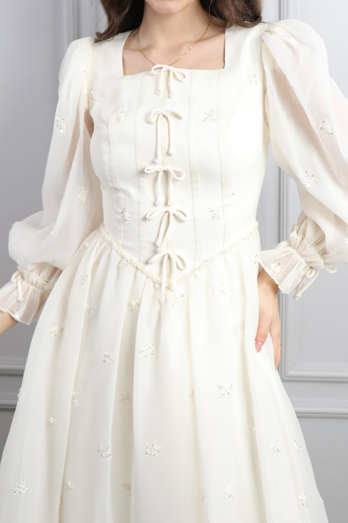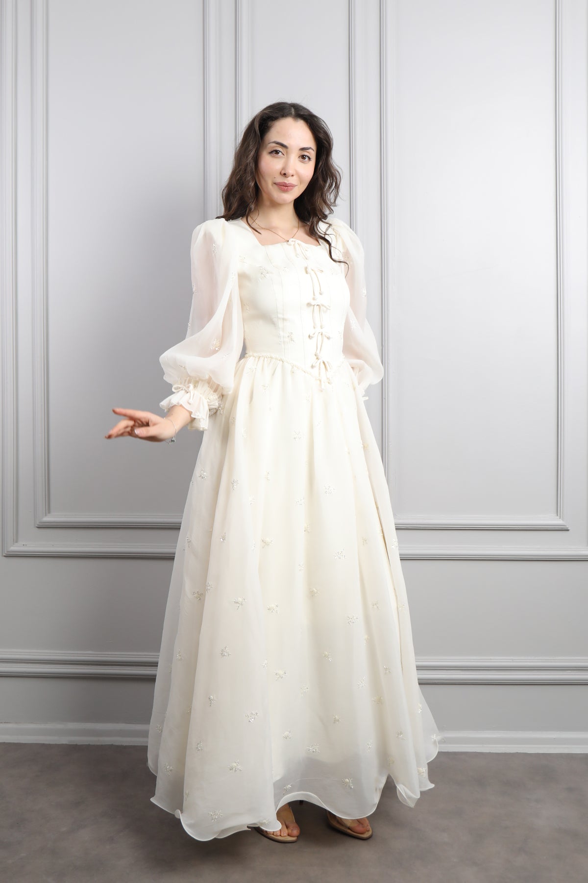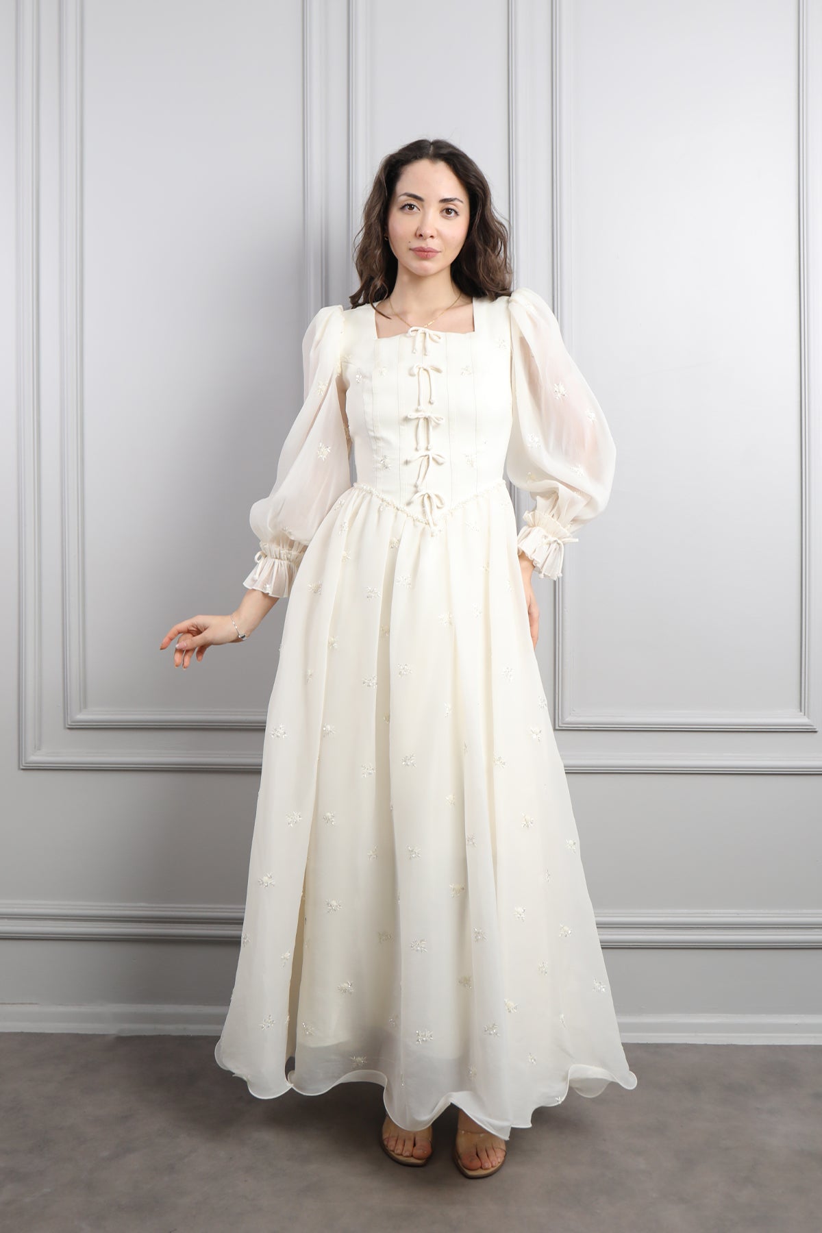 Kare Yaka Önü Kurdele Detaylı Şifon Elbise Ekru Özellikleri