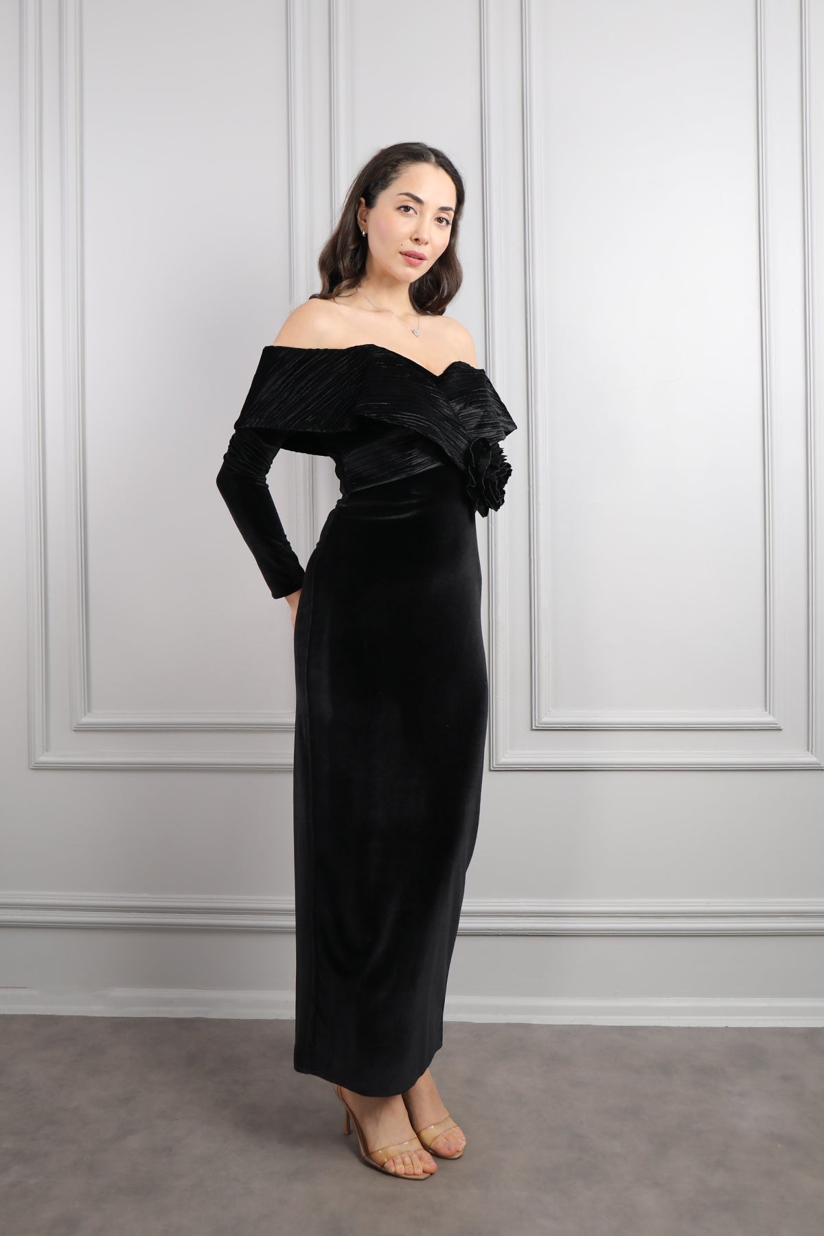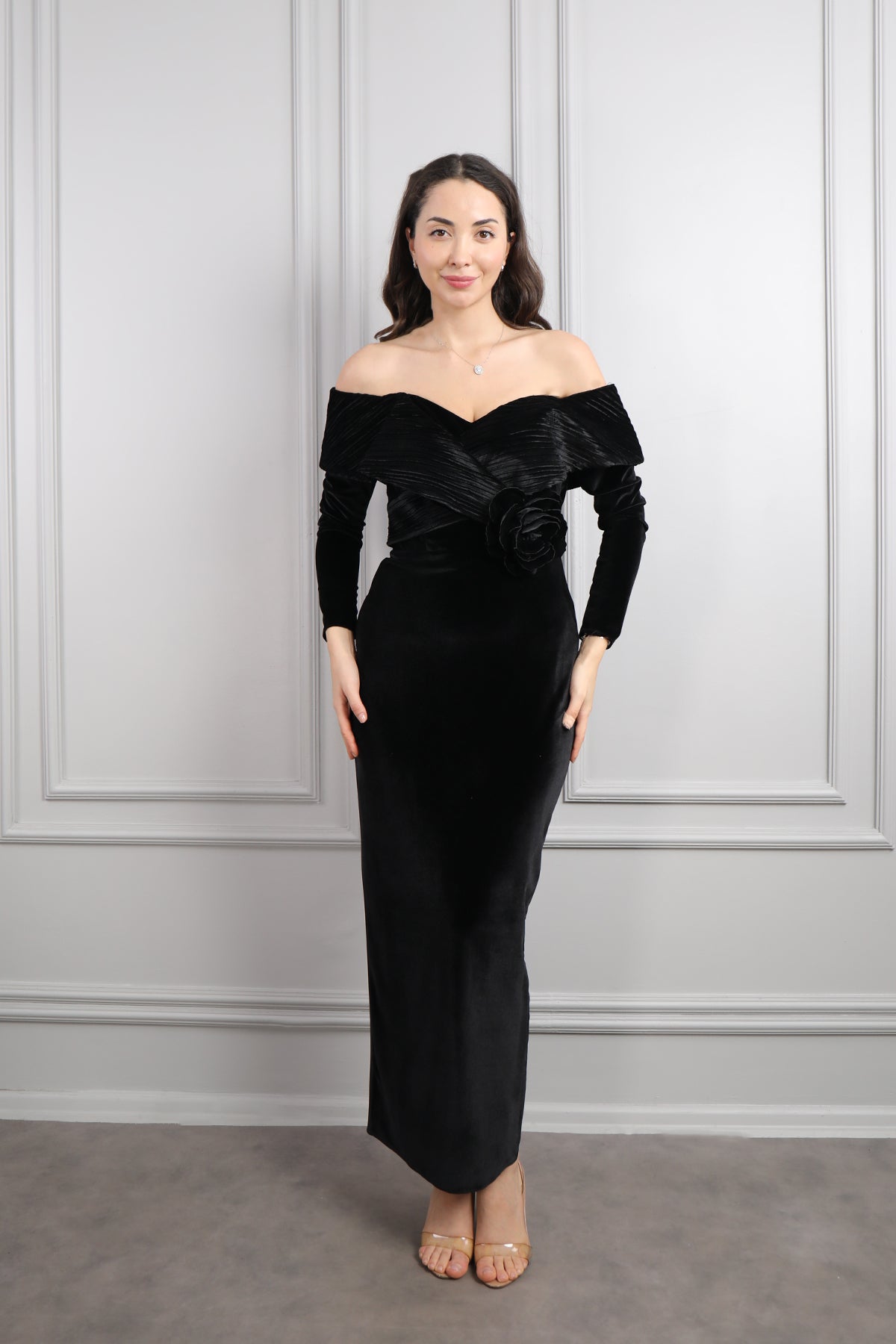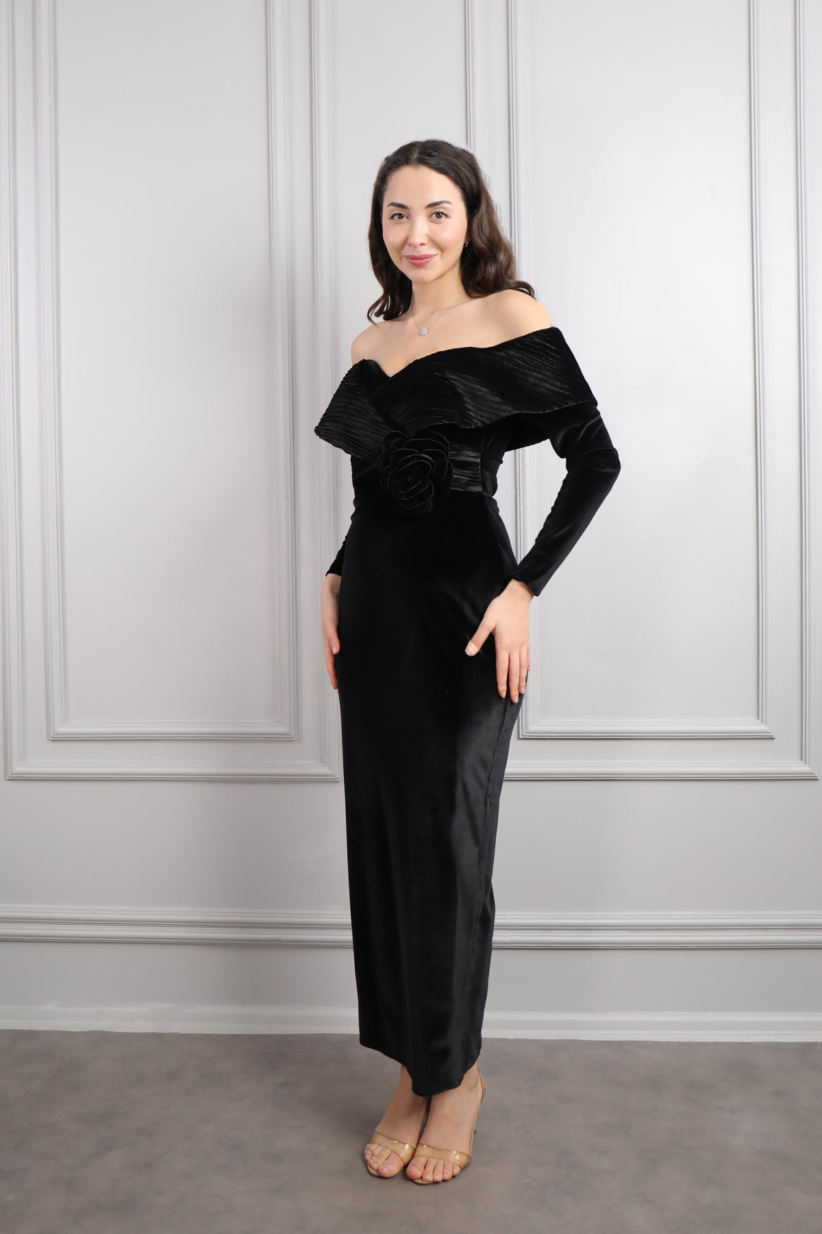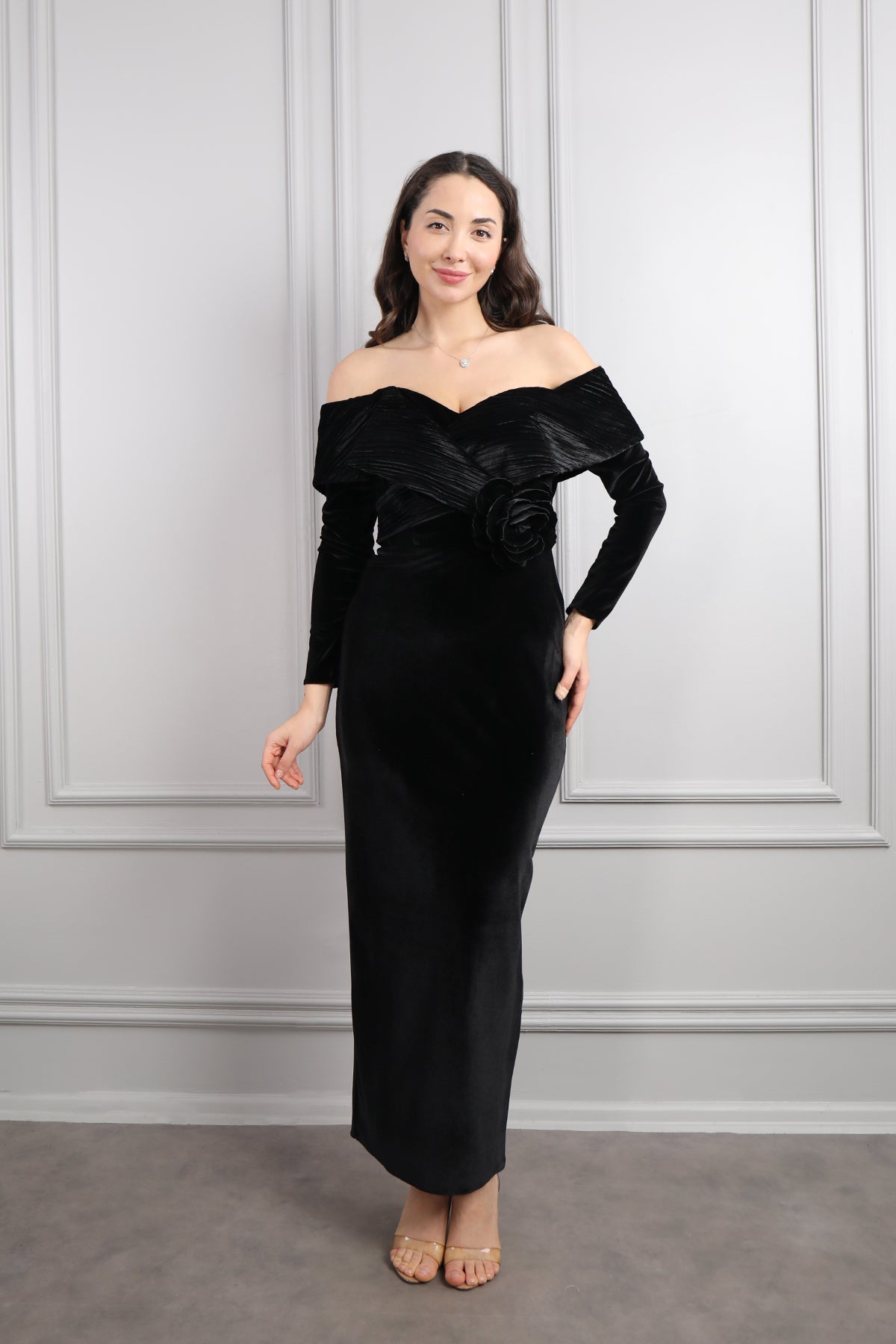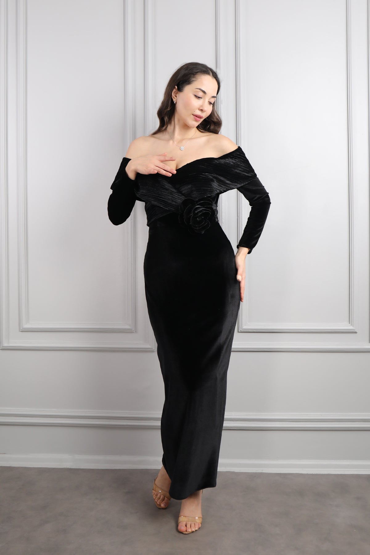 Kayık Yaka Beli Çiçek Detaylı Kadife Abiye Siyah