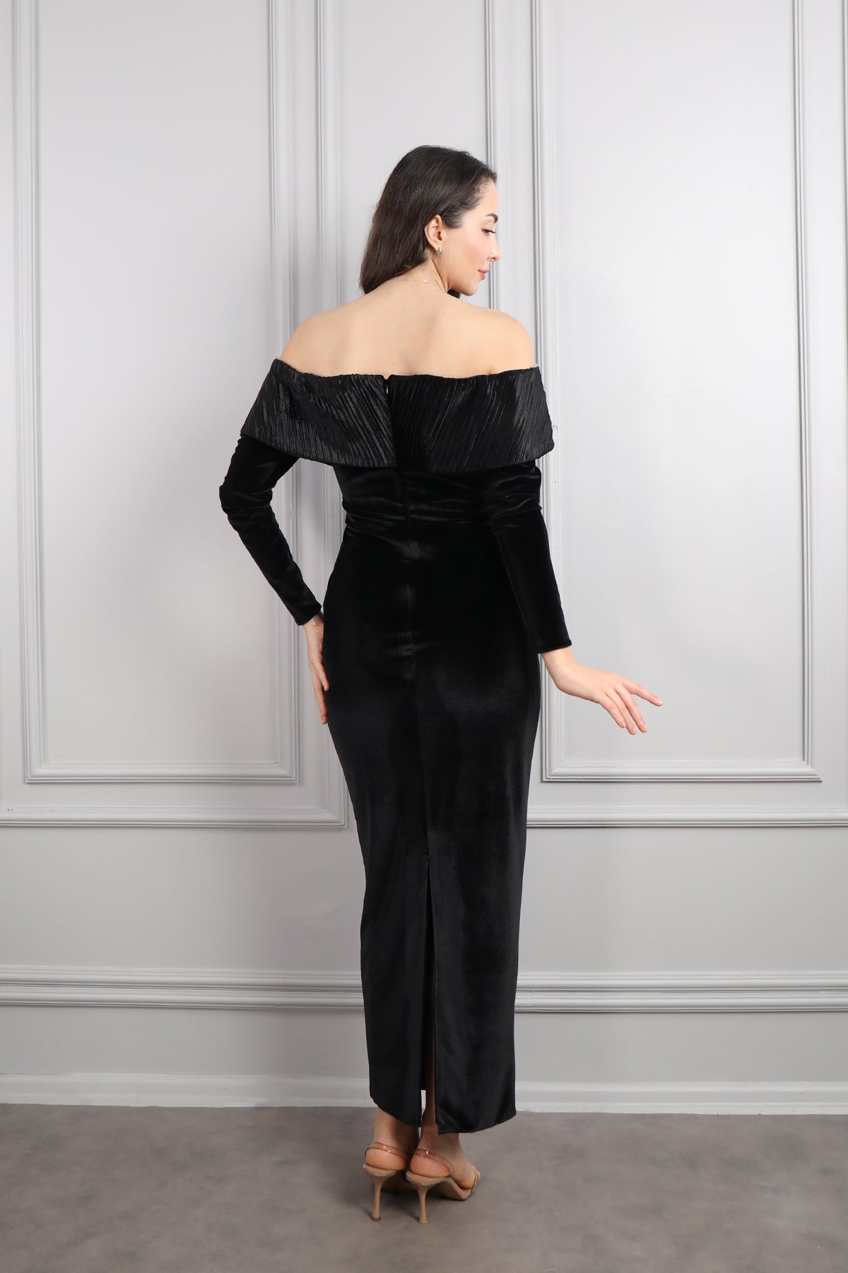 Kayık Yaka Beli Çiçek Detaylı Kadife Abiye Siyah Özellikleri