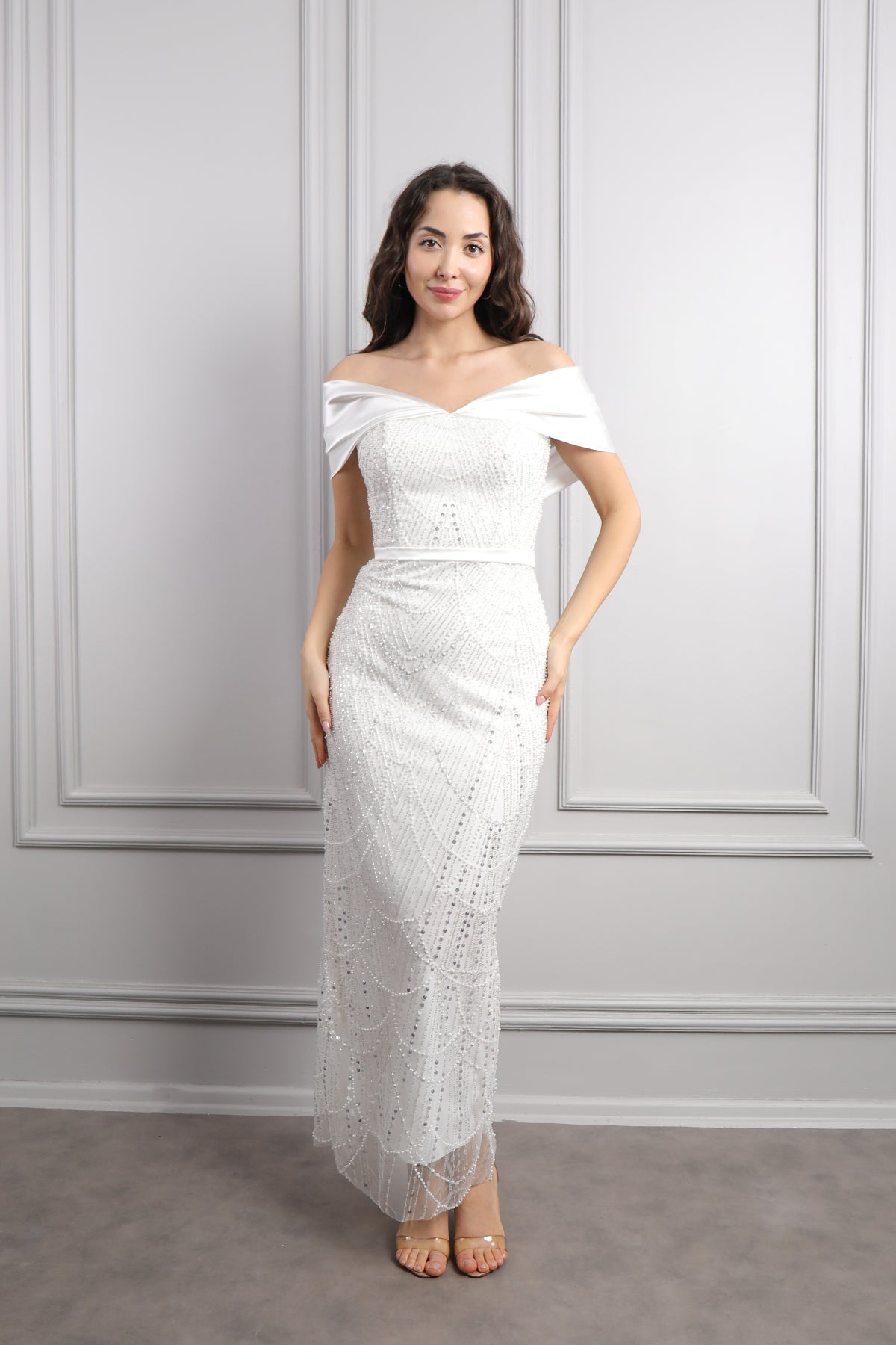 Kayık Yaka Boncuk İşlemeli Abiye Ekru