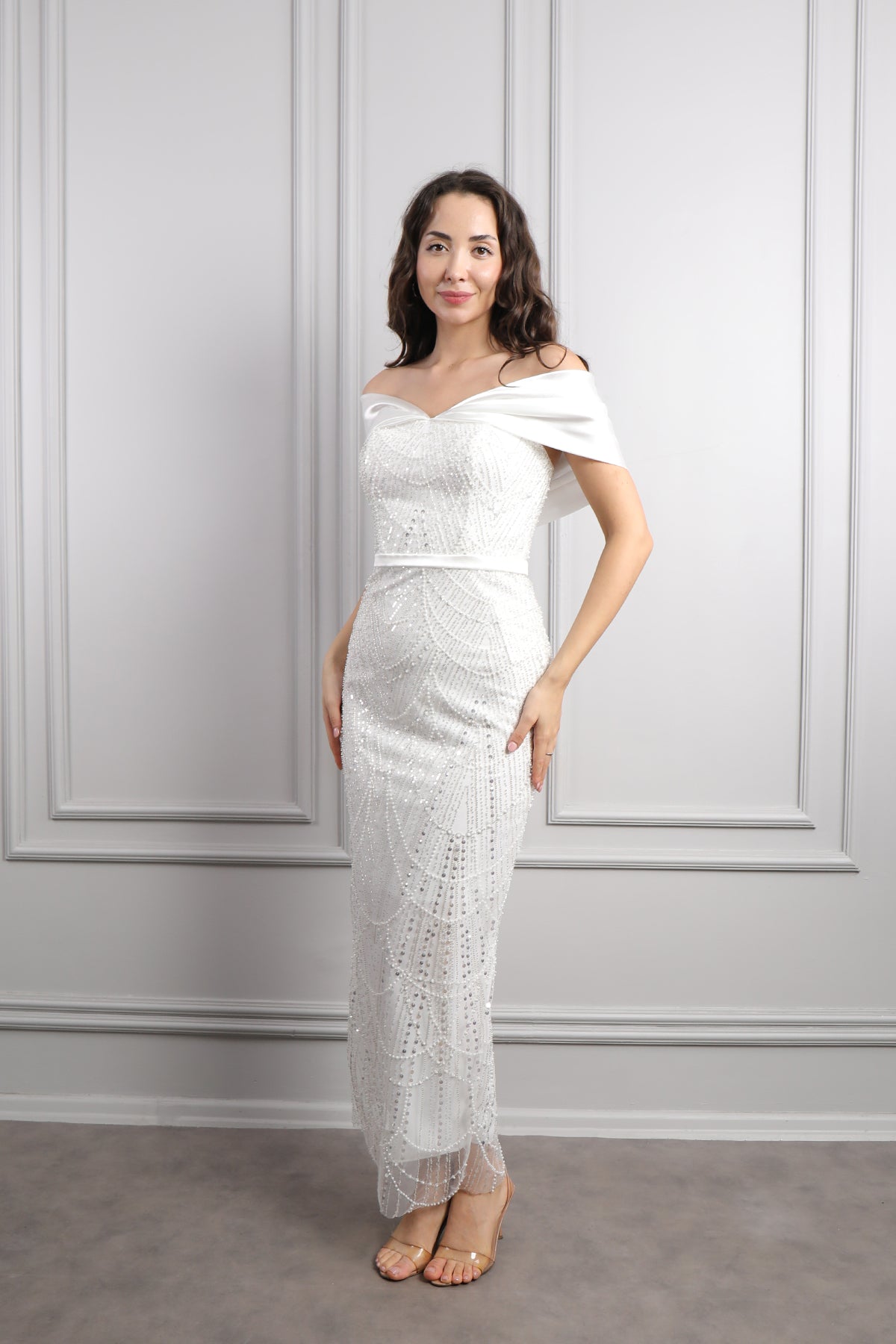 Kayık Yaka Boncuk İşlemeli Abiye Ekru Özellikleri