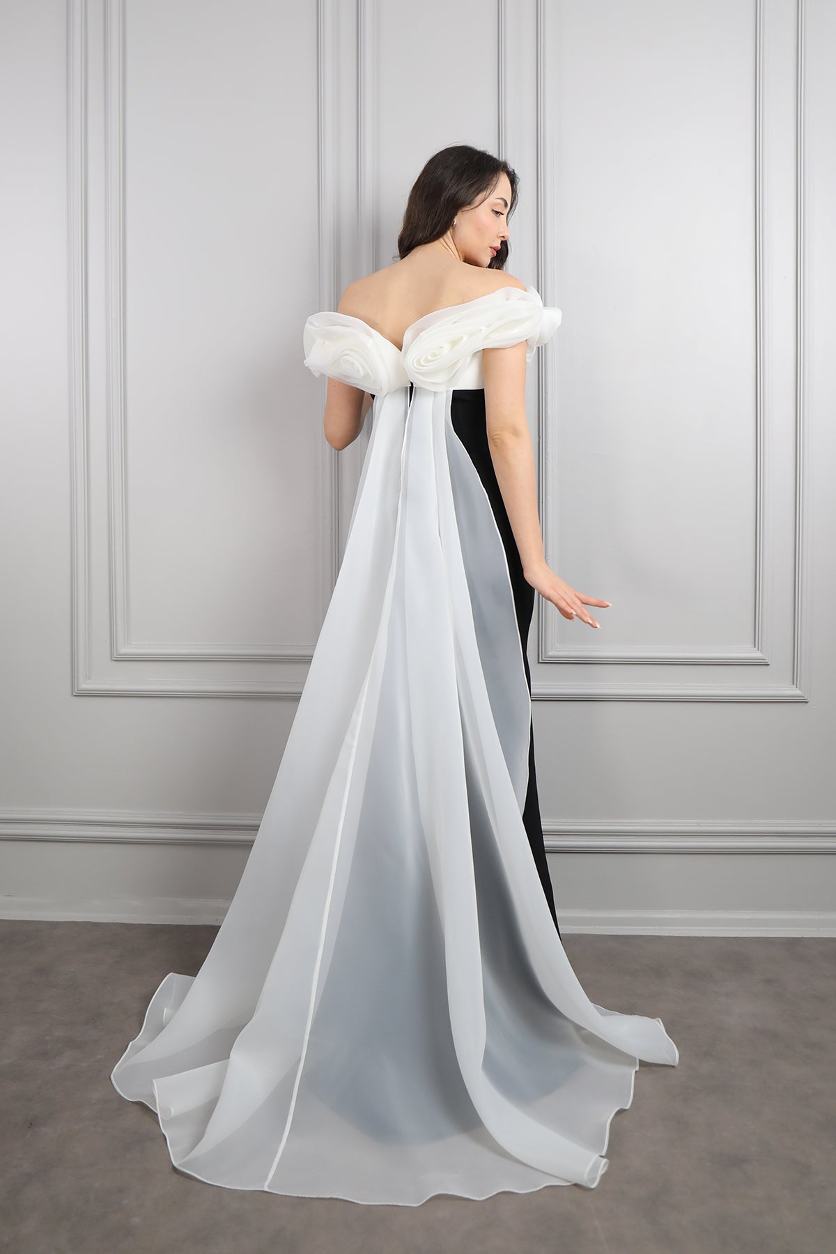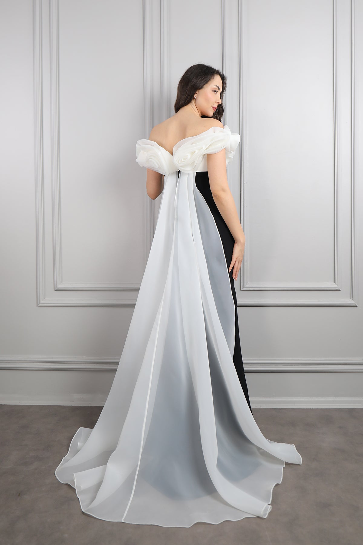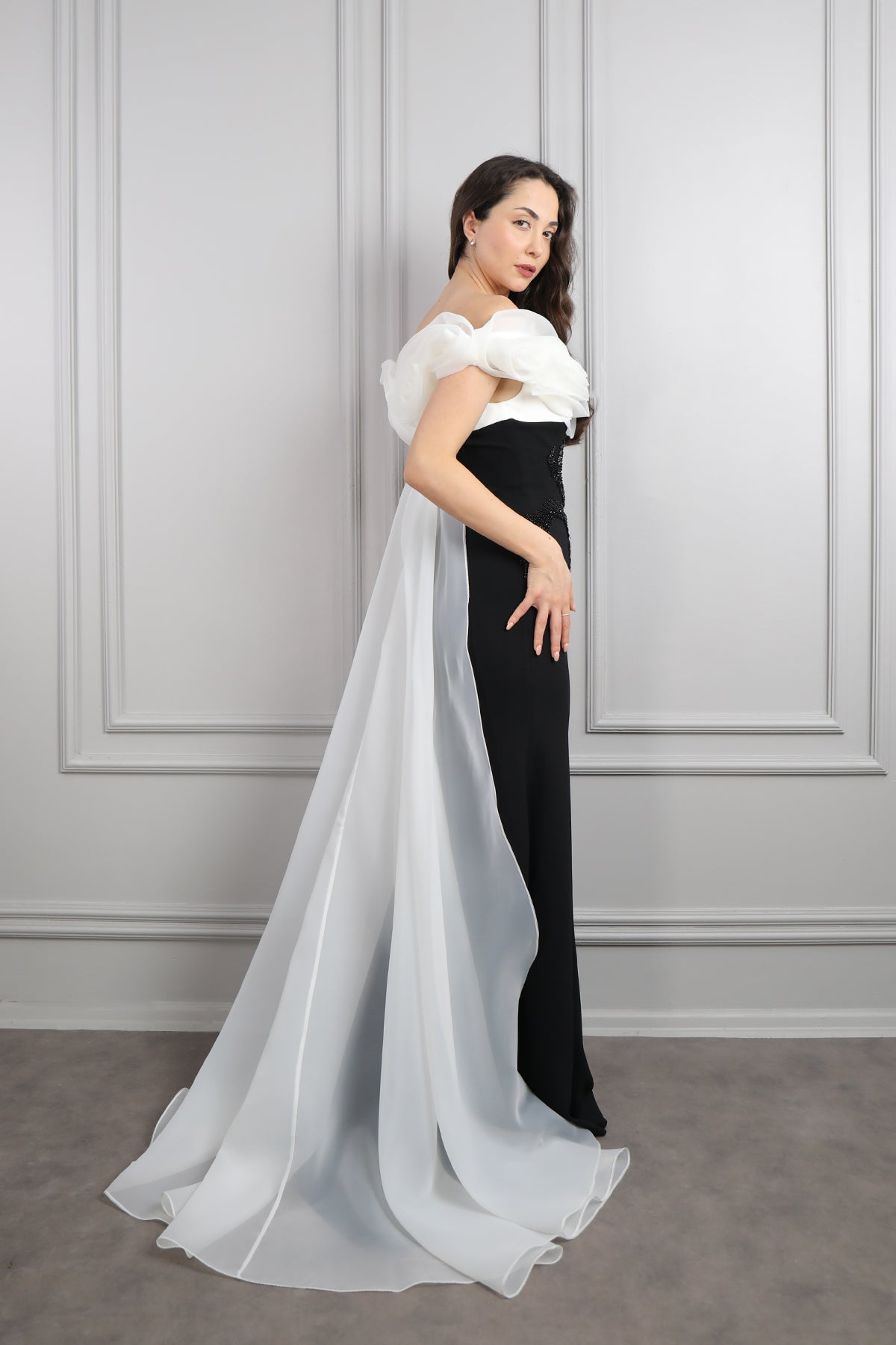 Kayık Yaka Boncuk İşlemeli Sırtı Pelerin Detaylı Abiye Siyah Özellikleri