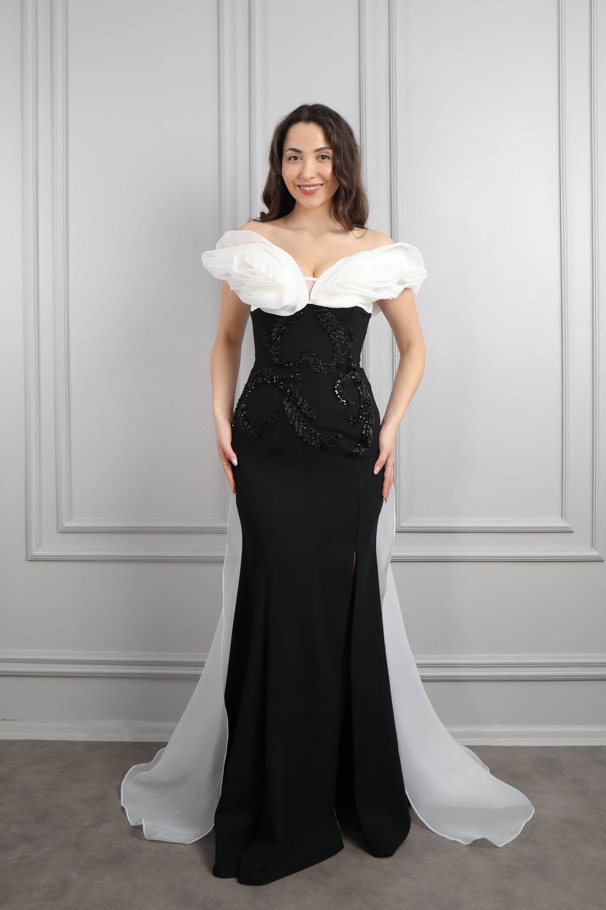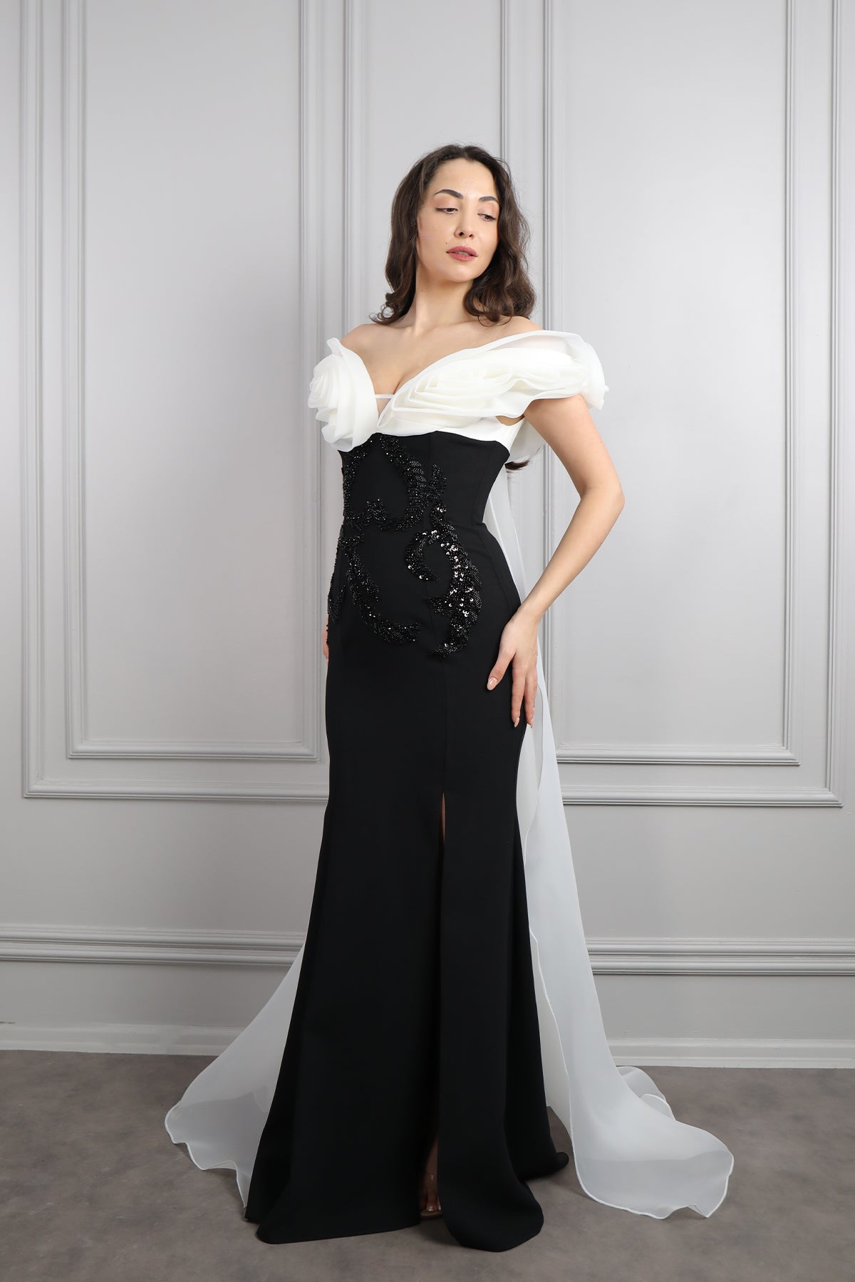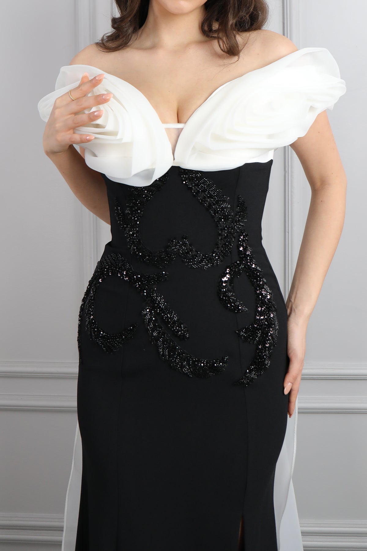 Modelin üzerindeki abiye 38 bedendir. Ürün tam kalıptır, kendi bedeninizi almanızı öneririz.