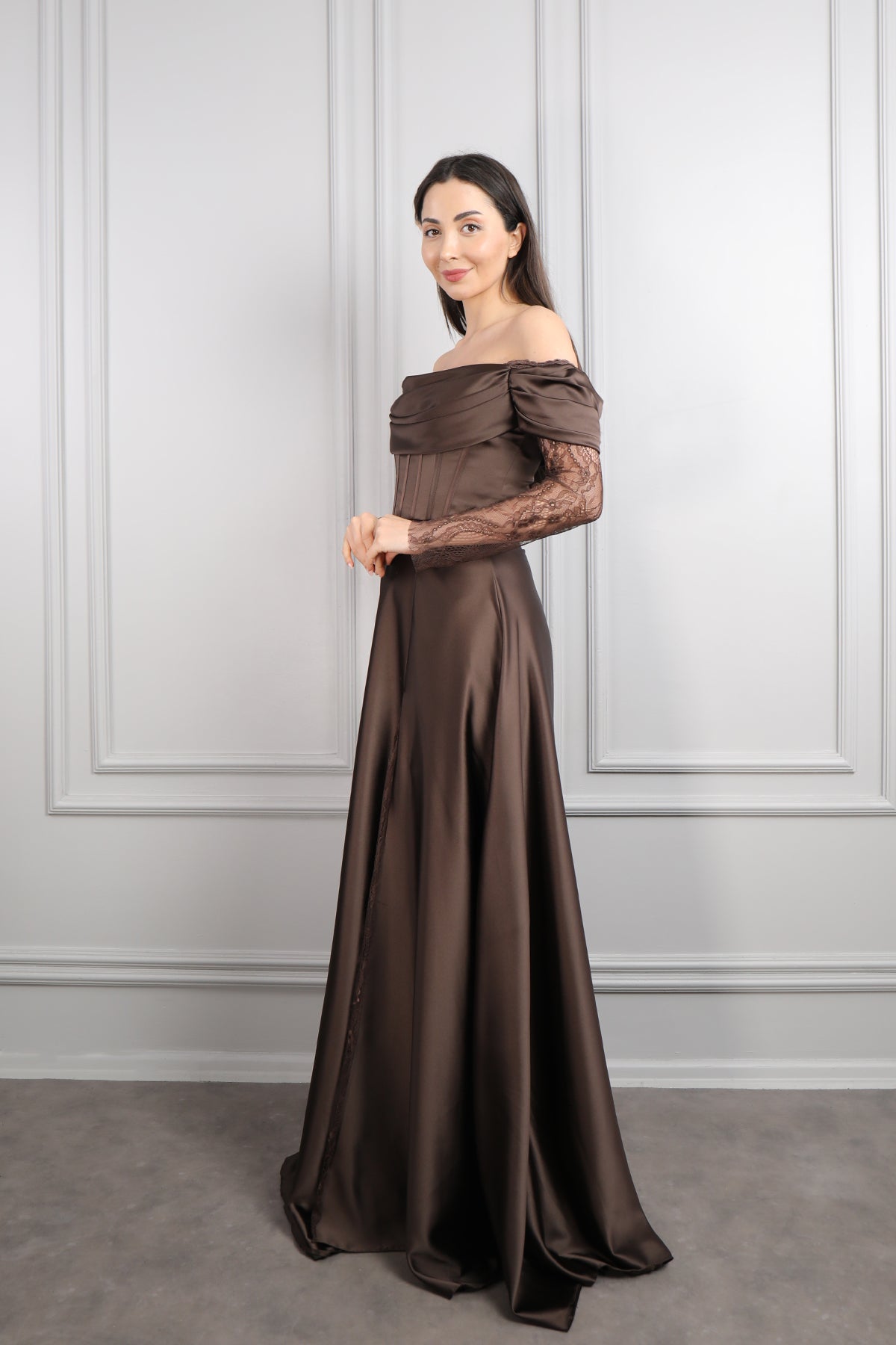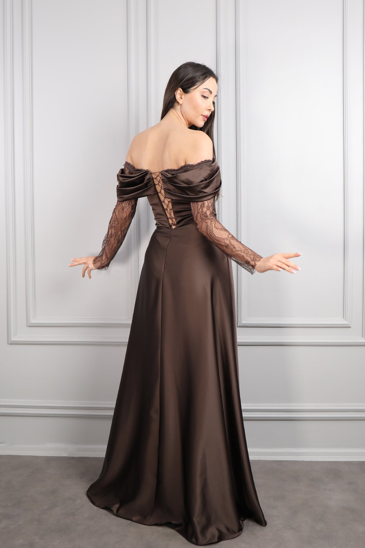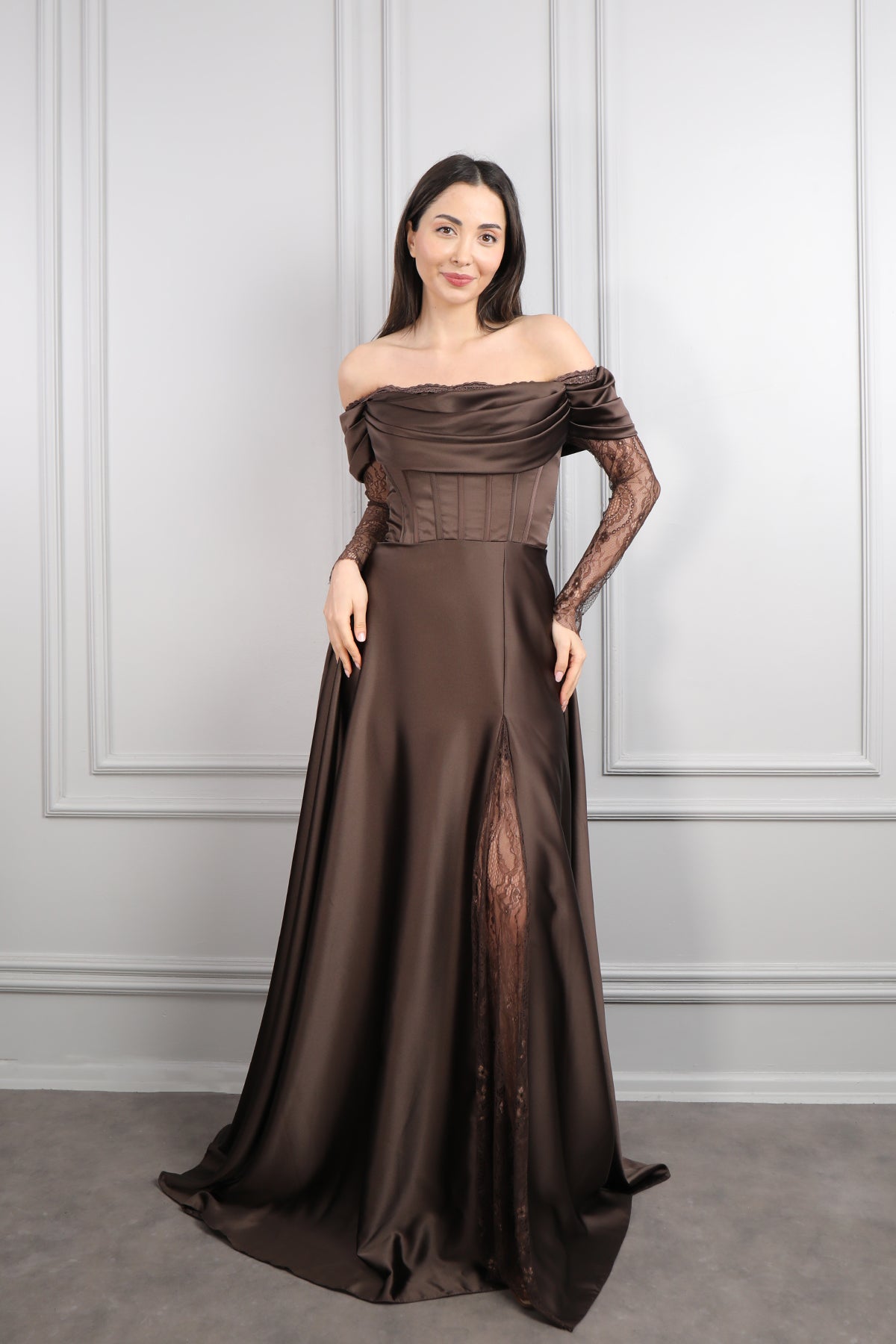 Kayık Yaka Dantel Detaylı Drapeli Saten Abiye Kahve