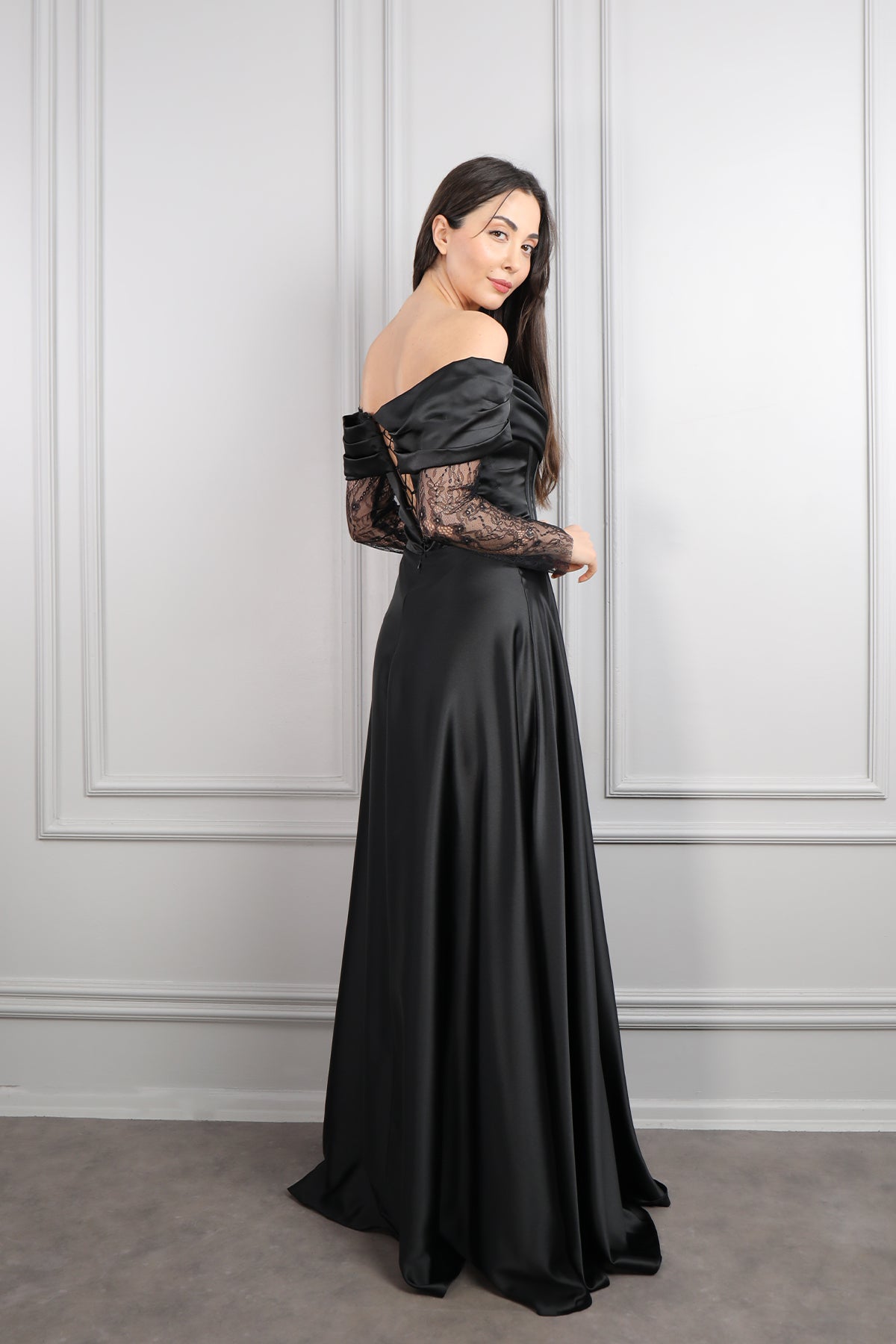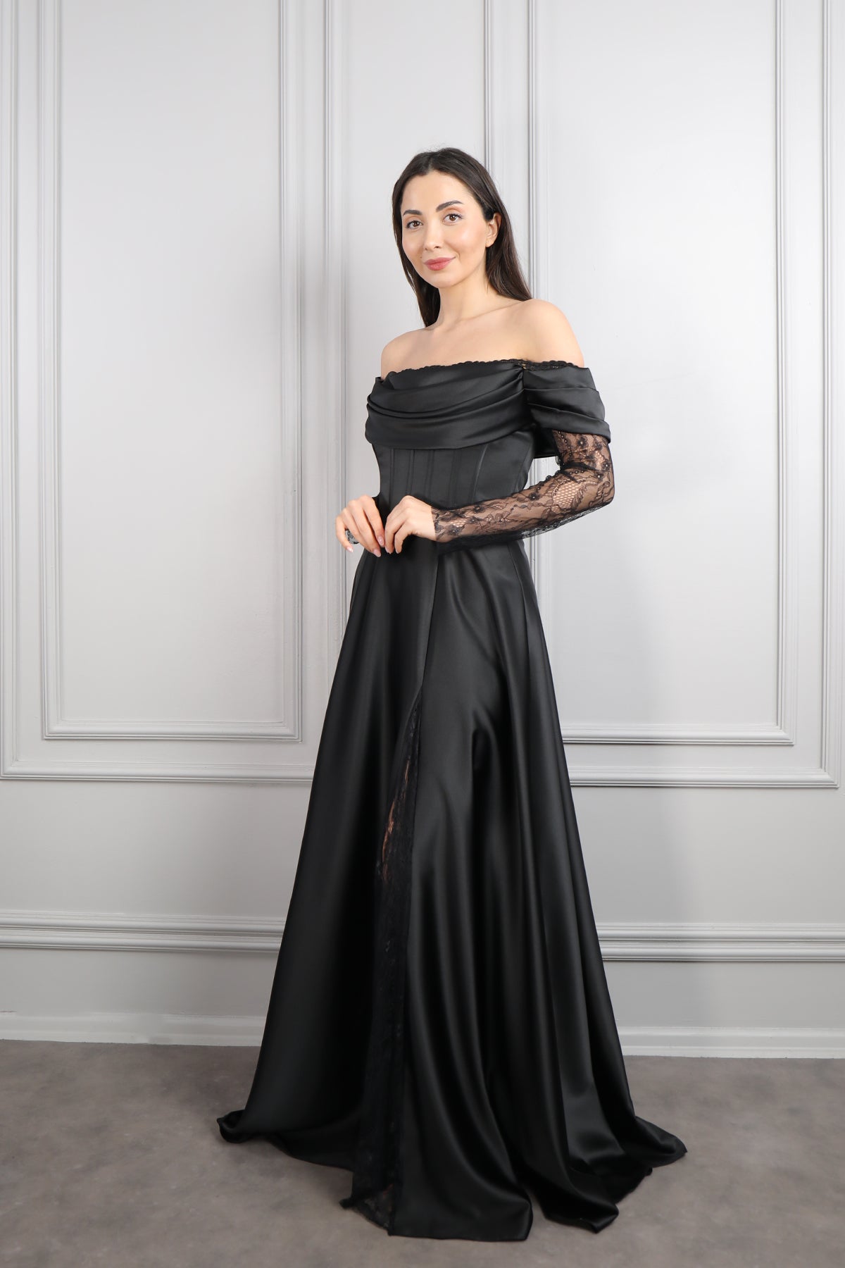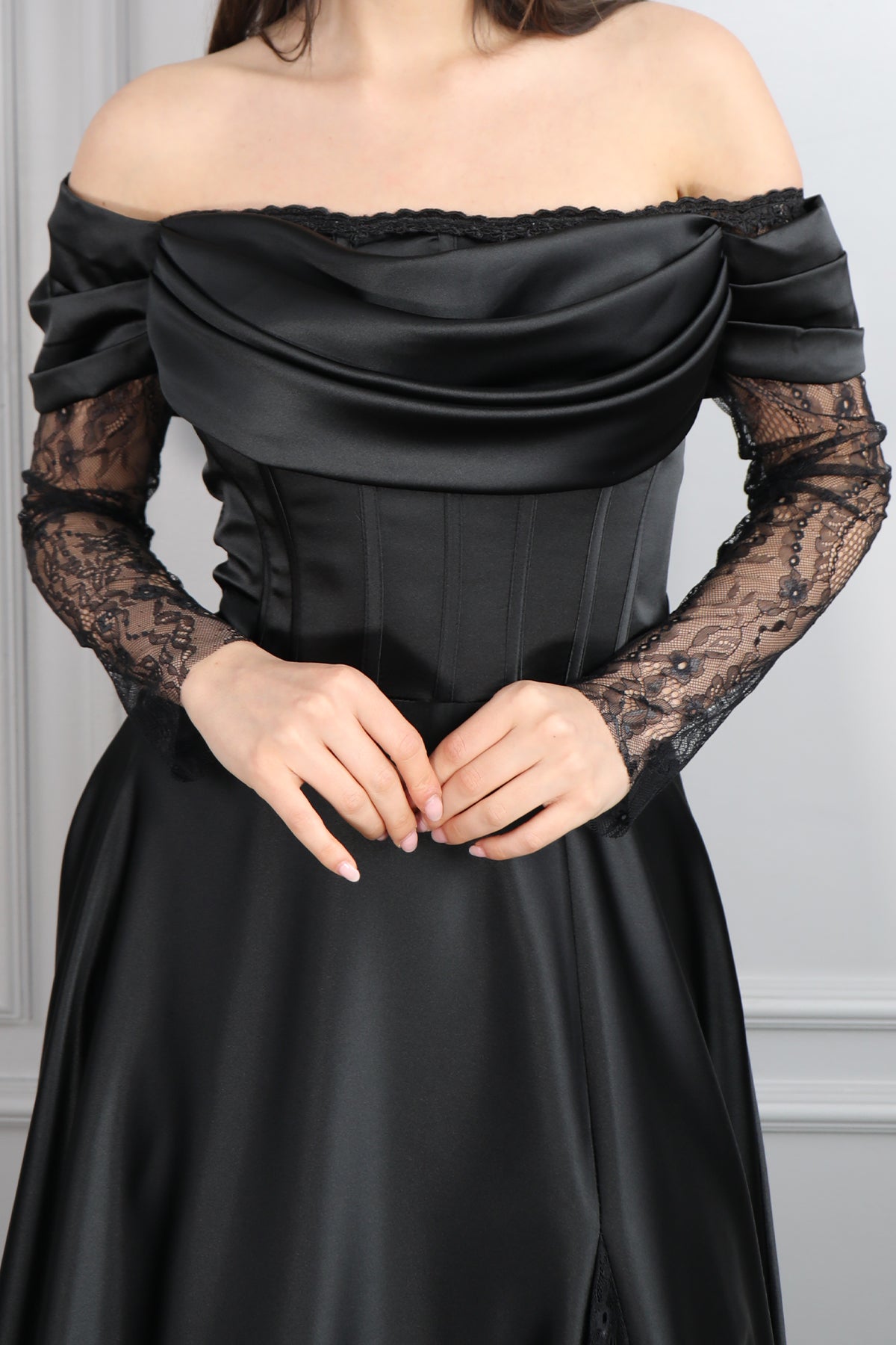 Kayık Yaka Dantel Detaylı Drapeli Saten Abiye Siyah Özellikleri