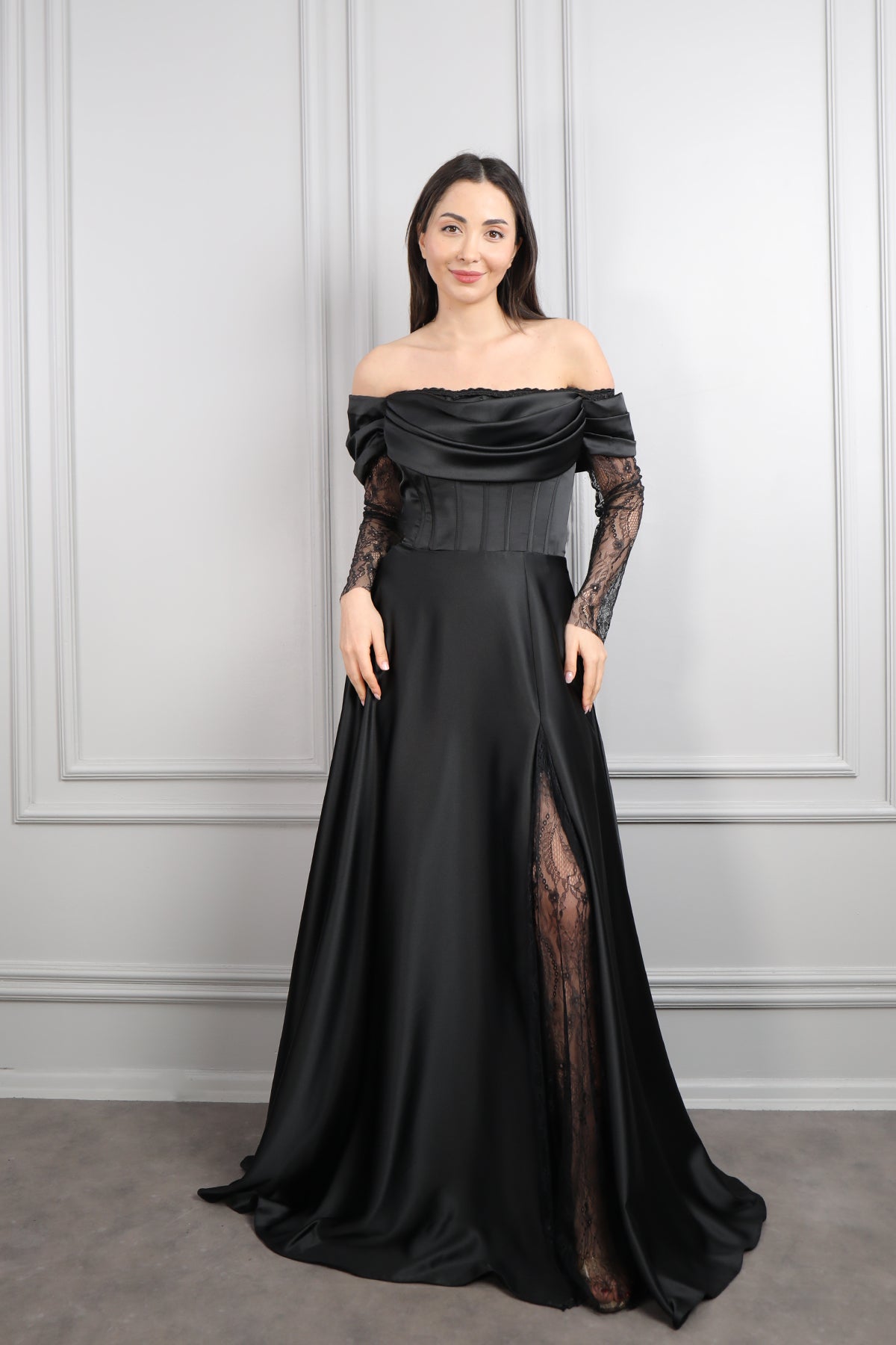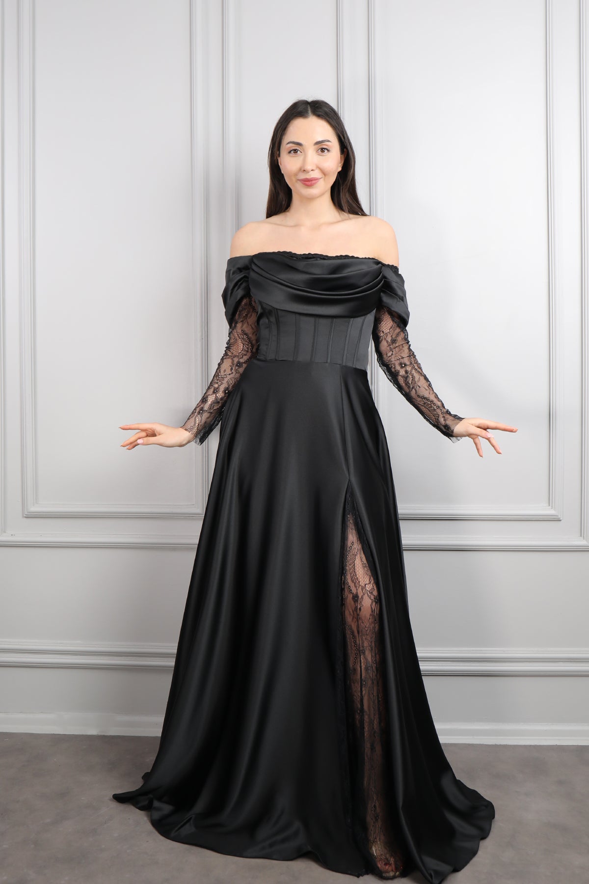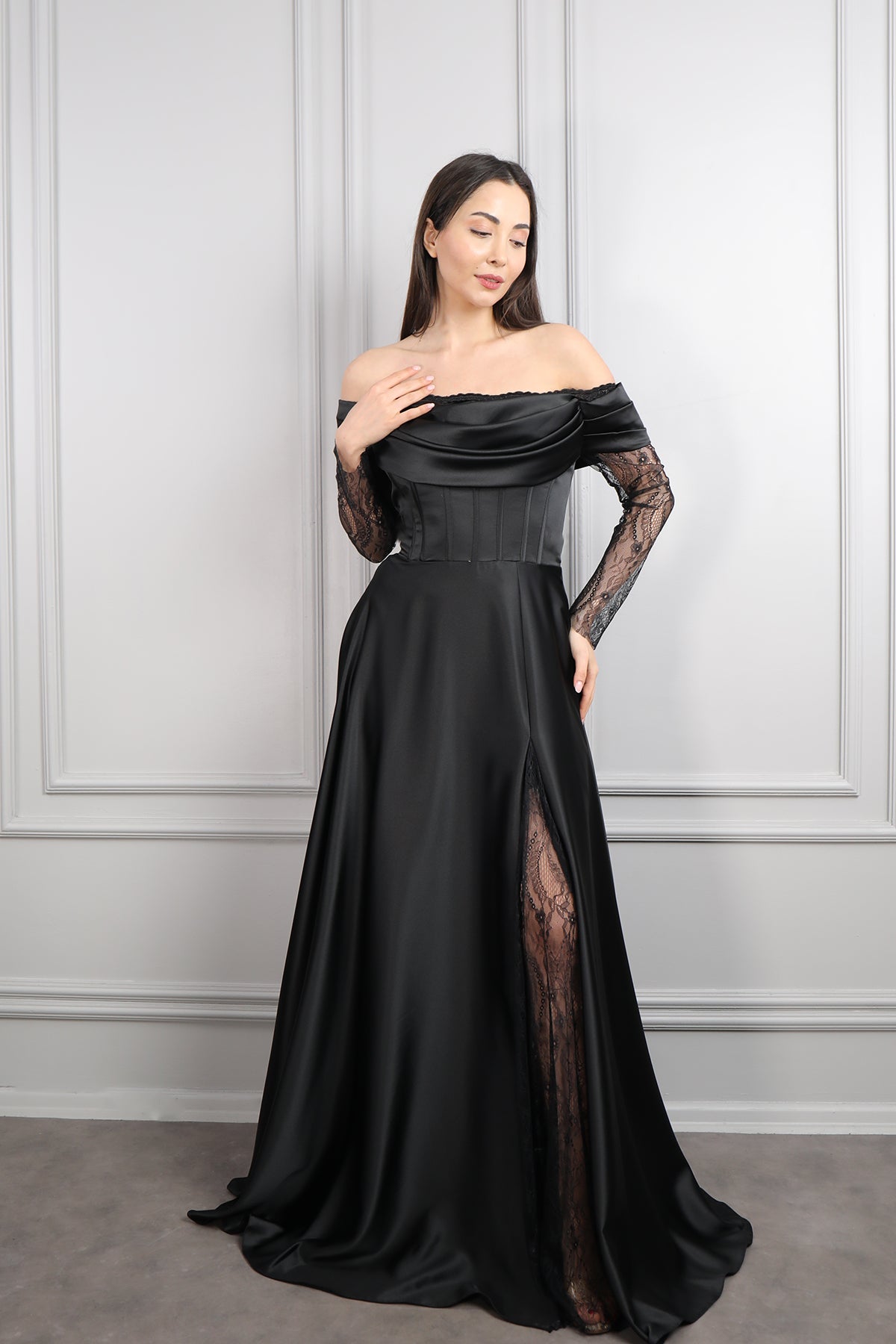 Kayık Yaka Dantel Detaylı Drapeli Saten Abiye Siyah Özellikleri