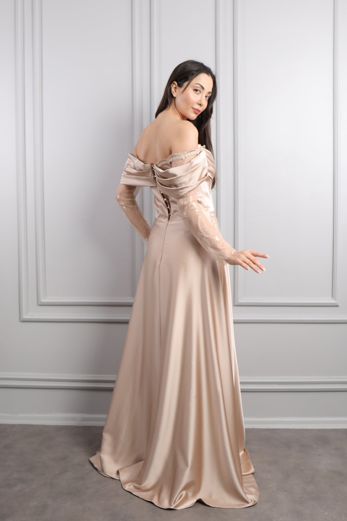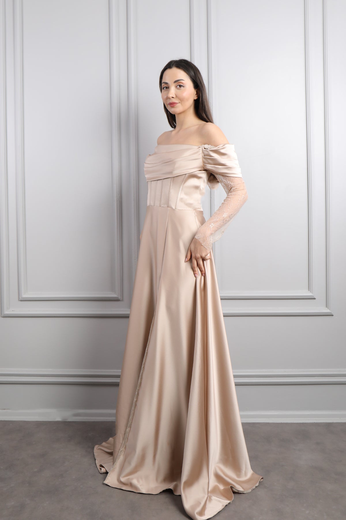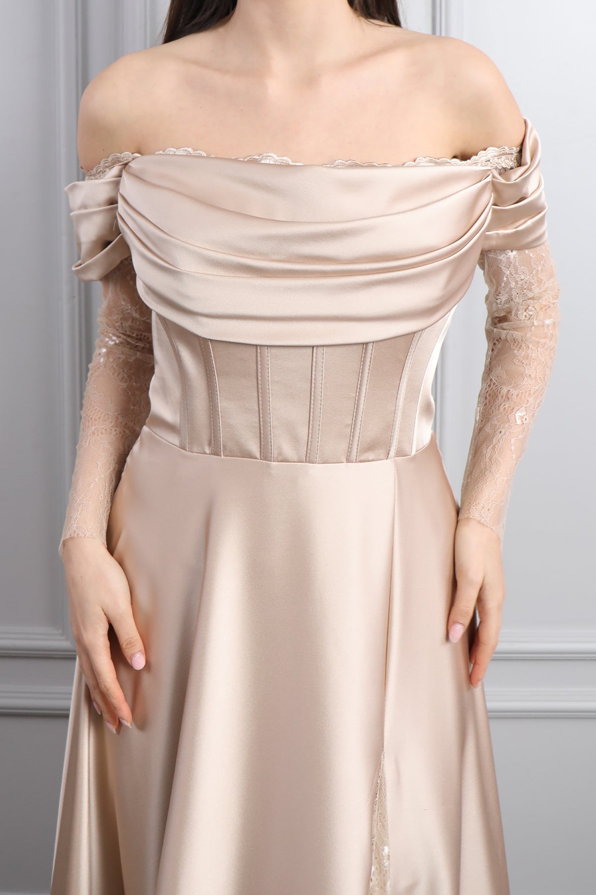 Kayık Yaka Dantel Detaylı Drapeli Saten Abiye Vizon