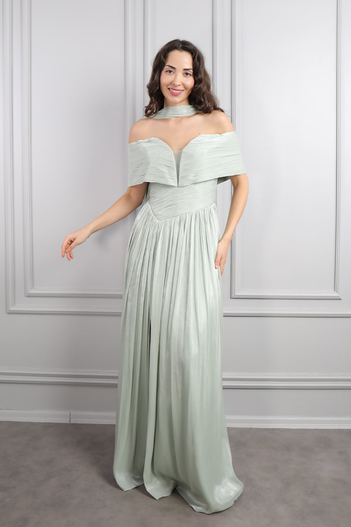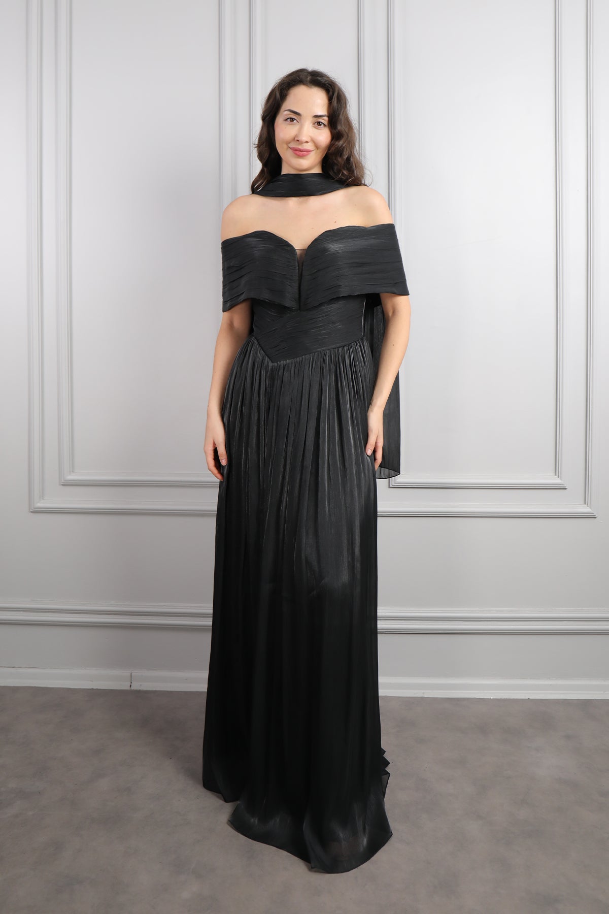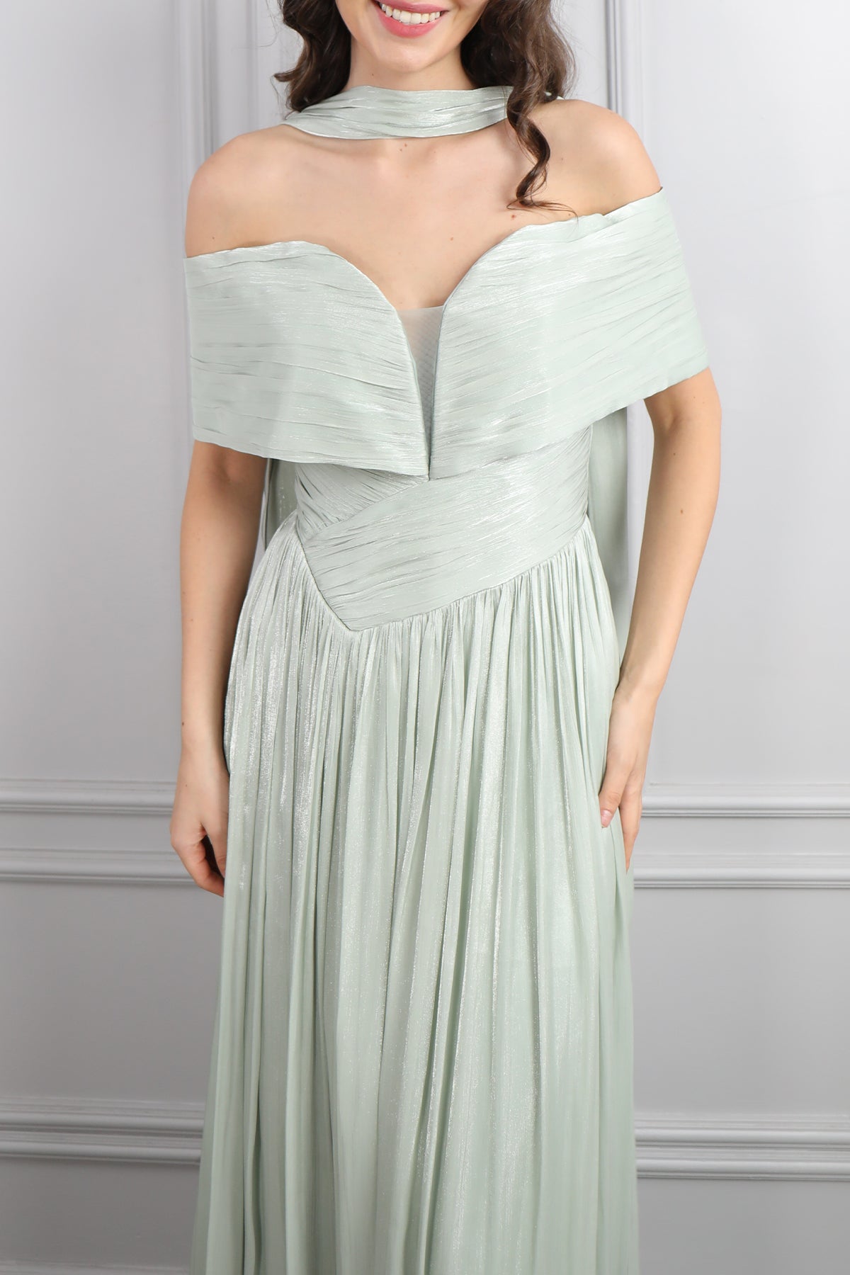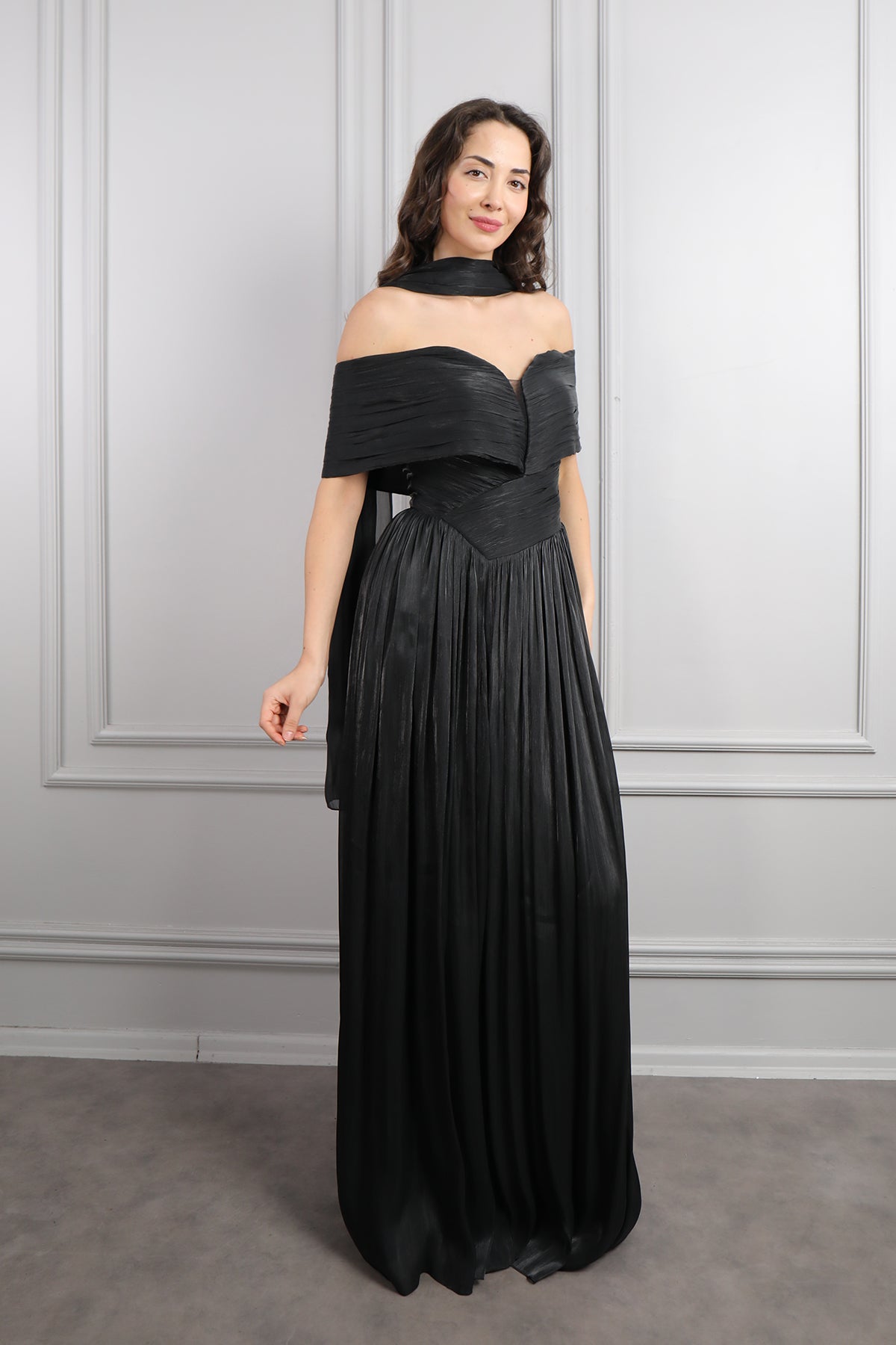 Kayık Yaka Derin Dekolteli Fular Detaylı Şifon Abiye