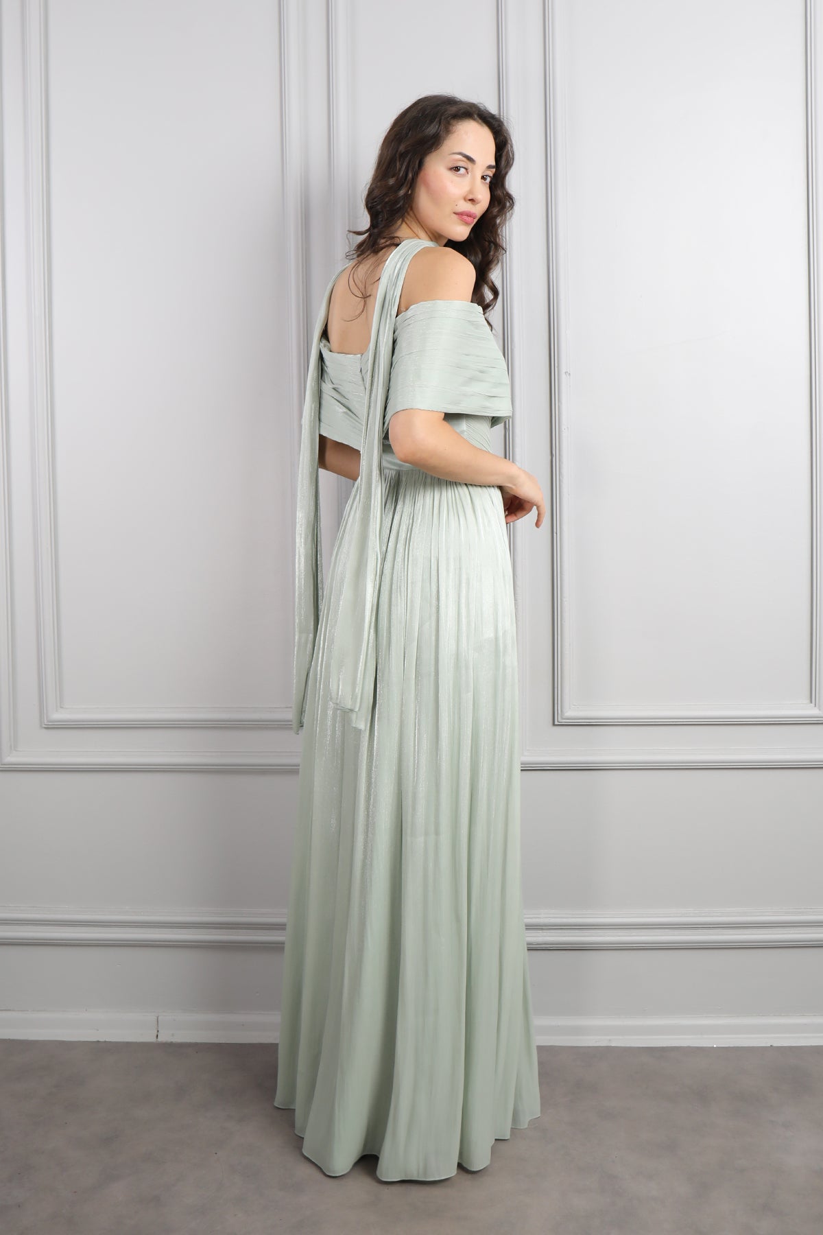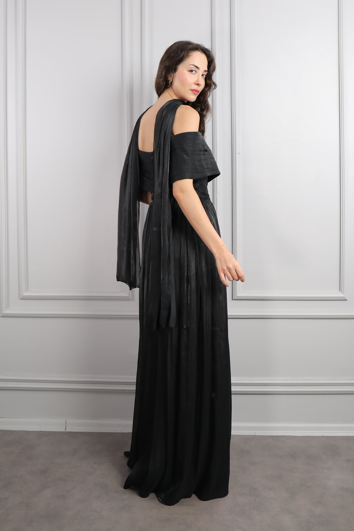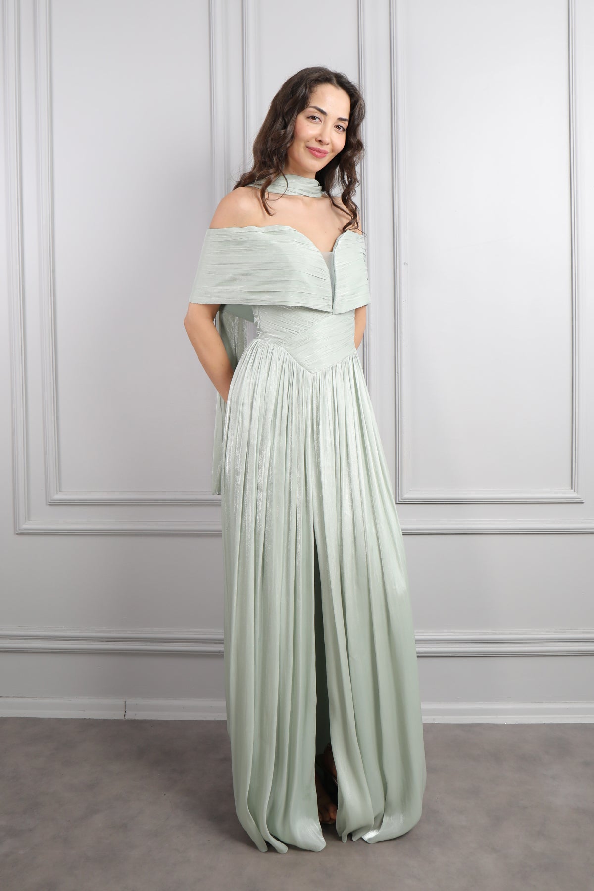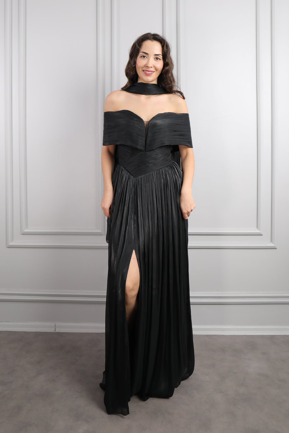 Kayık Yaka Derin Dekolteli Fular Detaylı Şifon Abiye