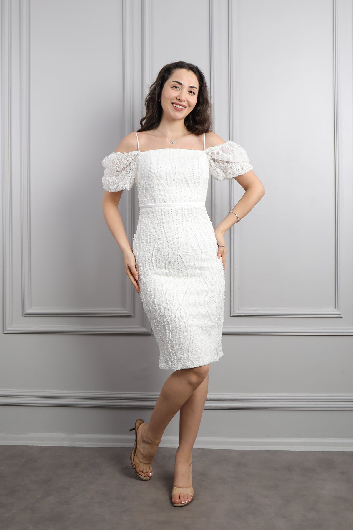 Kayık Yaka İnce Askılı Boncuk İşlemeli Kısa Abiye Ekru