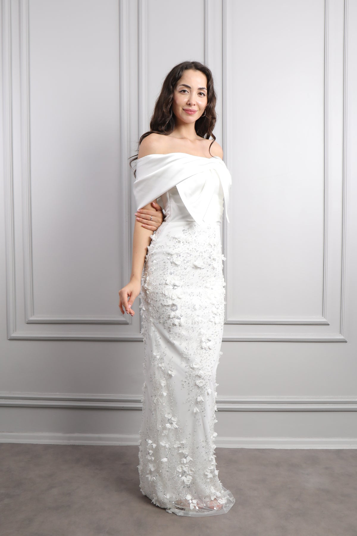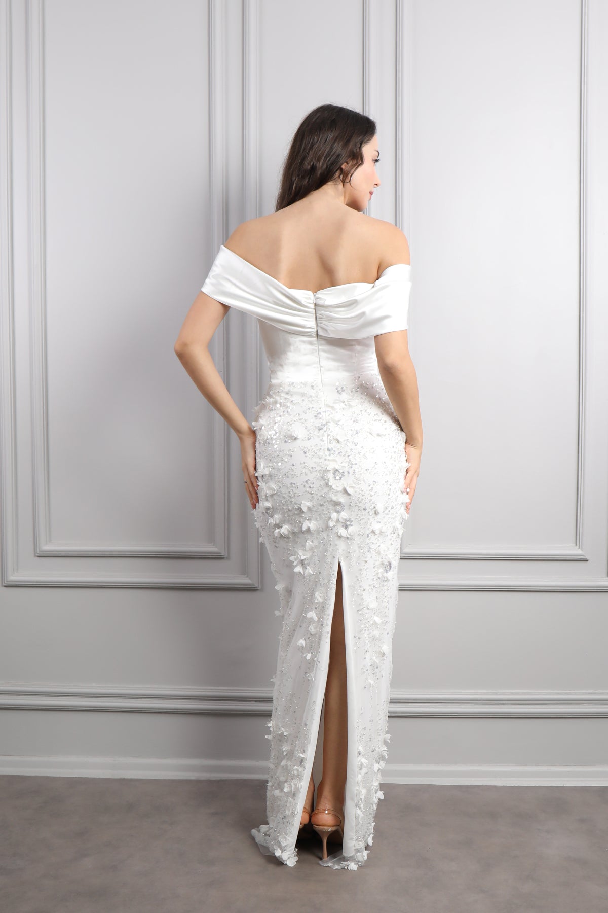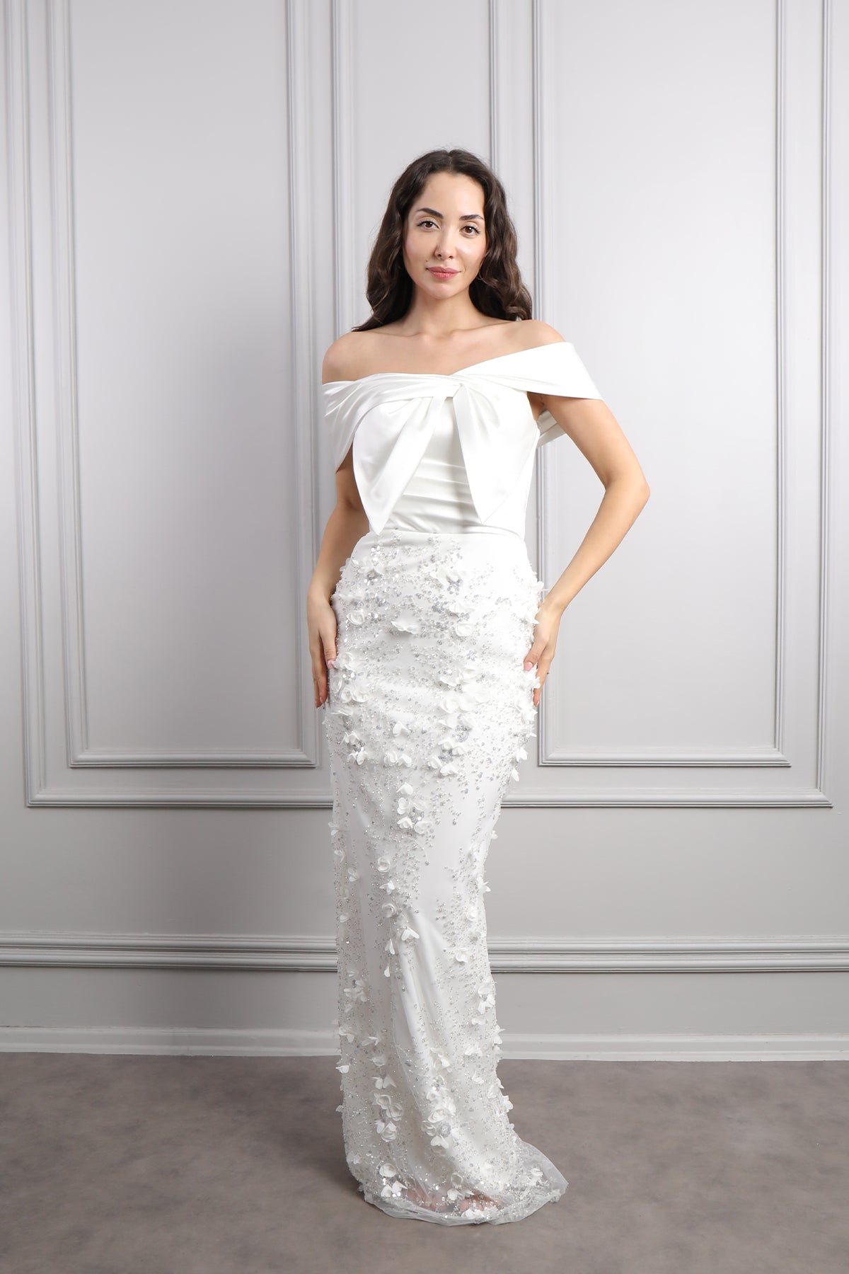 Kayık Yaka Önü Fiyonk Görünümlü Çiçek Detaylı Abiye Kemik