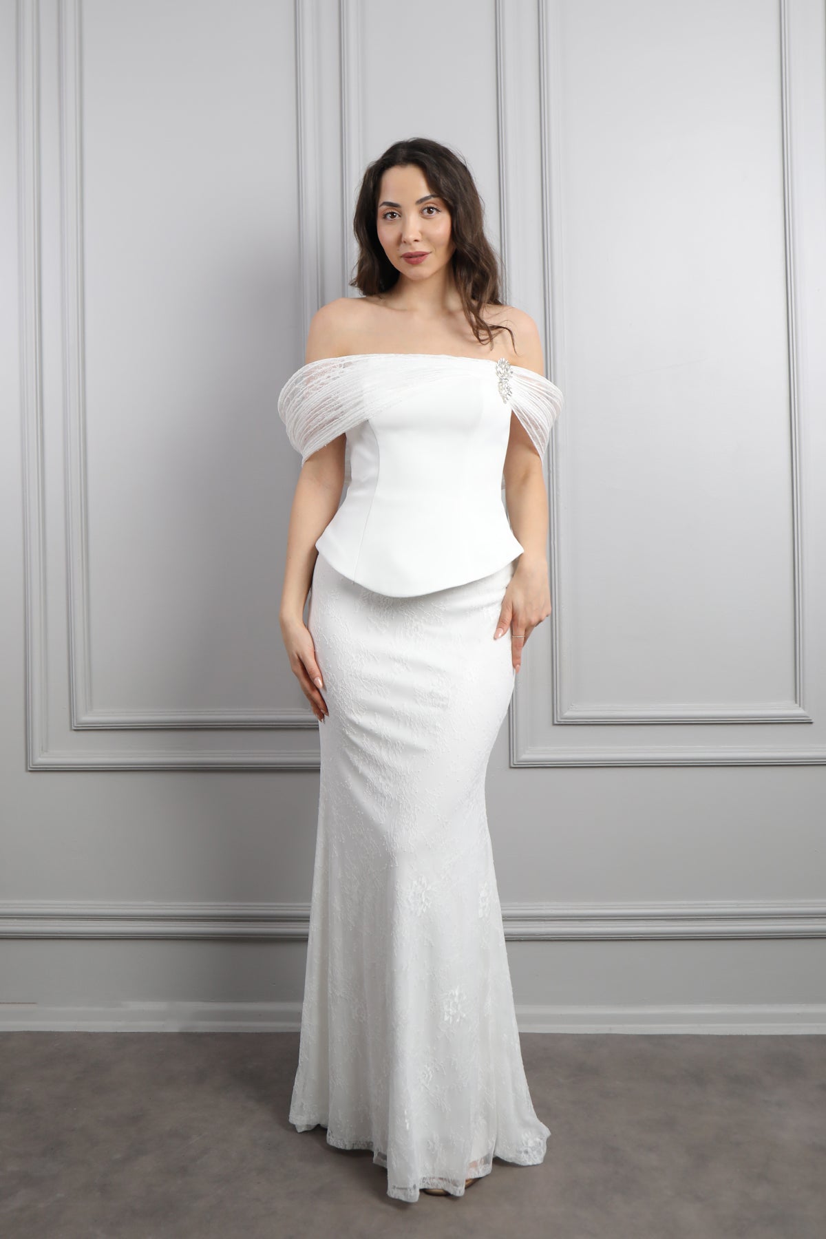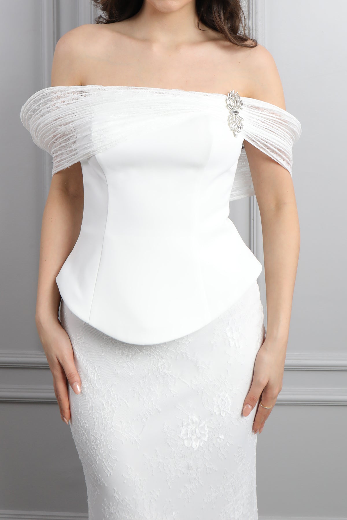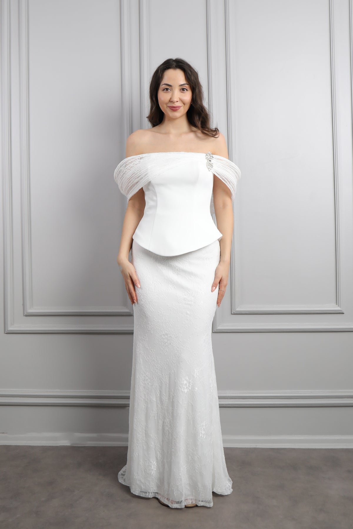 Kayık Yaka Taş Deatylı Dantelli Balık Model Abiye Krem