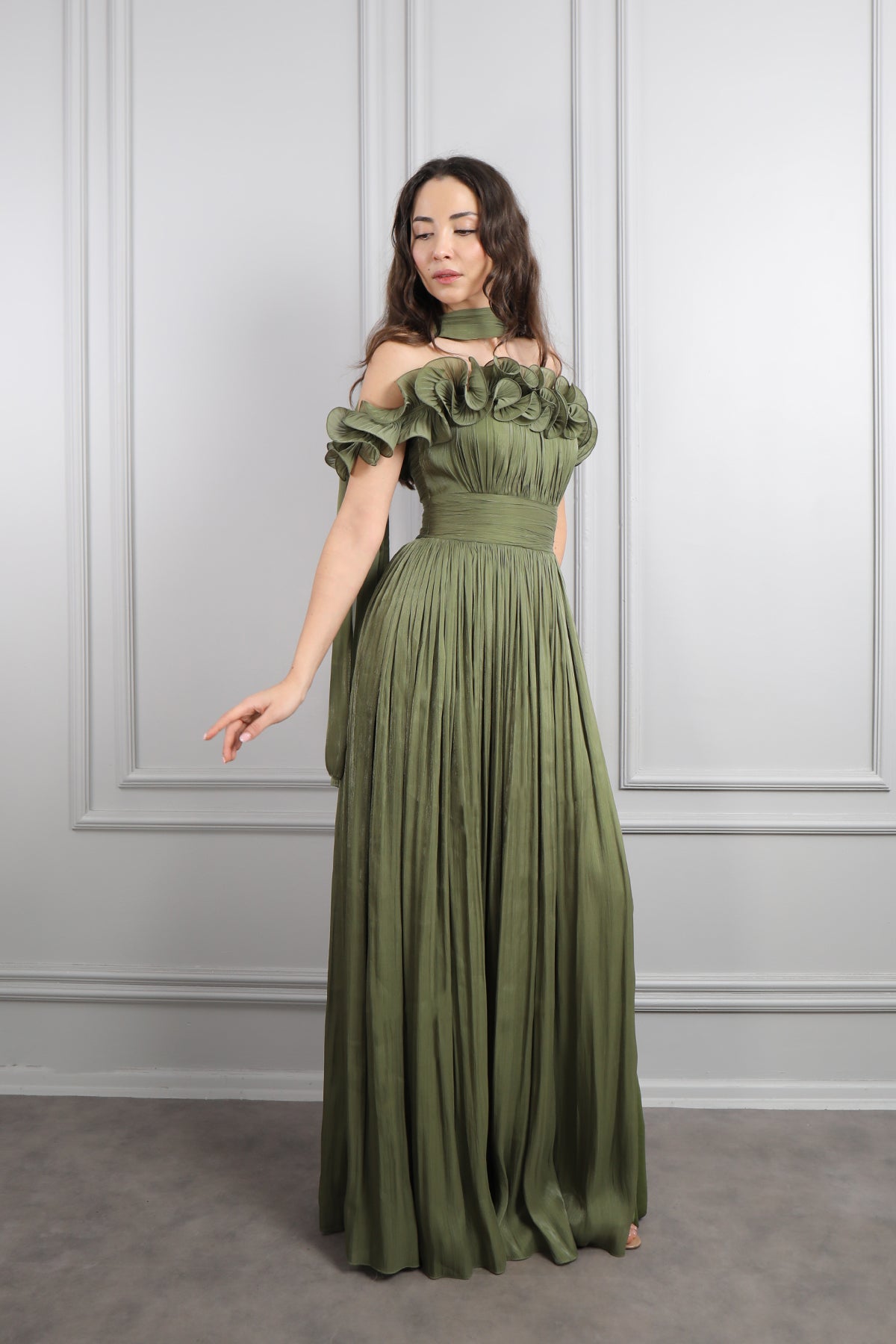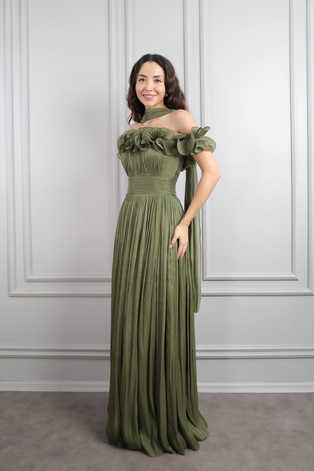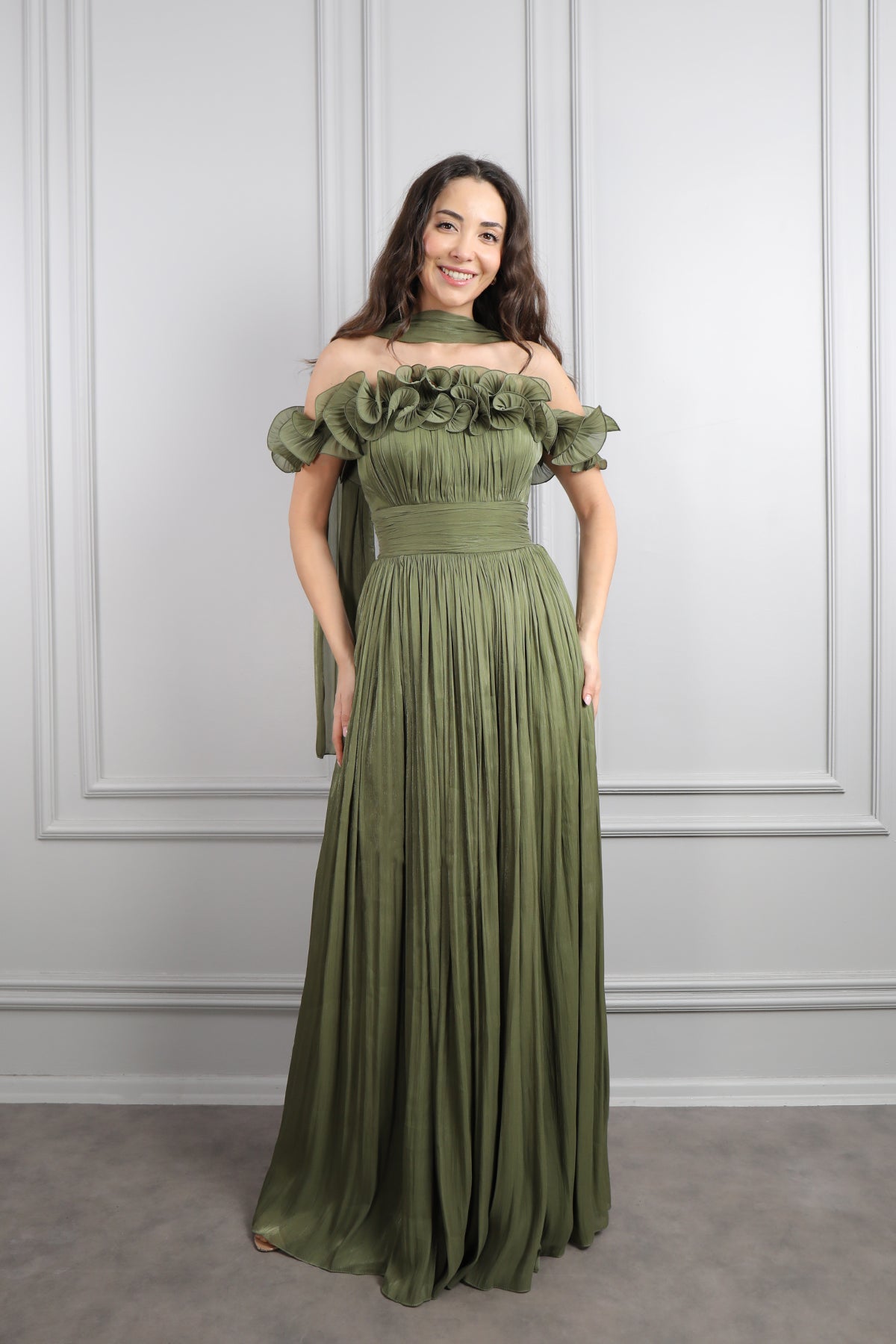 Kayık Yaka Volanlı Fular Detaylı Şifon Abiye Haki